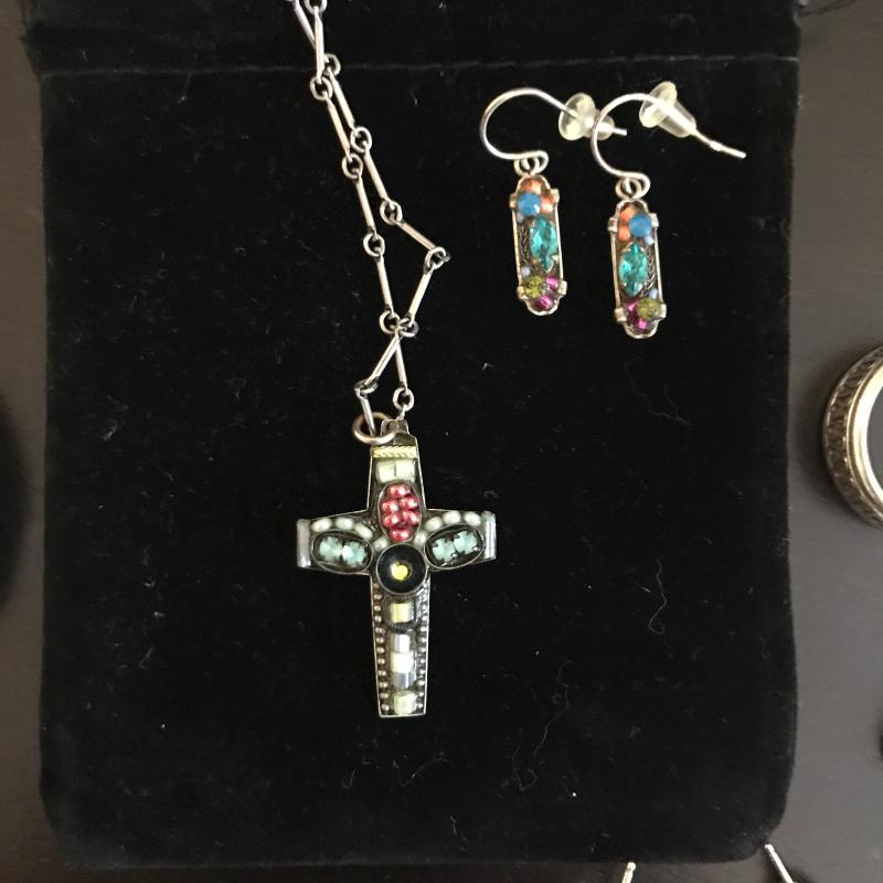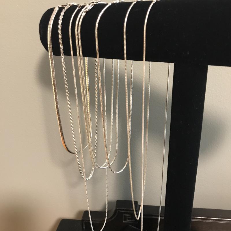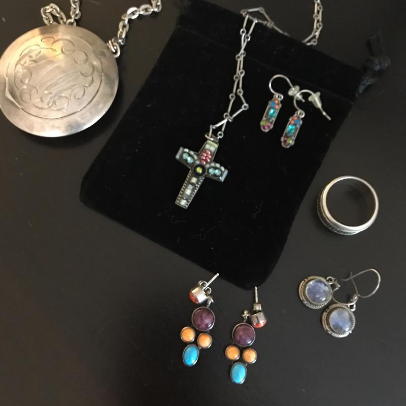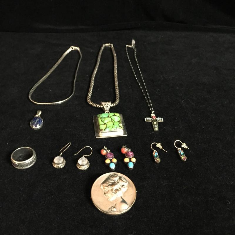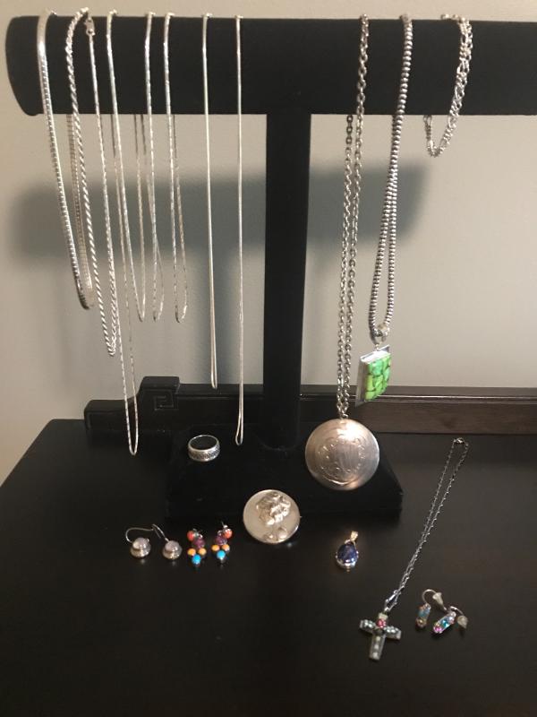 A large lovely lot of Sterling Jewelry includes pendants, necklaces, rings and earrings. Many pieces are marked sterling. Ring is a size 9,5.