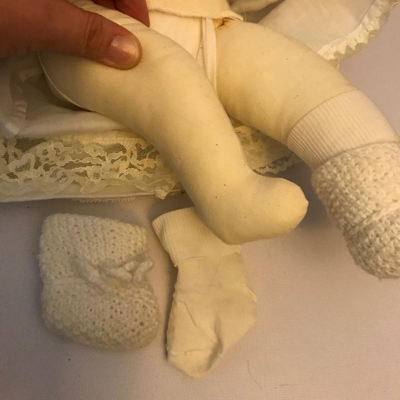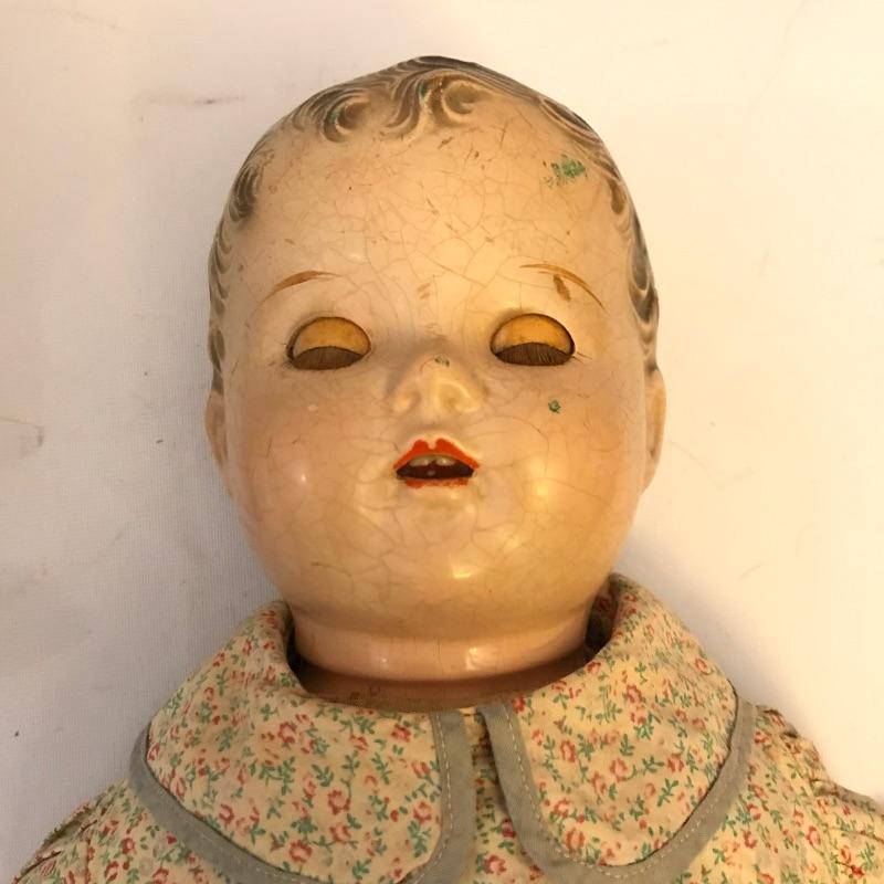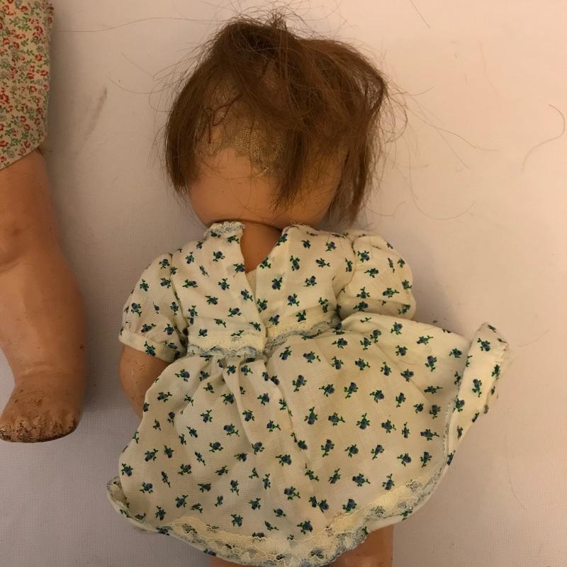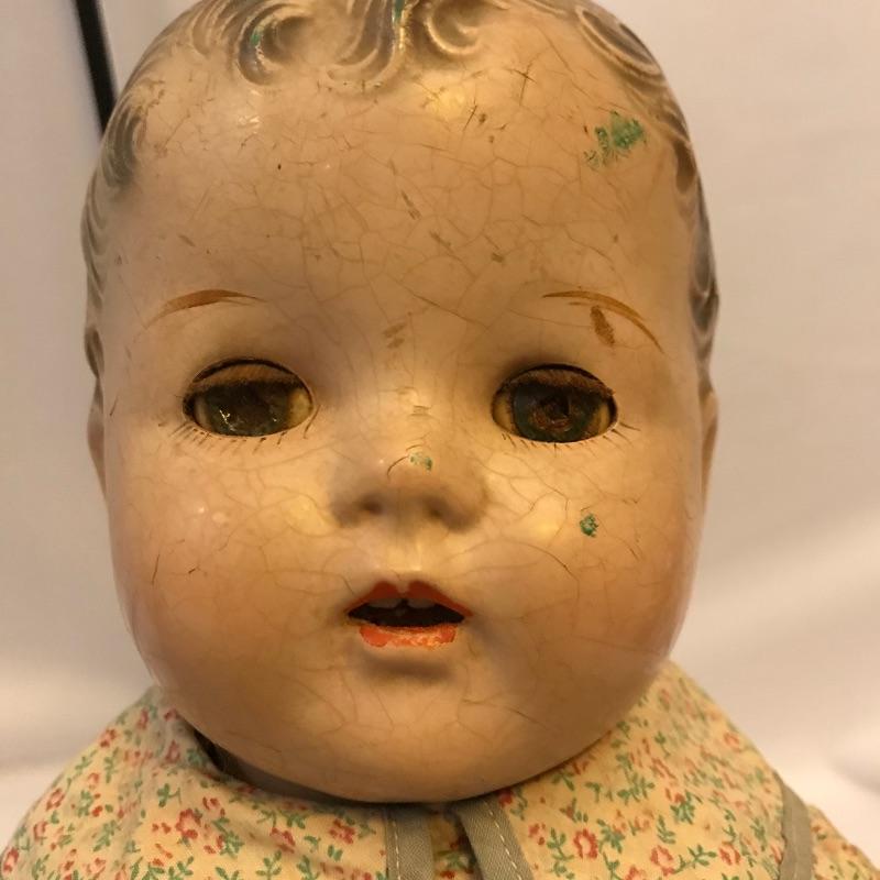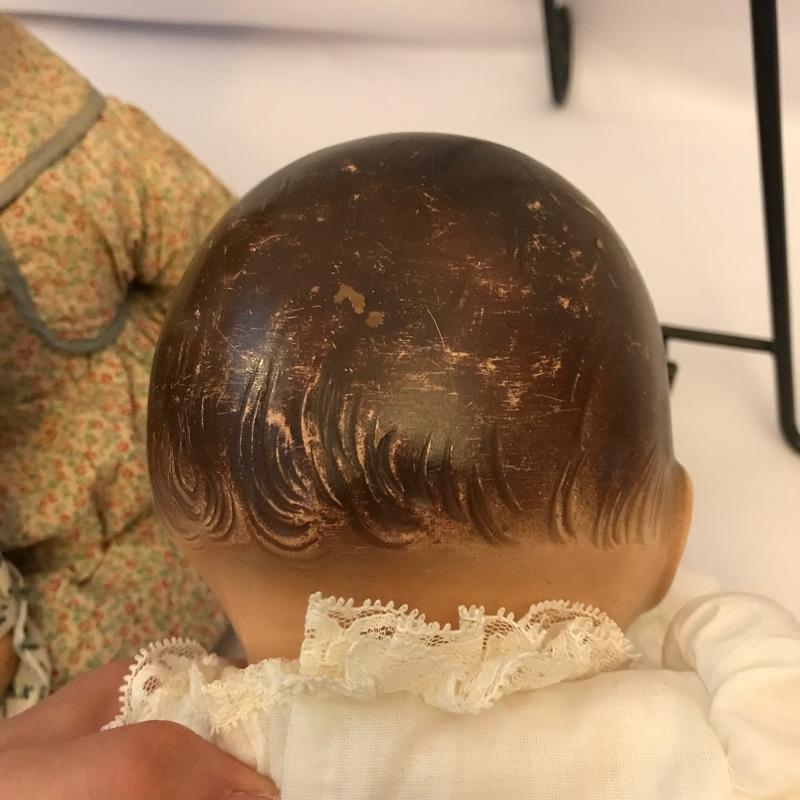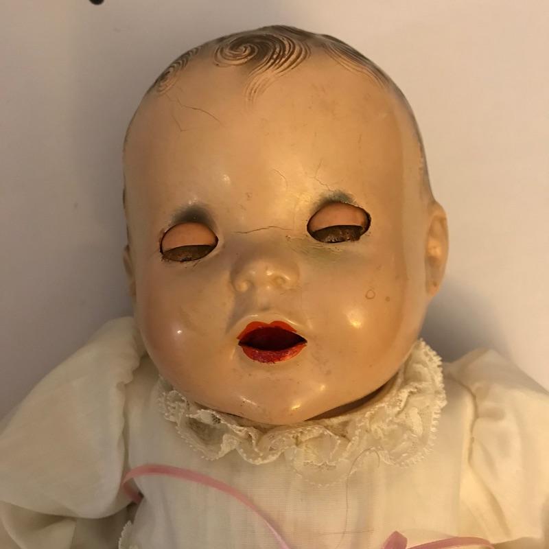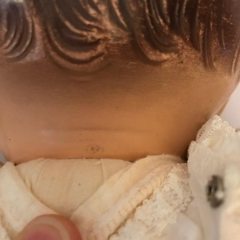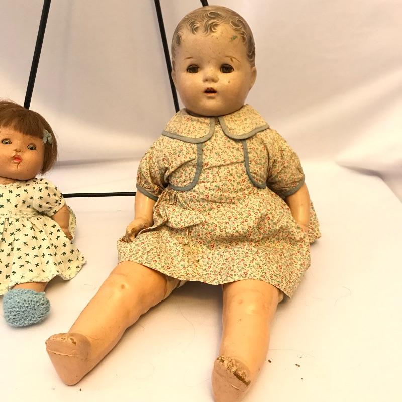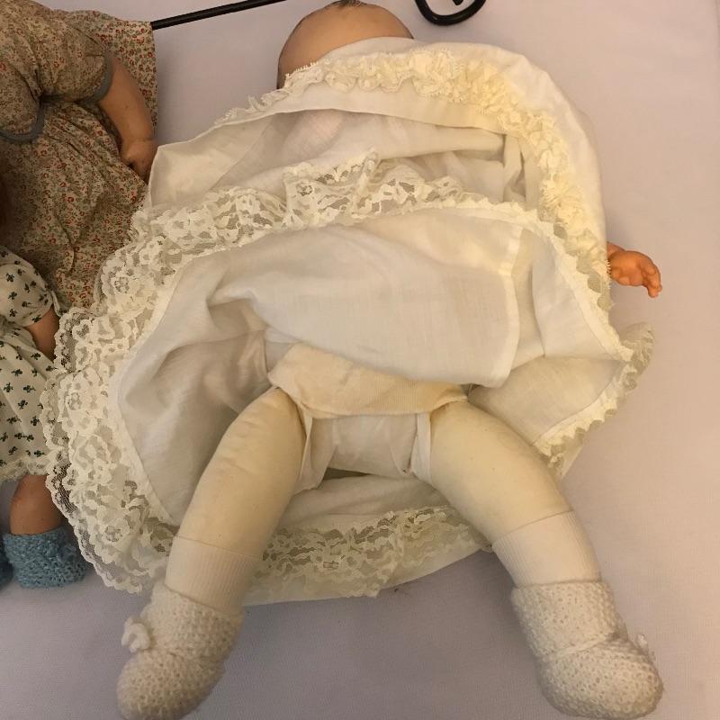 Three antique baby dolls with sleepy eyes. Lot includes two dolls with cloth torsos and a Horsman doll with a celluloid torso. The doll with the white christening dress and Horsman doll both have known markings shown in photos. The two cloth torso dolls are about 19” and the smaller Horsman doll is approximately 12”. All three dolls appear to have painted eyes. See photos. Shipping available.