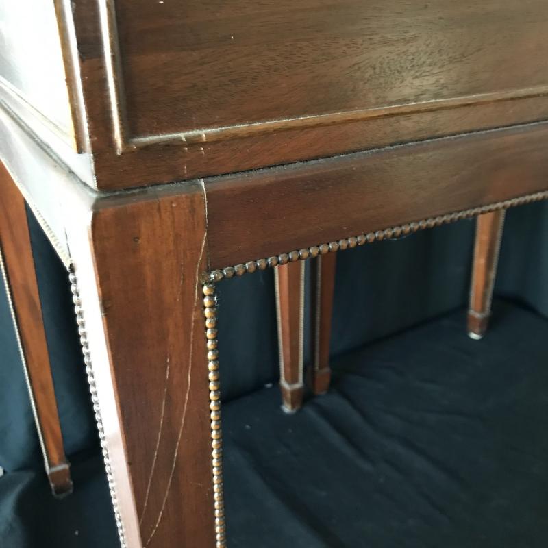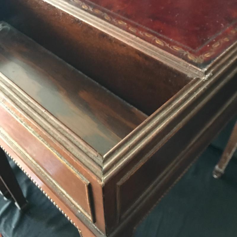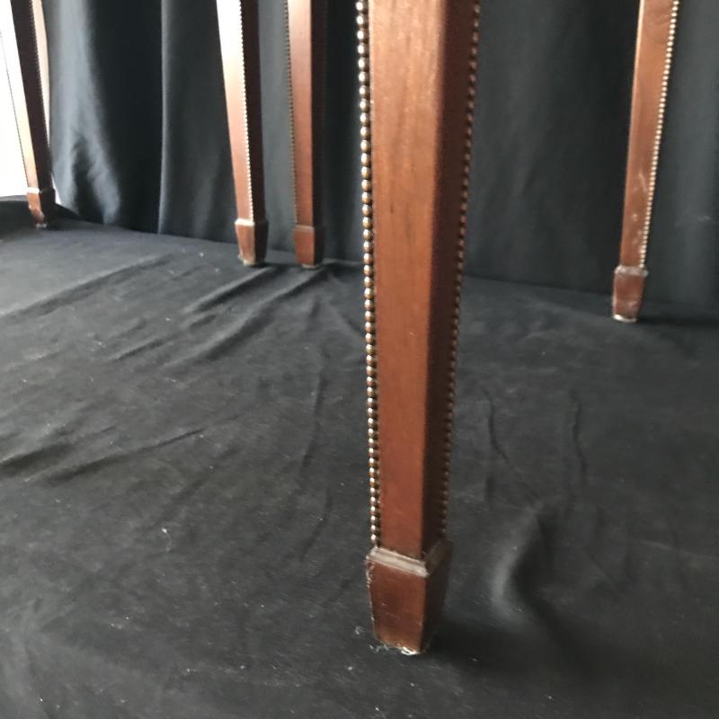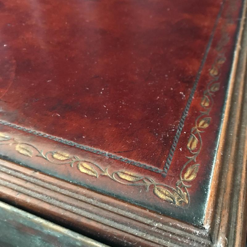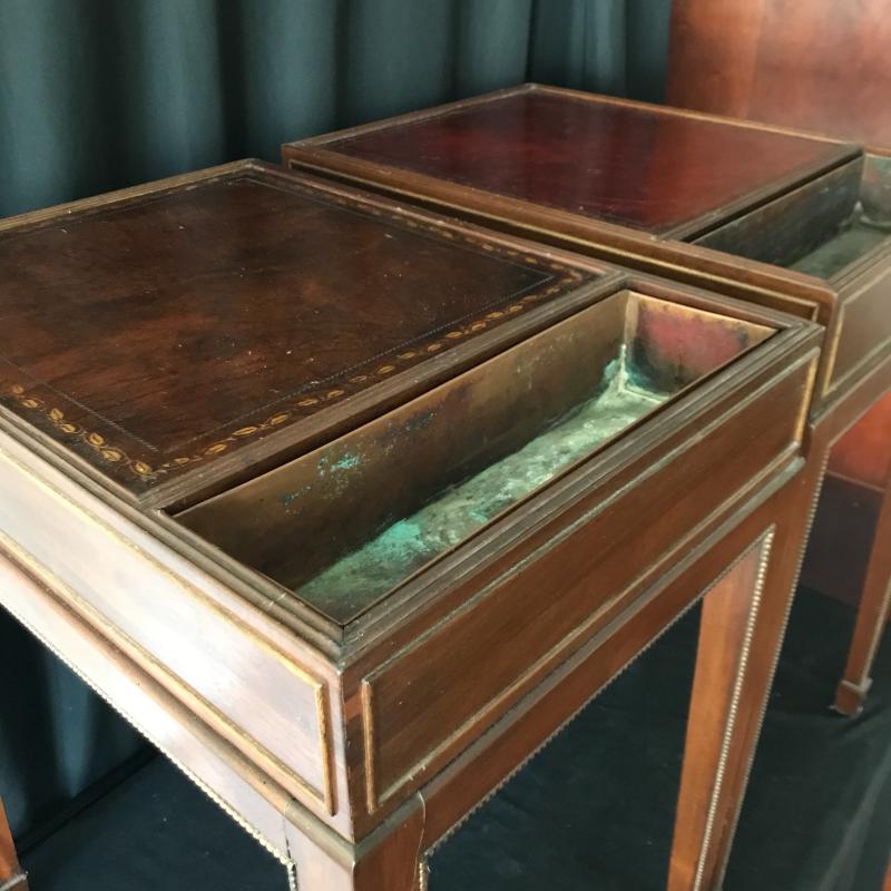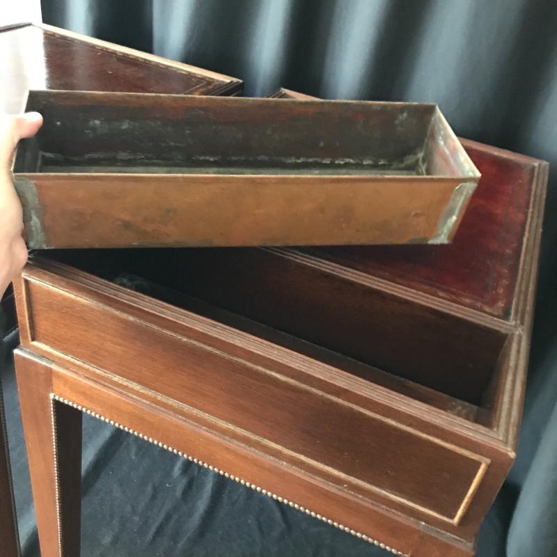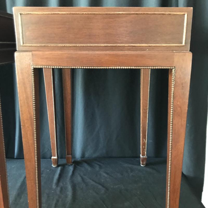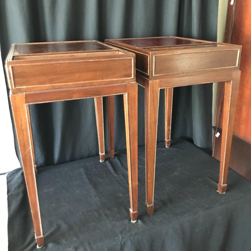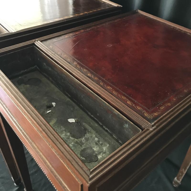 Two gorgeous leather top tables with removable copper insert. This pair of side tables are in great condition with just a few minor scratches. There is a nice bead detail on legs. You can use them with or without the cooper insert. For plants perhaps? 22” x 16” x 27.5” tall. No shipping.