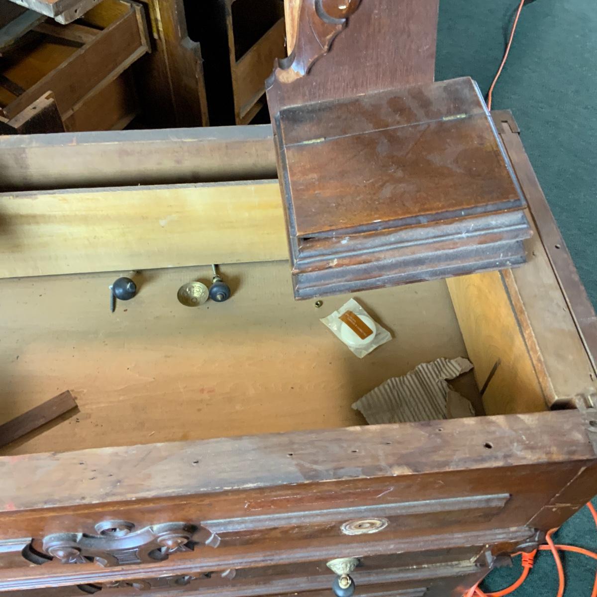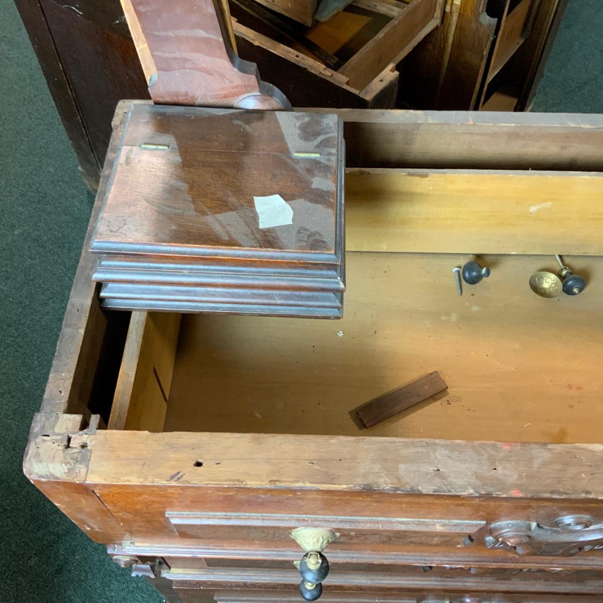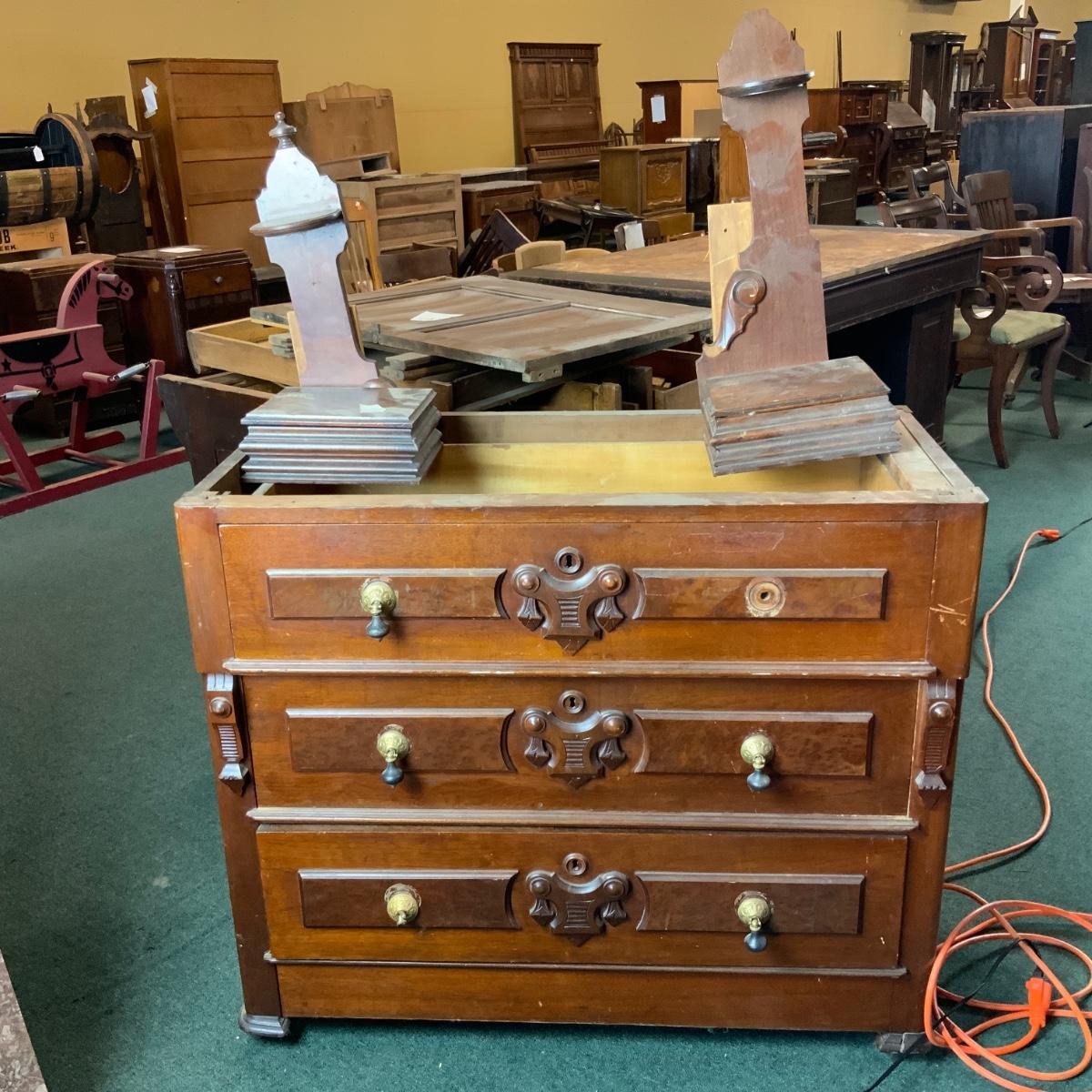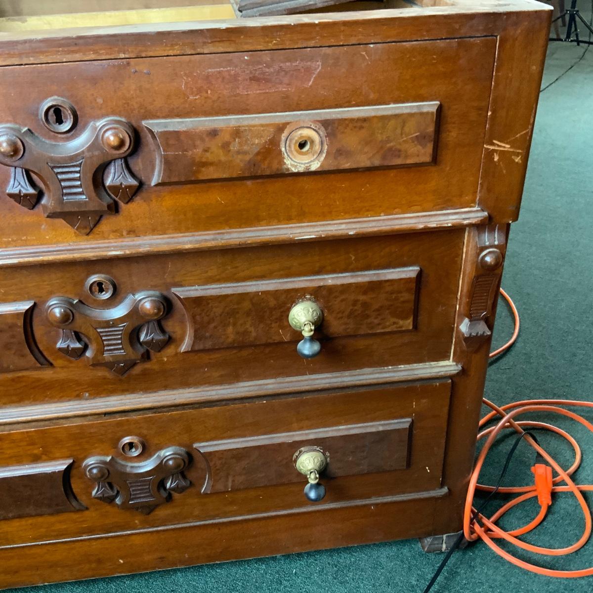 Victorian Walnut Dresser. Needs a marble top and some repair. //::\\ Please see photos for details and condition. No attempt has been made to hide any imperfections. All items listed in this auction are warehouse items, and need to be cleaned. A majority of the items need restoration as well. All items are sold AS IS and WITHOUT GUARANTEE. If you are uncertain about an item, DO NOT BID. Due to the nature of this online auction in-person inspection is HIGHLY recommended. All Sales are FINAL. Pick Up Times are FIRM. Please confirm with your own schedule that you can pick up in the scheduled times listed in the Terms and Conditions. Any questions please message the auctioneer. DO NOT Contact The Harp Gallery.