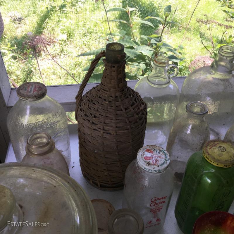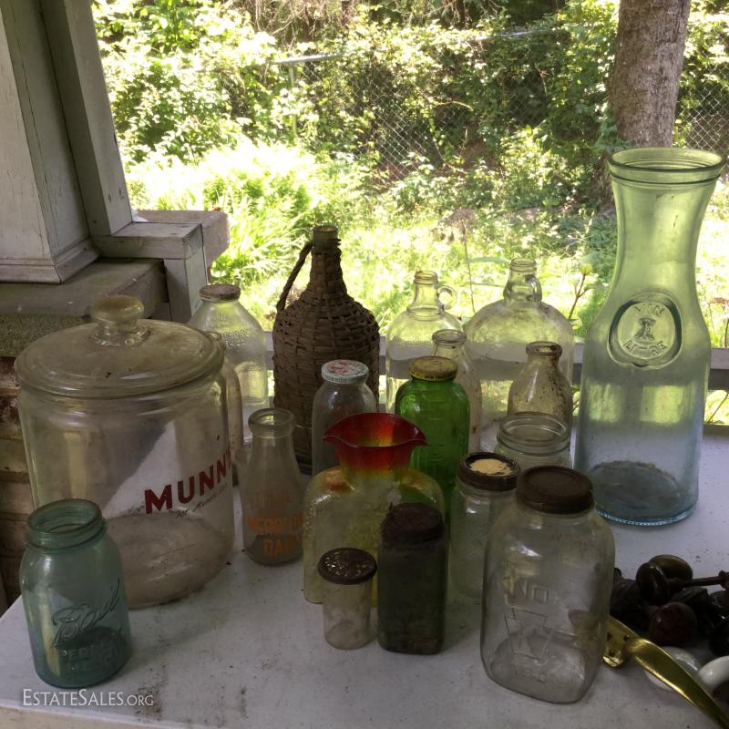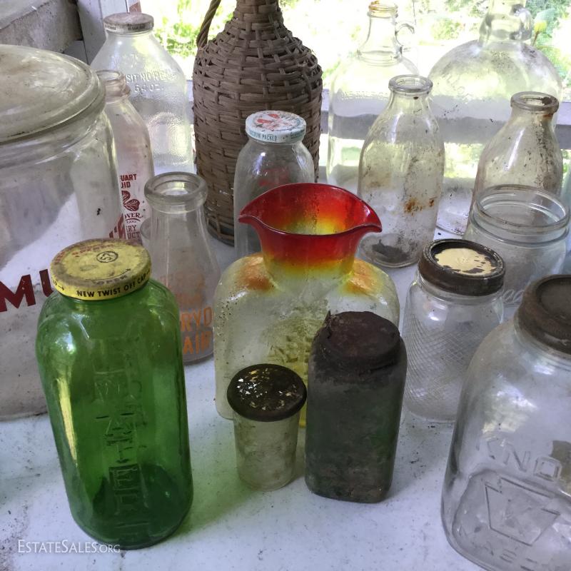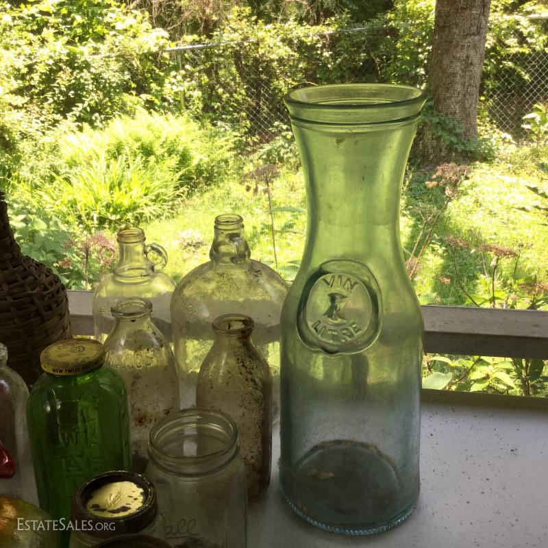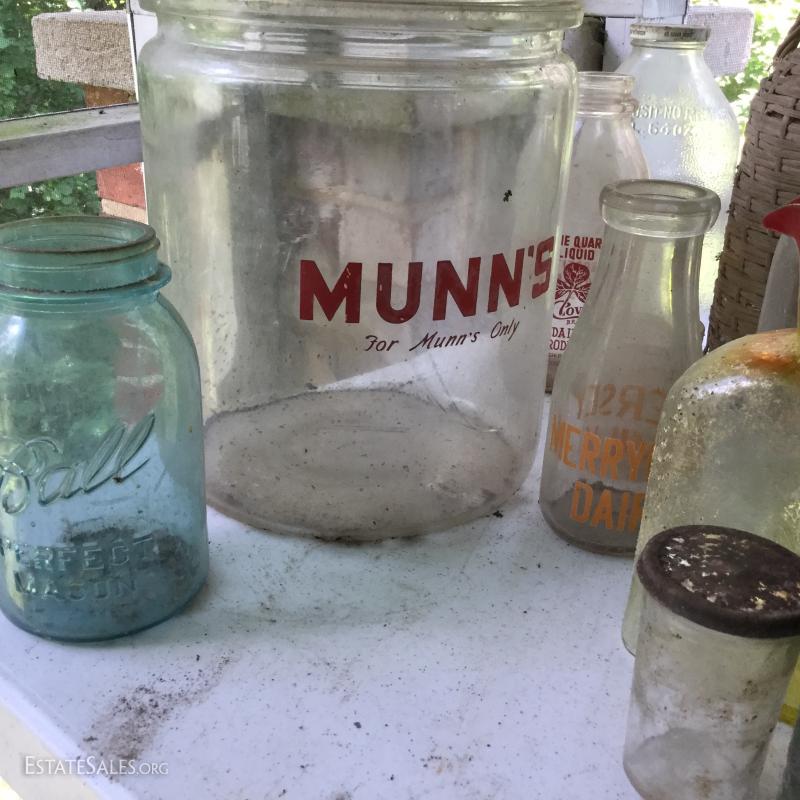 Misc, glass from Dairy and OJ bottles to Munn's Store Jar with Lid (has some chipped spots). Snuff jars and canning Ball Jars and more. Vin Litre Bottle measures 18.5" h and Munn's Store Jar measures 13"h. No Shipping. Local pick up in Saluda, NC
