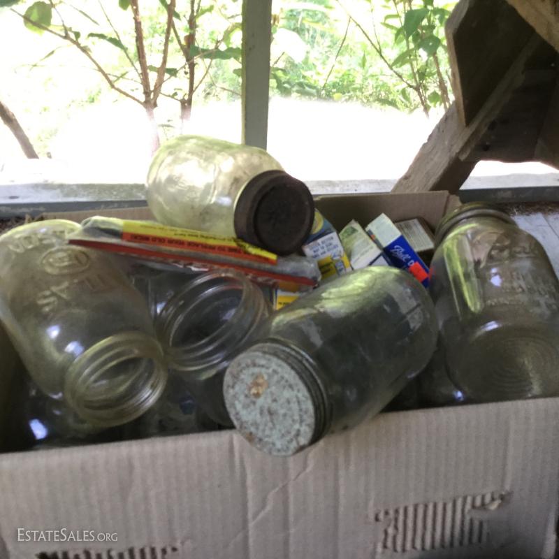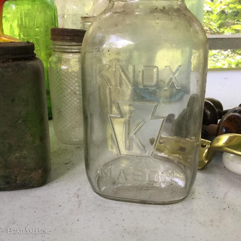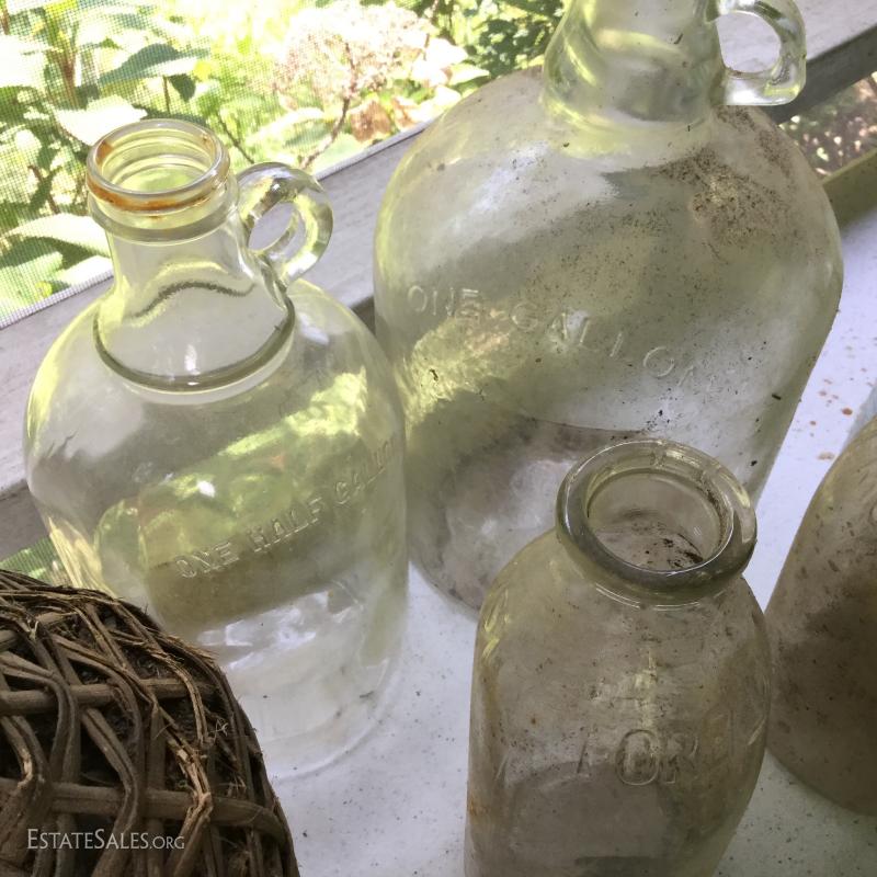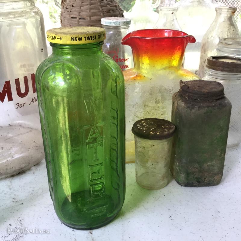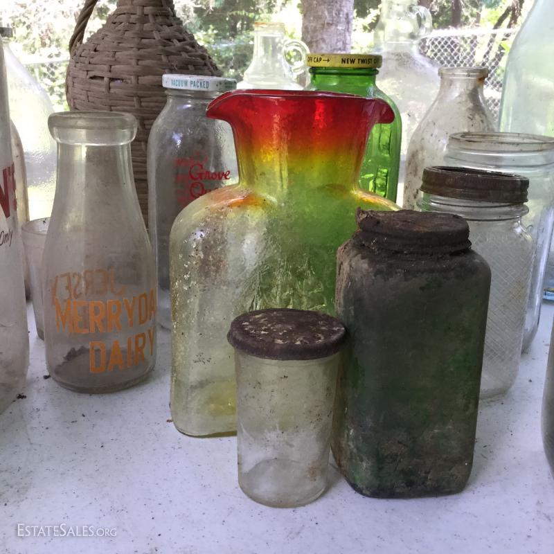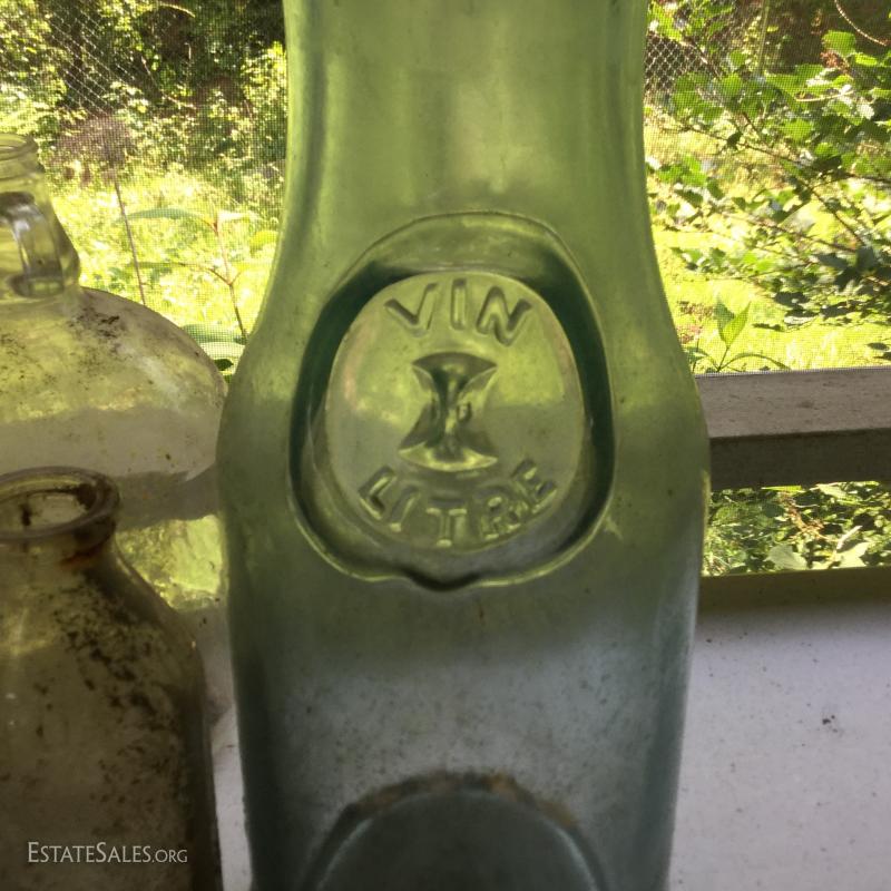Misc, glass from Dairy and OJ bottles to Munn's Store Jar with Lid (has some chipped spots). Snuff jars and canning Ball Jars and more. Vin Litre Bottle measures 18.5" h and Munn's Store Jar measures 13"h. No Shipping. Local pick up in Saluda, NC
