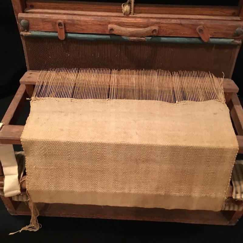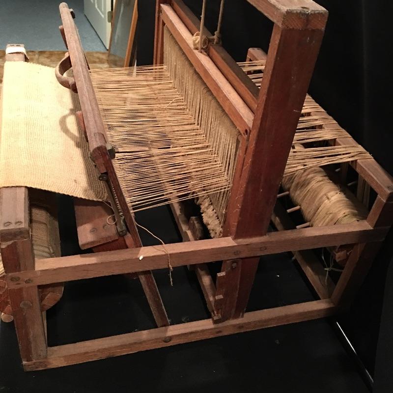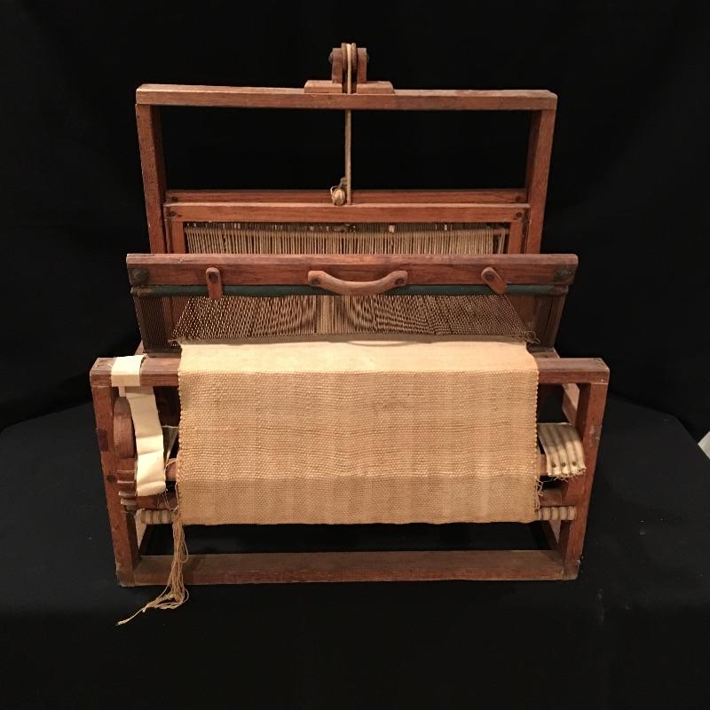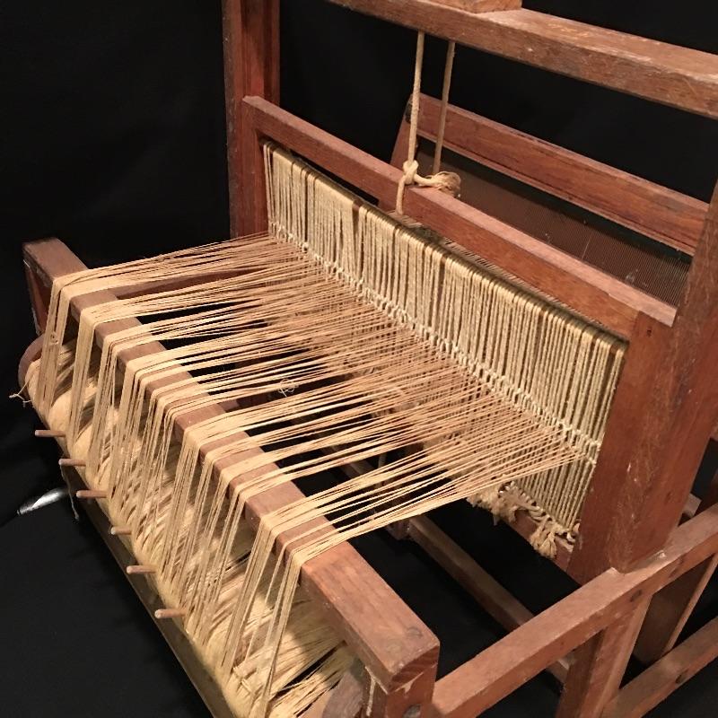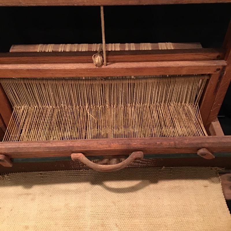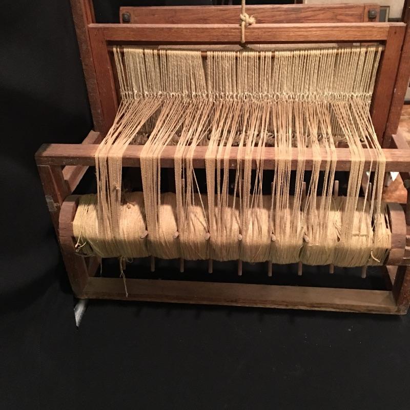 Vintage tabletop weaving loom. This loom looks to be all set to start weaving. A great piece of machinery. Loom measures 24” x 28” x 26”.