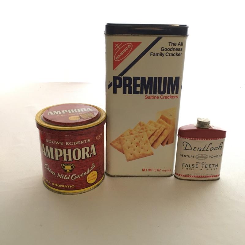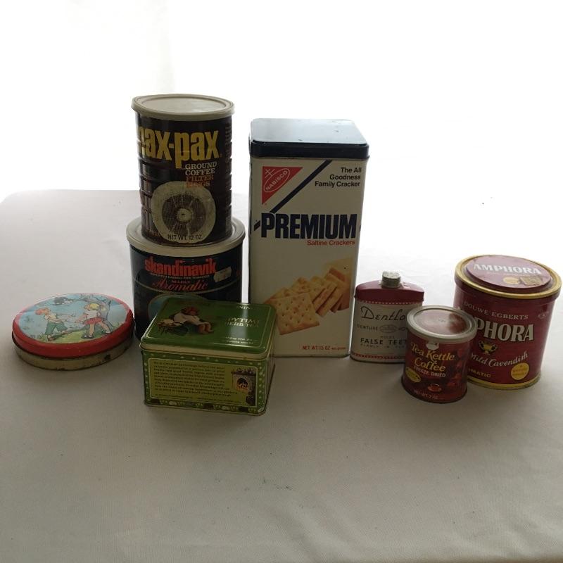 Vintage Tins includes Premium Saltines, Dentlock, Amphora and Skandinavik pipe tobacco, Max-Pax coffee, Sleepytime Tea and more. Add a little nostalgia to your home with this nice collection of tins.