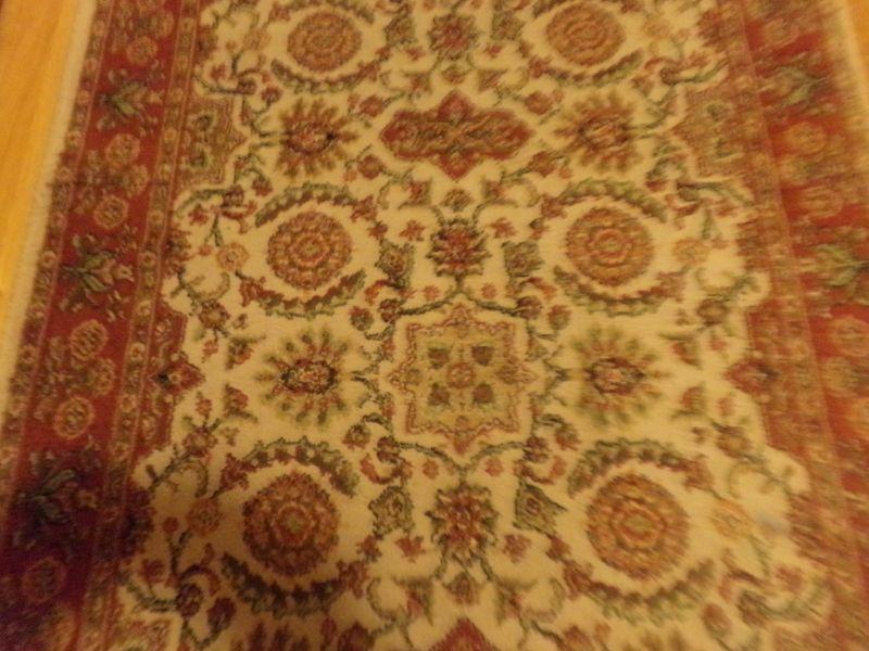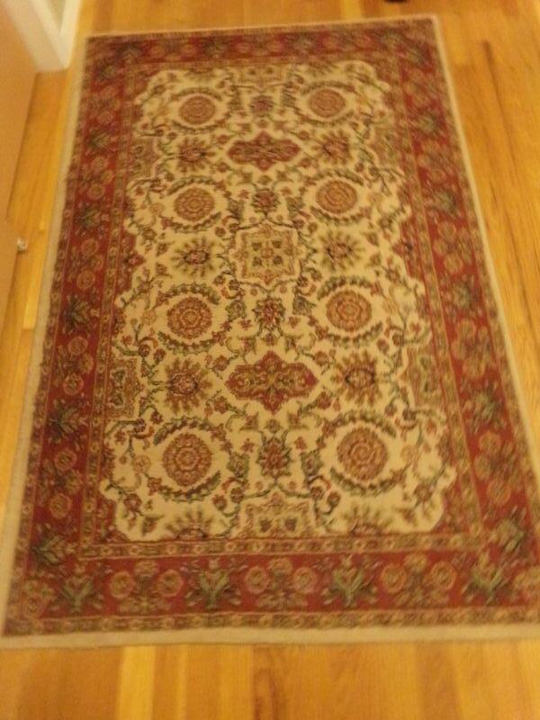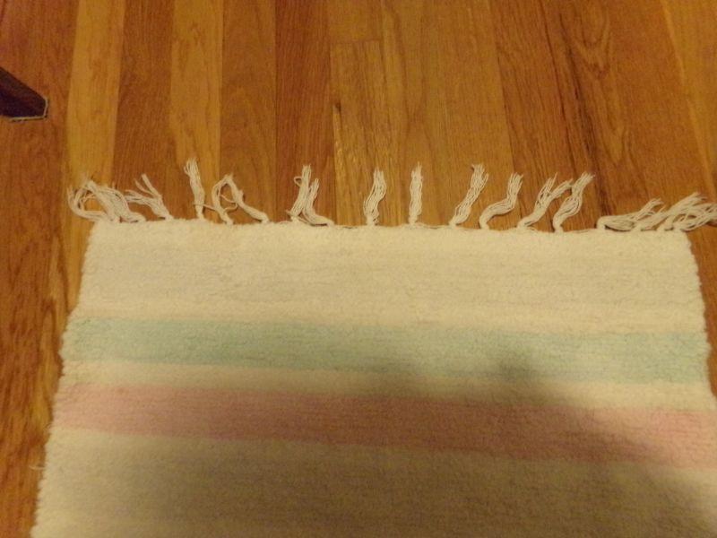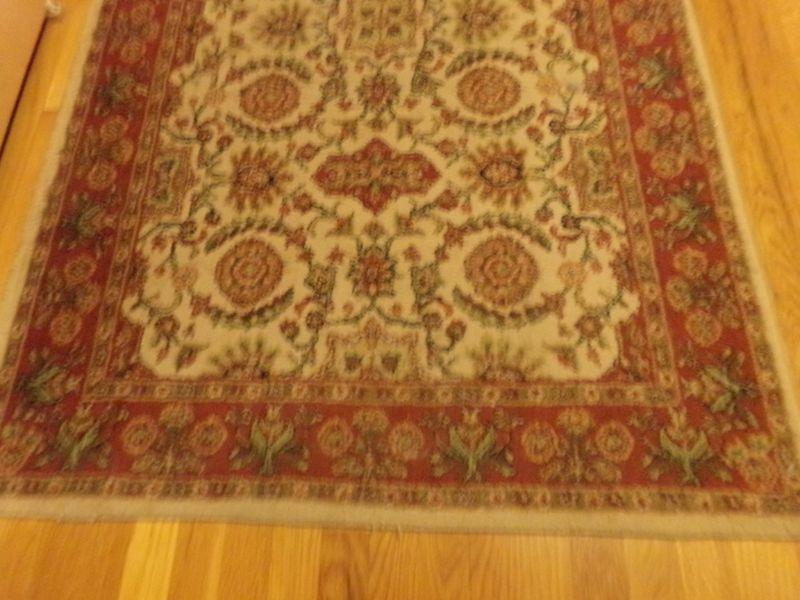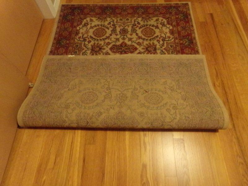 ONE RUG IS REDDISH AND BROWN AND MEASURES 62" x 41". THE SMALLER ONE IS PINK/WHITE/BLUE AND MEASURES 33" x 22". THEY ARE IN GOOD CONDITION.