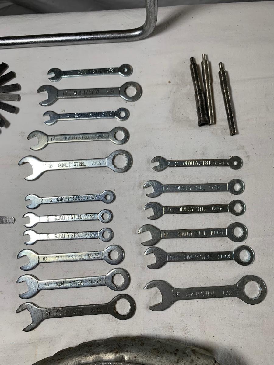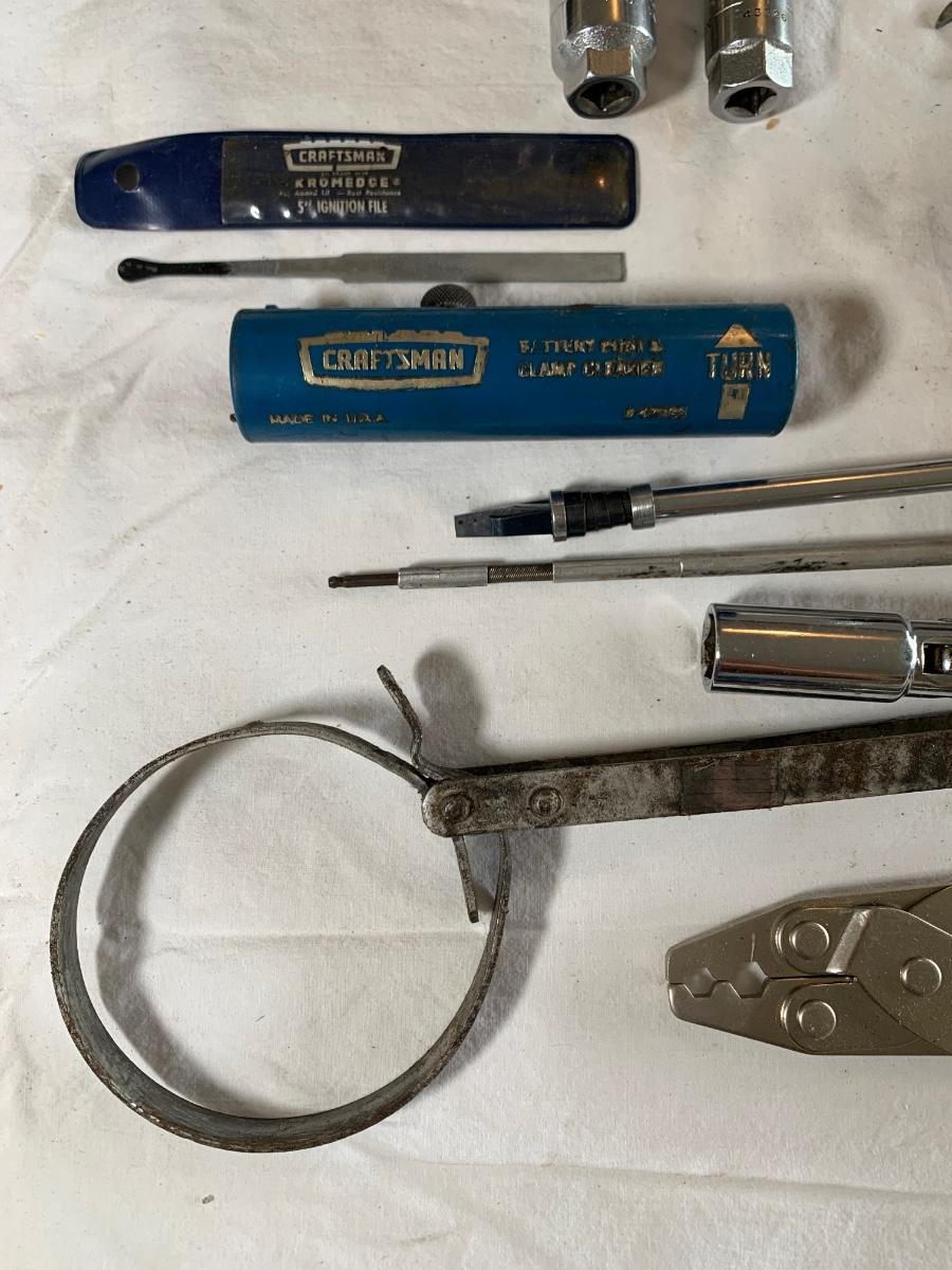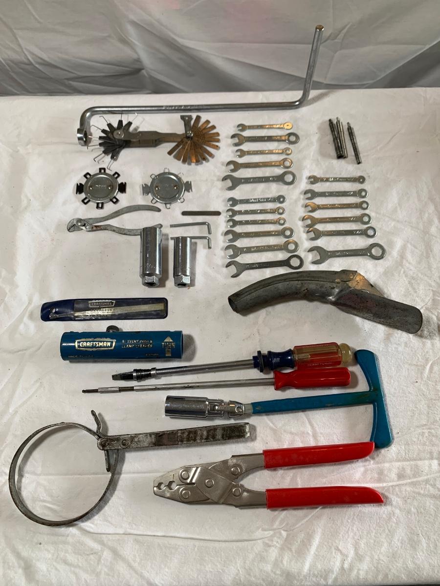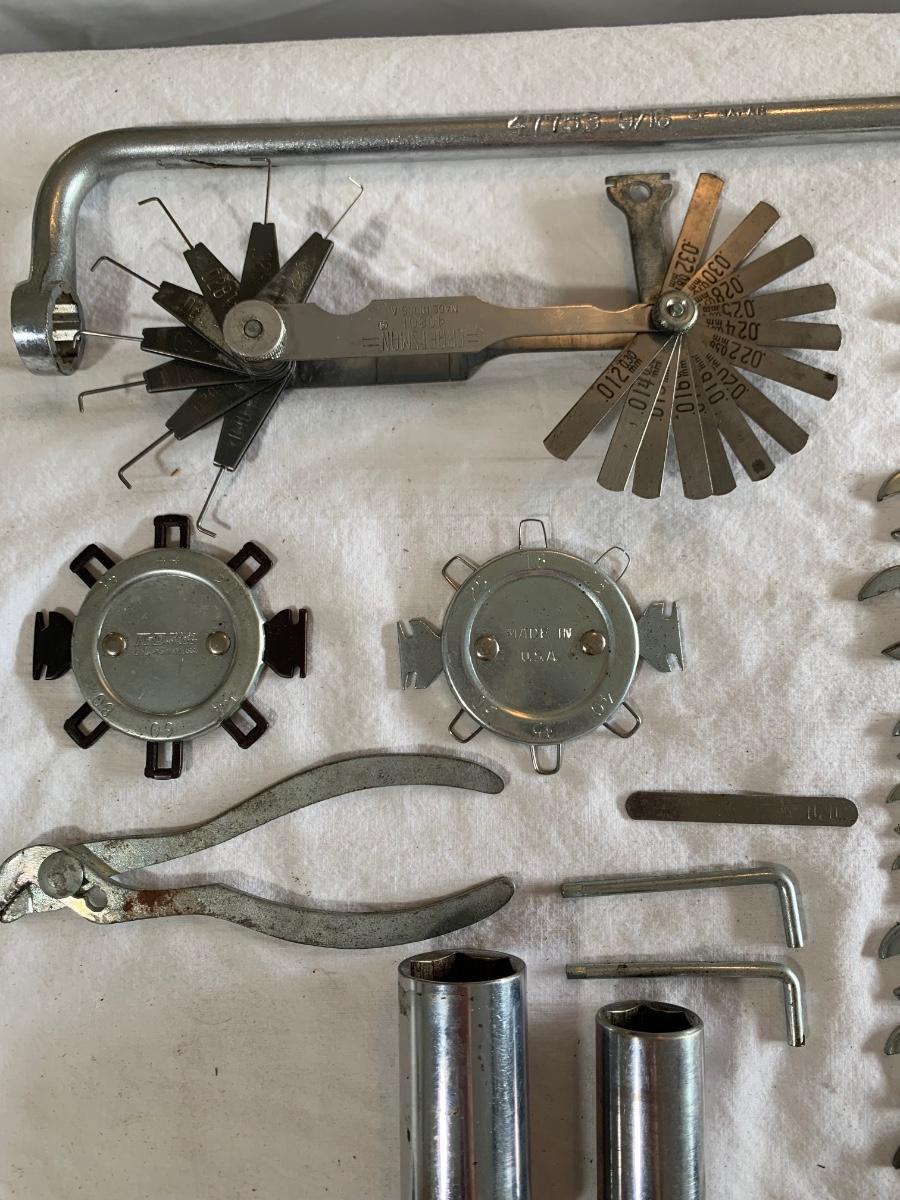 Lot includes Vintage Craftsman 40801 Ignition Spark Plug Feeler Gauge, 2 Spark plug gap gauges, Craftsman 47753 12 pt Distributor 9/16 Wrench, Ignition 5" file, Oil can spout, 17 Wrenches, each a different size.