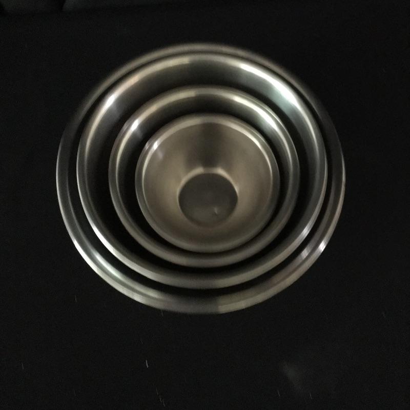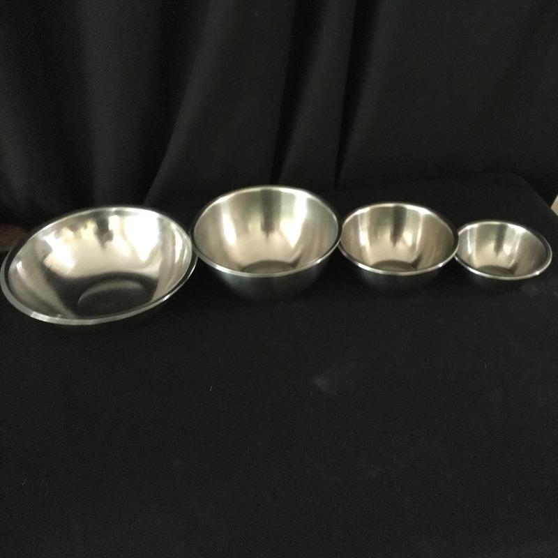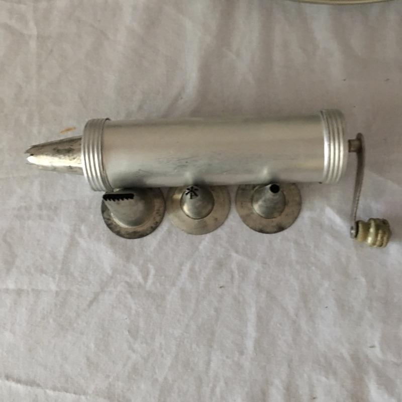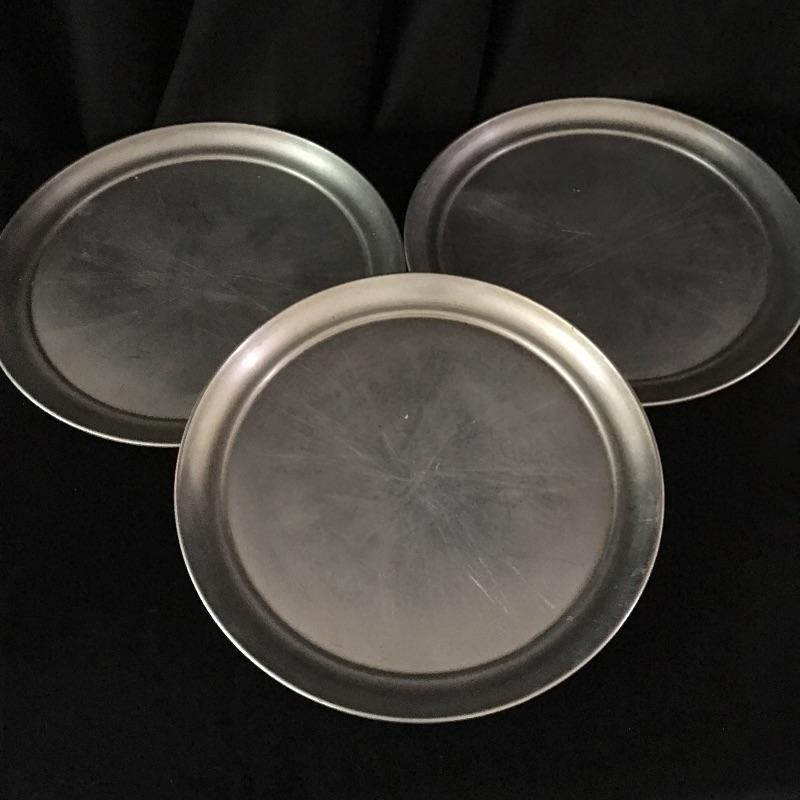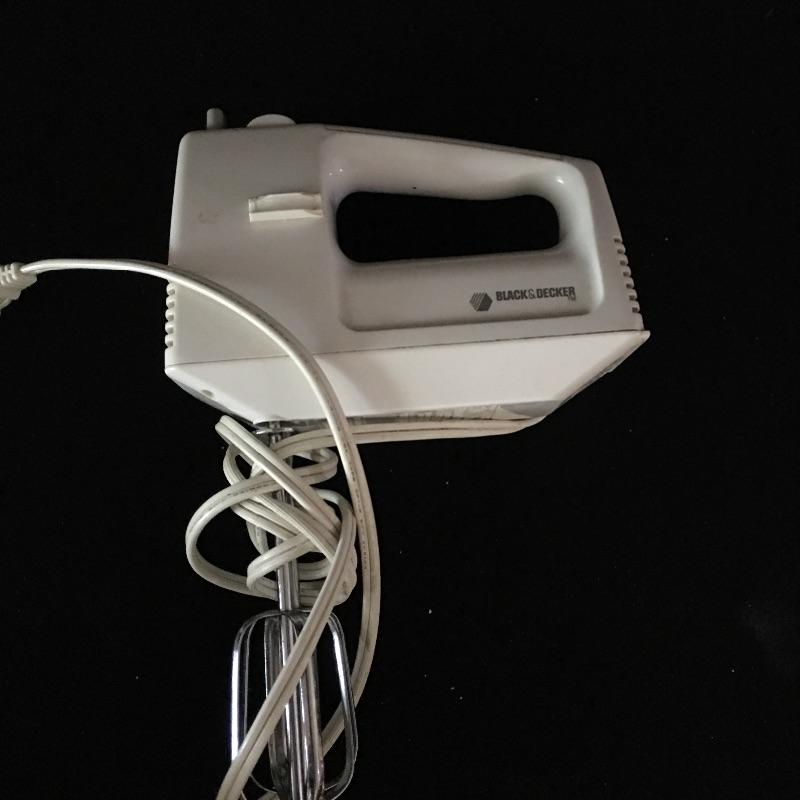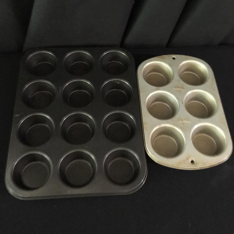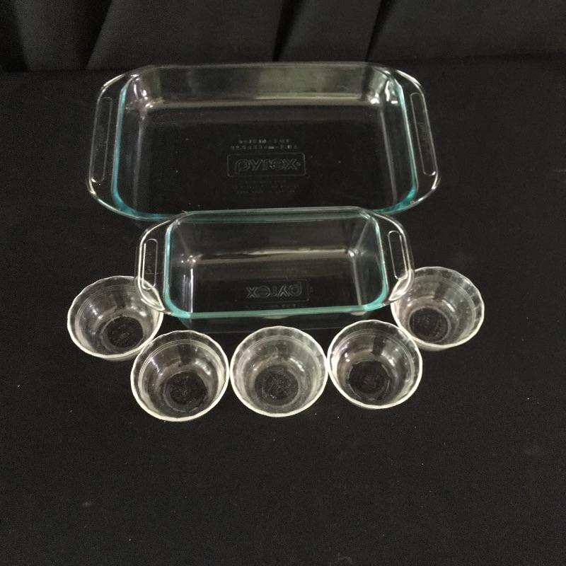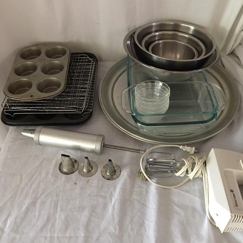 Baking essentials includes three pizza pans, Pair of muffin tins, cake decorator, seven pieces of Pyrex, nesting bowls and Black and Decker mixer. Pizza pans measure 17”D.