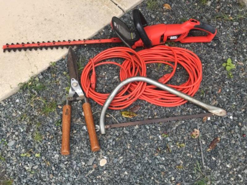 Black and decker electric hedge trimmer HH2450 with 2 ext. cords , hand saw craftsman hand hedge trimmers