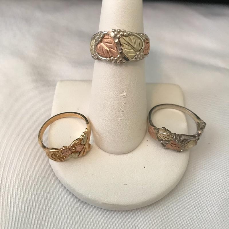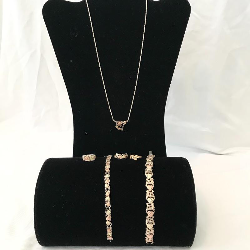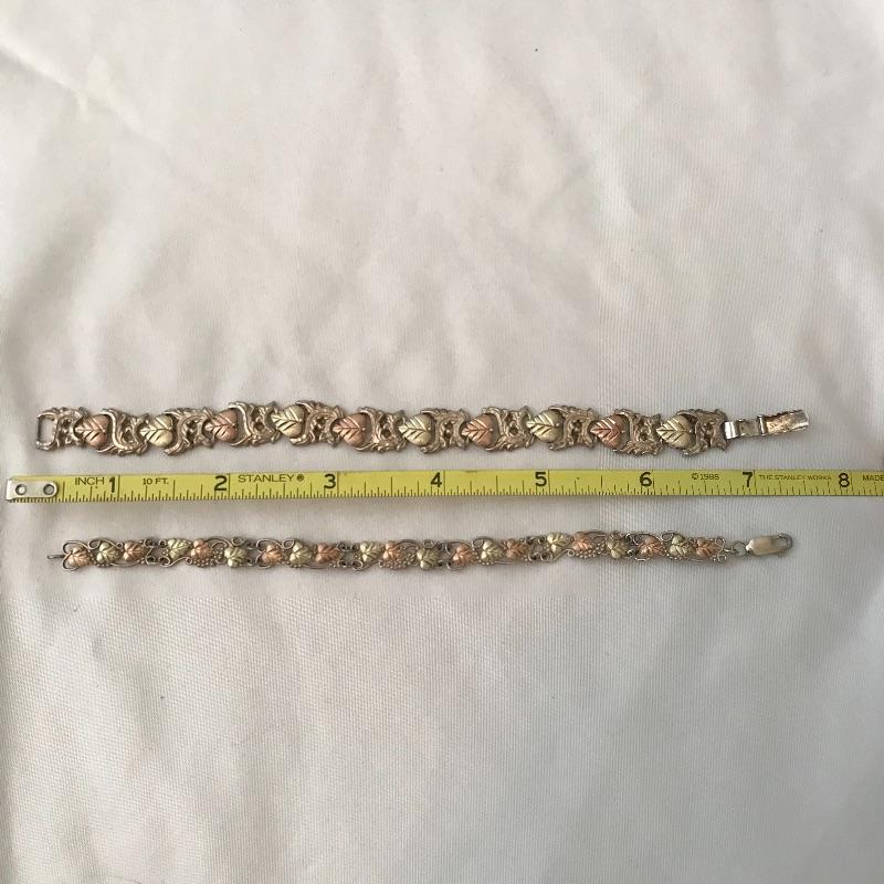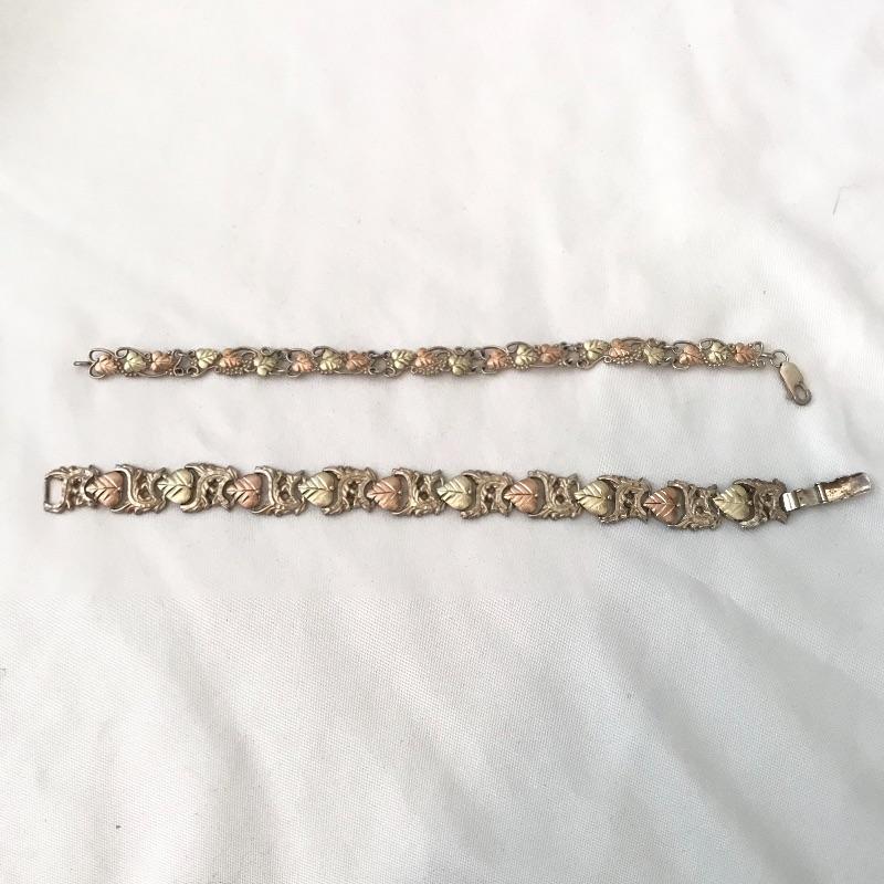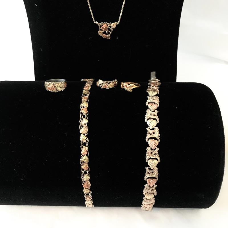 Grapes, leaves and precious metals! There’s something so captivating about the designs and colors. Includes 3 rings, 2 bracelets and a necklace. These pieces will go well with most other jewelry, gold or silver colored and more! All pieces have a mix of gold (either 10K or 12K marks) and sterling/925, see photos for markings and ring sizes. The pendant can be removed from the chain, also marked 925. Shipping available.
