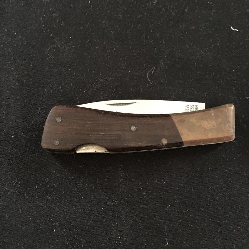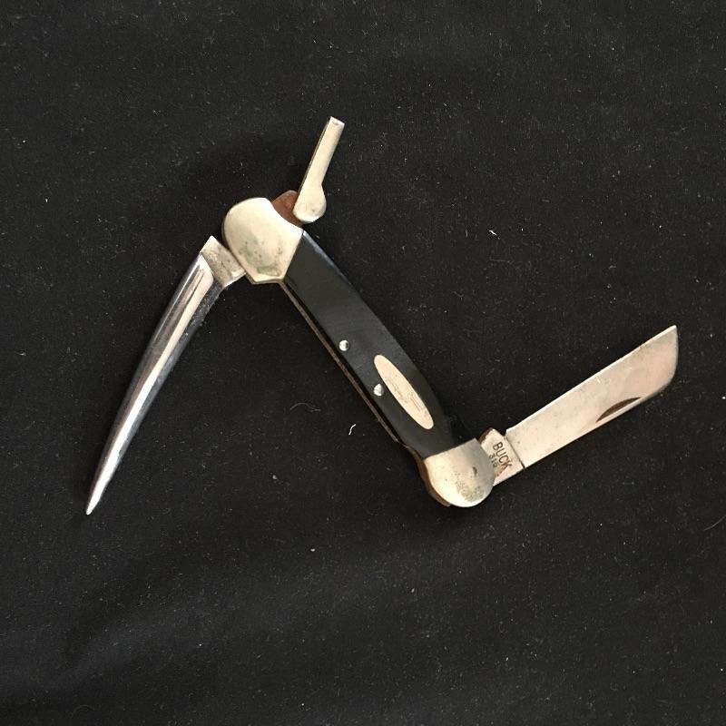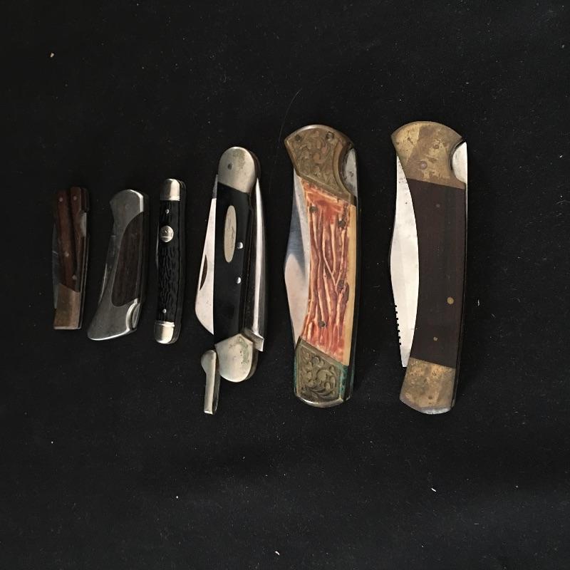 Buck sailors knife and more. Lot includes Buck # 315 yachtsman marlin spike knife, two large folding knives, two Wenoka knives and a small folding knife. Largest knife measures 8.75” long when open.