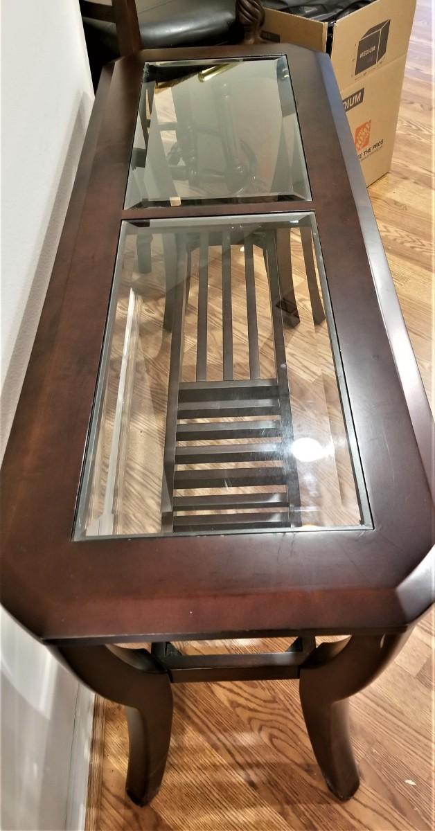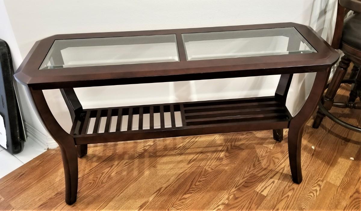 Contemporary Sofa Table with attractive styling - drop in beveled glass top (2 pieces). Gently used condition. Matching coffee table in a later lot. 50" across, 17.75" deep, 27.5" tall.