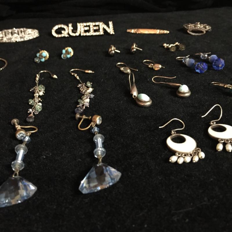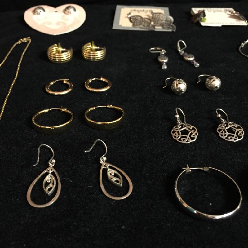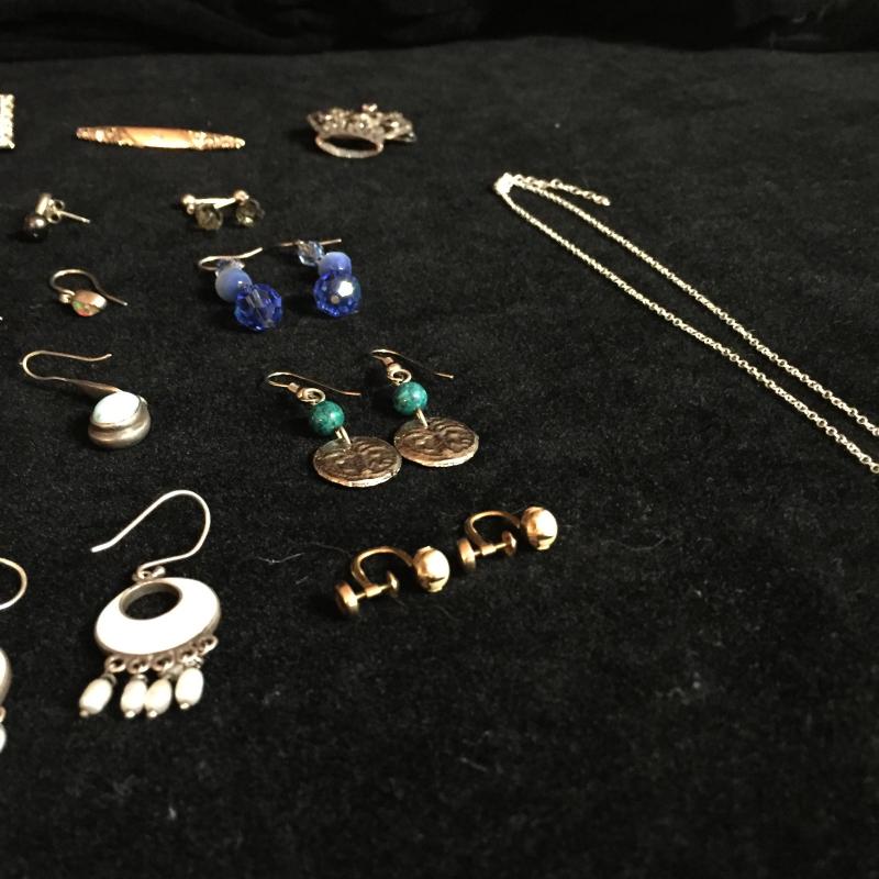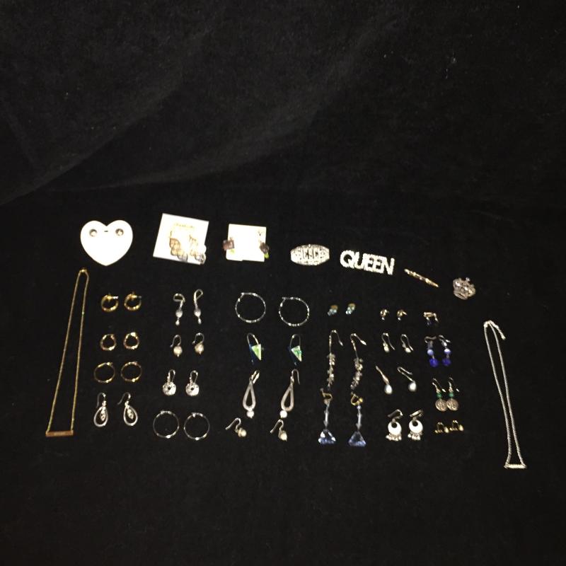 Large lot of earrings fpr pierced ears. These modern sets and great for any outfit. Some are sterling but mostly costume. Some new. You’ll also find Fun Pins in this Lot. Shipping Available