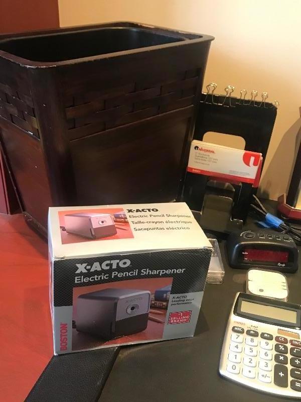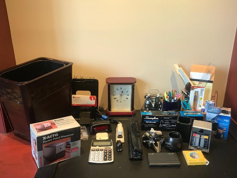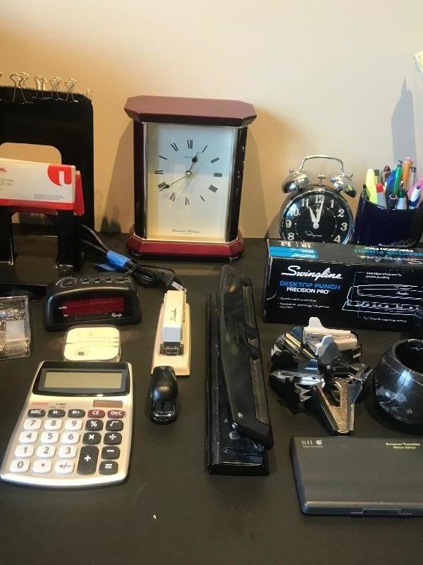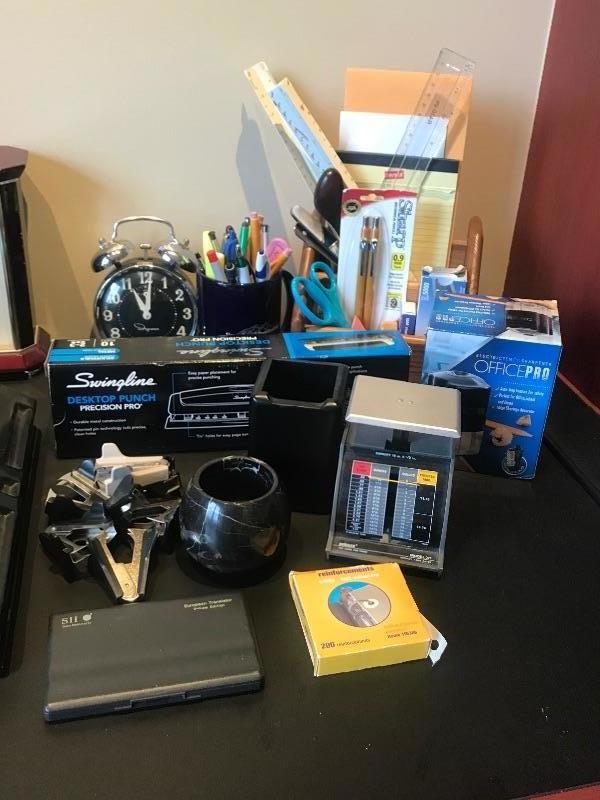 Westminster -Whittington Quartz Japan Seiko Table Clock 8-5/8” tall and 3-5/8” deep. Two 3 hole punches (1 is new in box), pencil sharpener, pencil holders, mail organizer, waste basket, bookends,clocks,scale and desktop protector