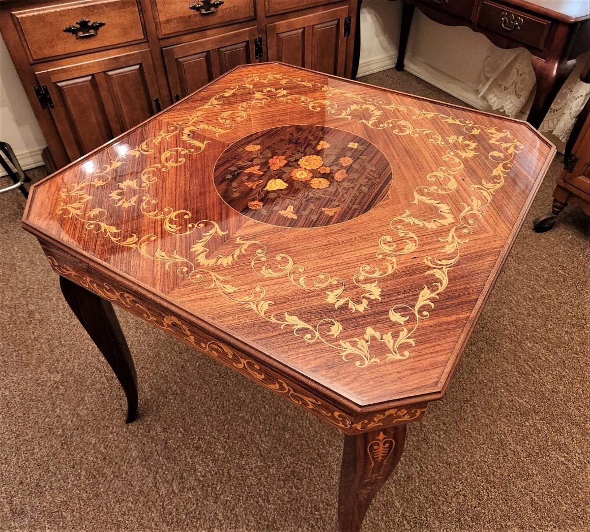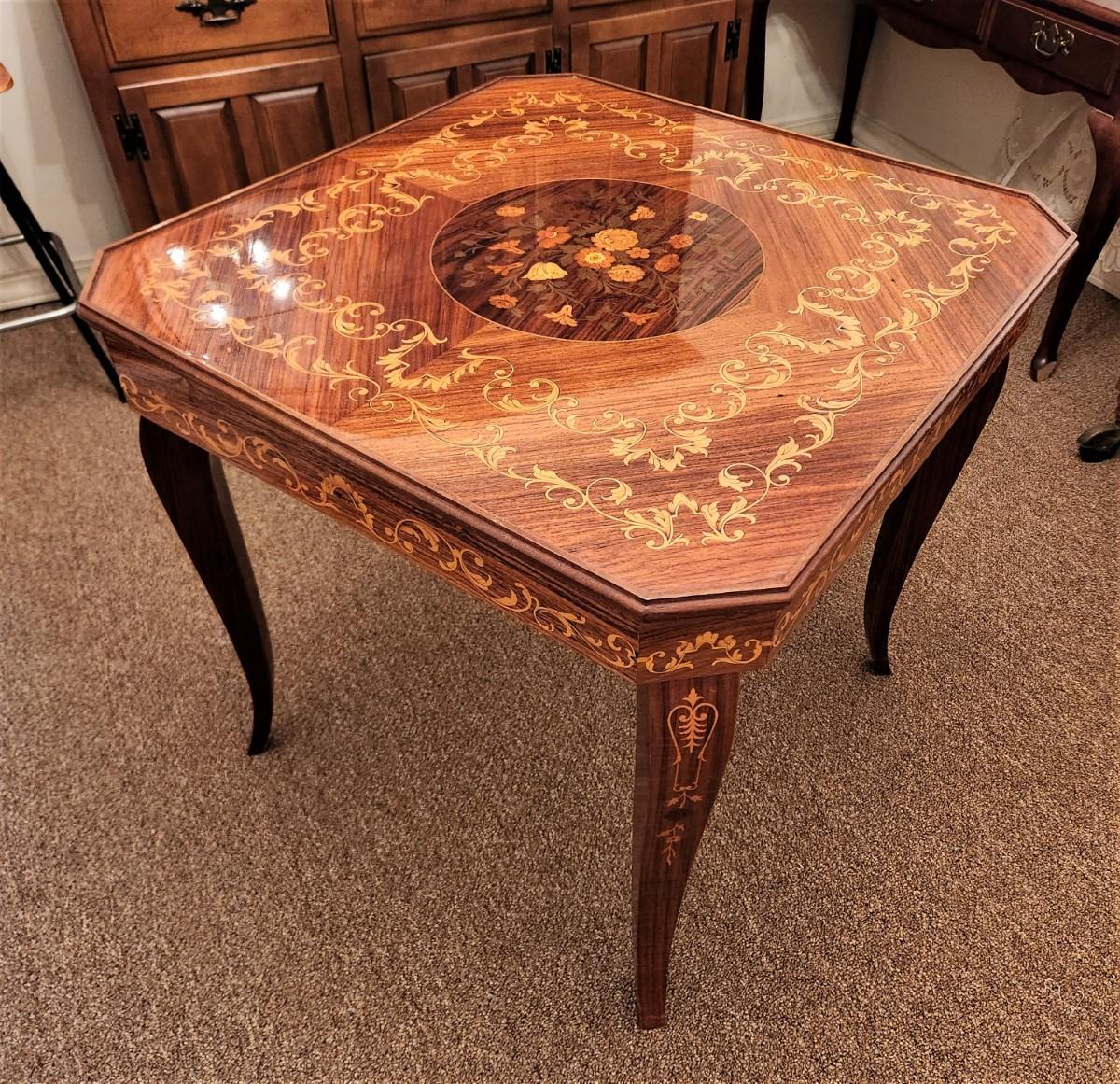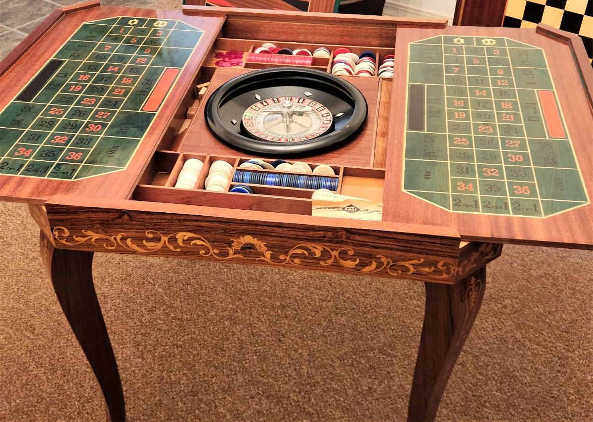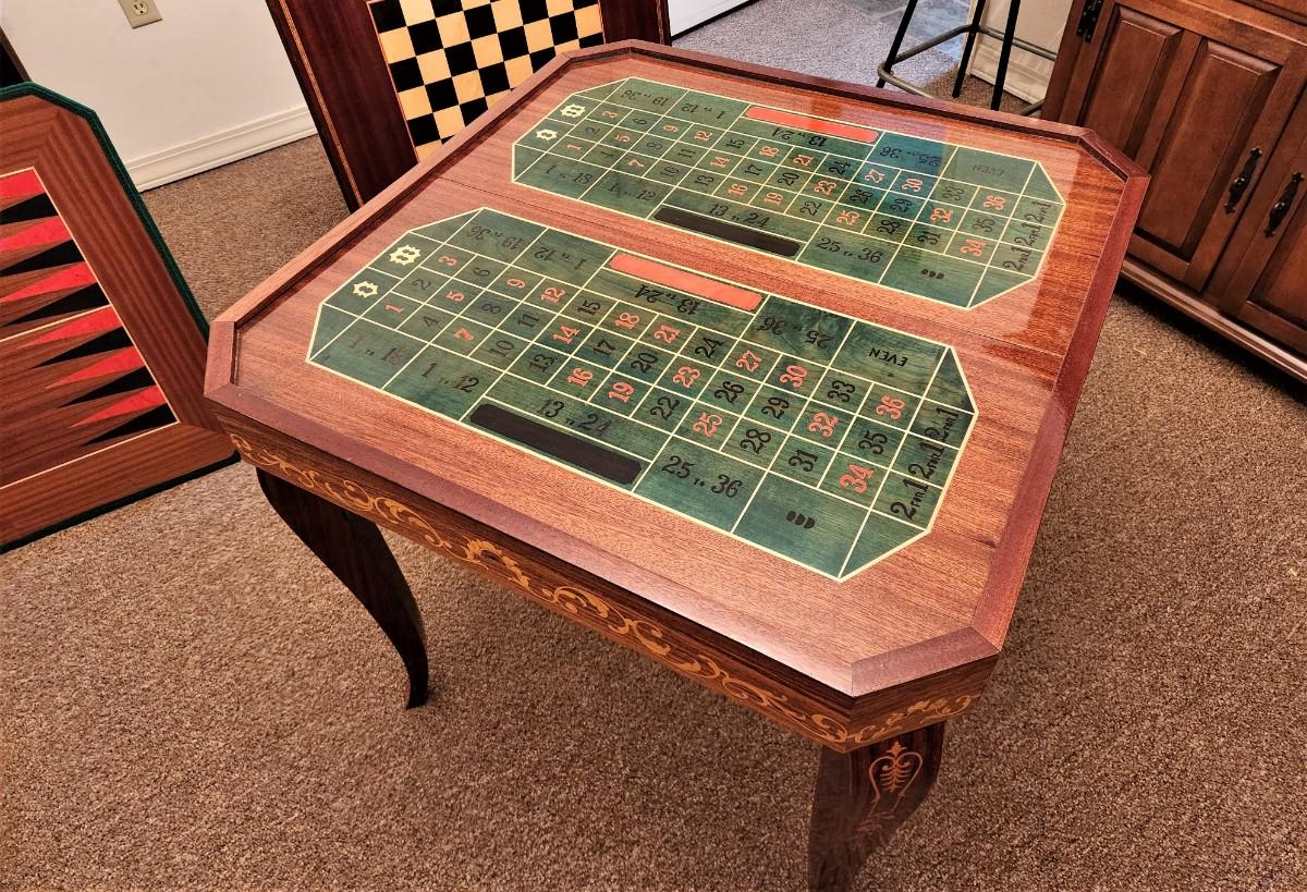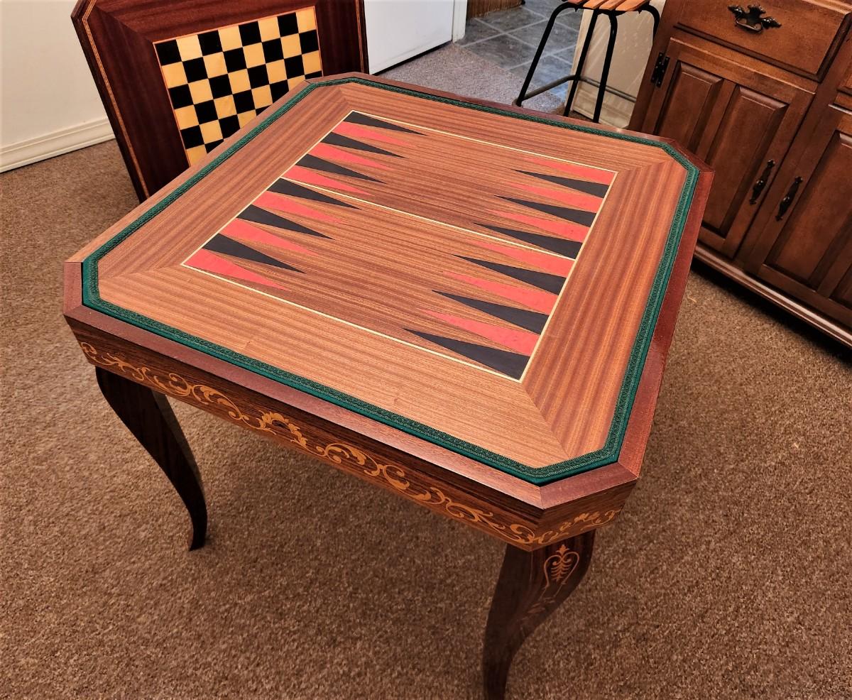 This great table has tops for Roulette, Backgammon, and Chess/Checkers. 30" x 30", 29" tall. Over the top Inlaid Italian style. You get everything you see in the photos. Good vintage condition.