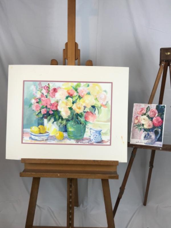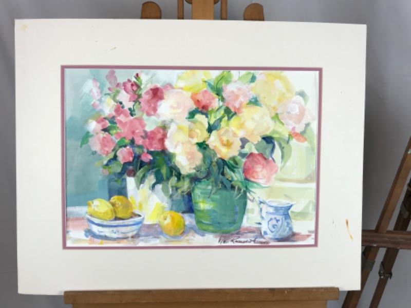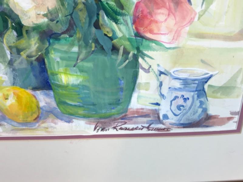 Pair of Jean Ranney Smith signed original watercolor paintings. “Flowers and Lemons” measures 28”x22” including mat. “Flower In A Pitcher measures 10”x7”