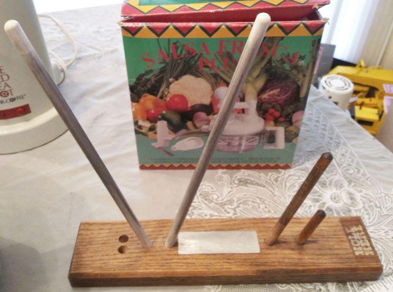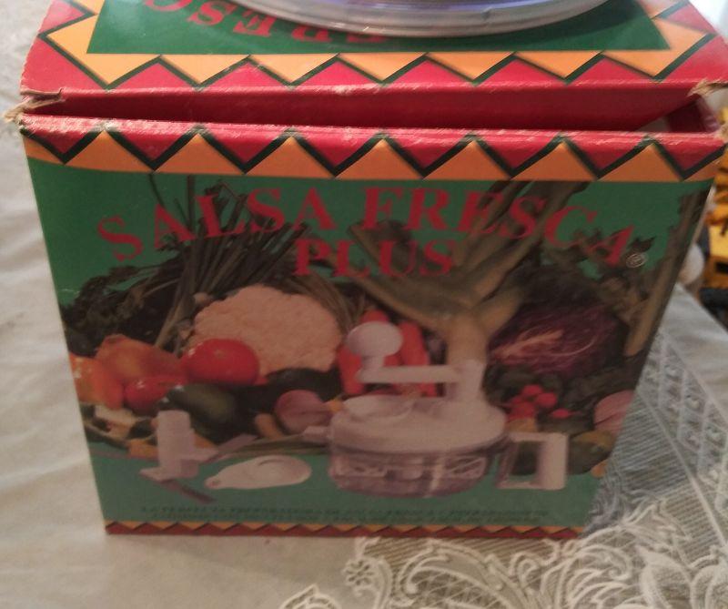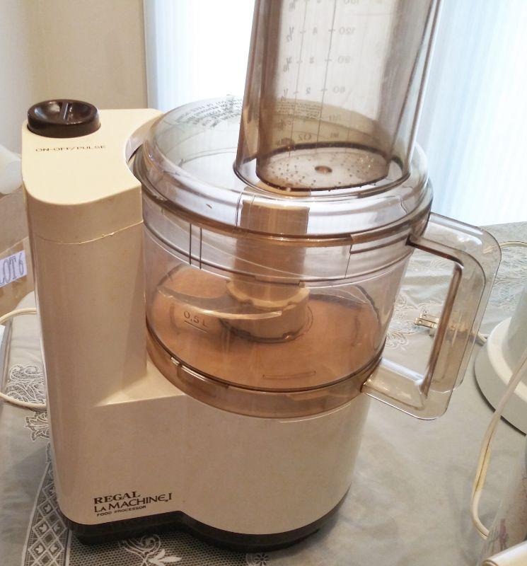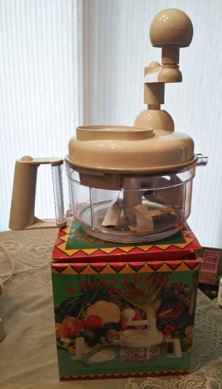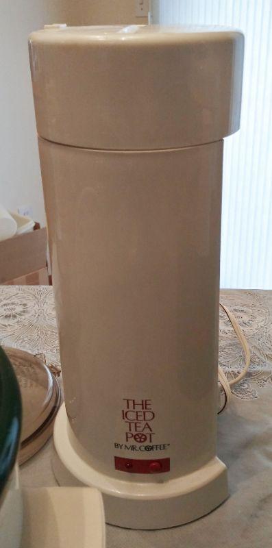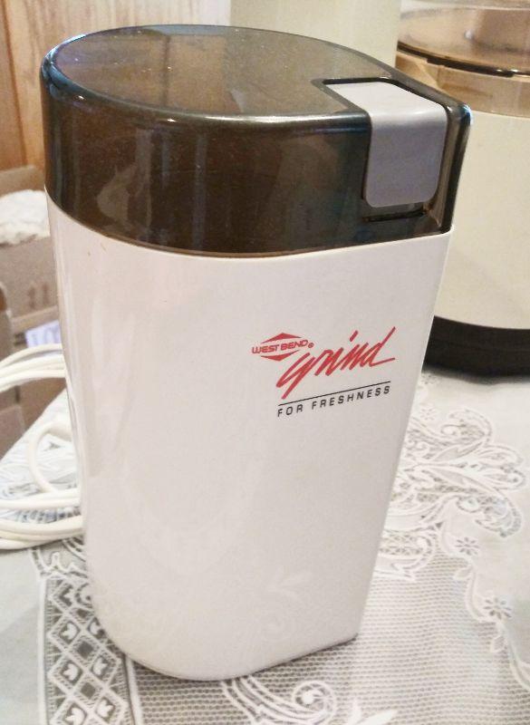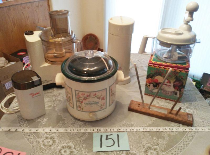 COFFEE GRINDER, ICE TEA POT, CROCK POT, SALSA MAKER, KNIFE SHARPENER, AND FOOD PROCESSOR (ONLY HAS 1 BLADE)