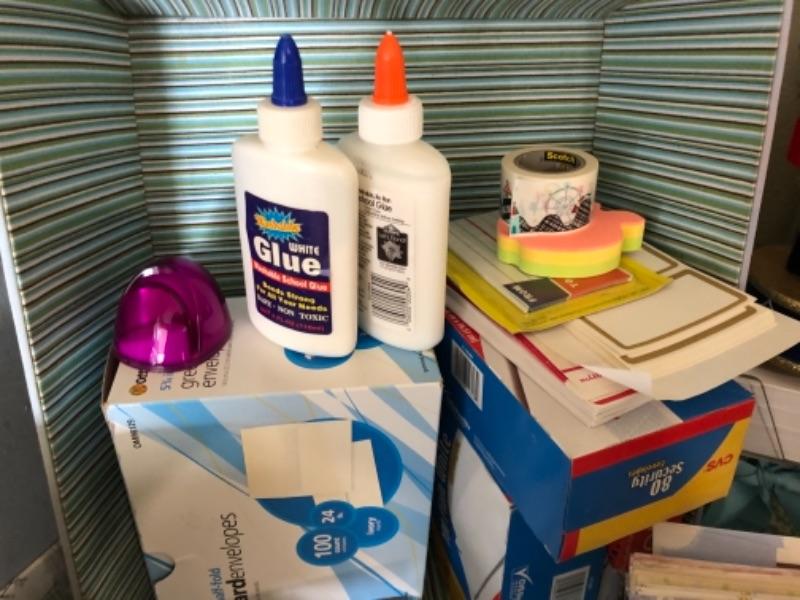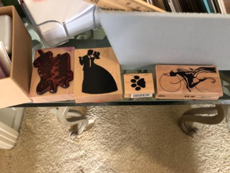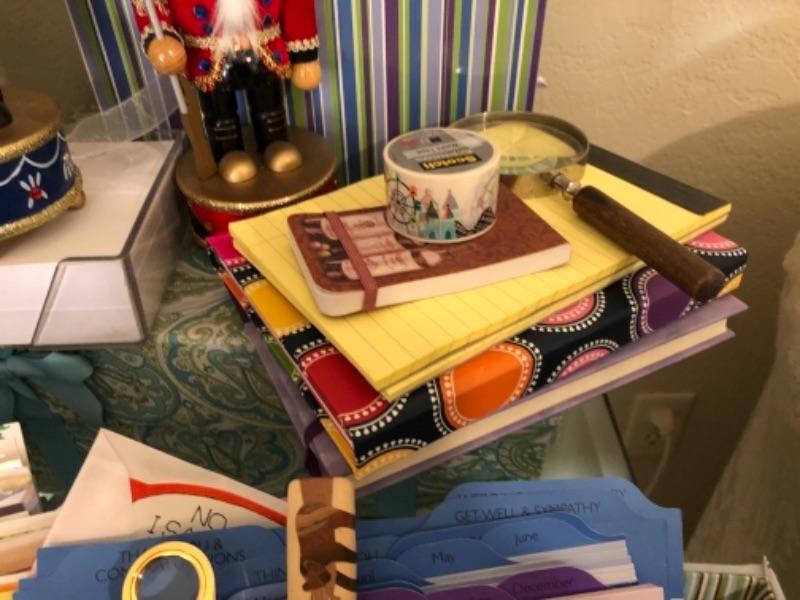 Lot 151. Large assortment of stationery, cards, unused diaries, decorative boxes, tables, envelopes, nutcrackers, photo paper, office supplies, post-its, rubber stamps, magnifying glass, thimbles, metal dog art--WAS $55““NOW $27.50