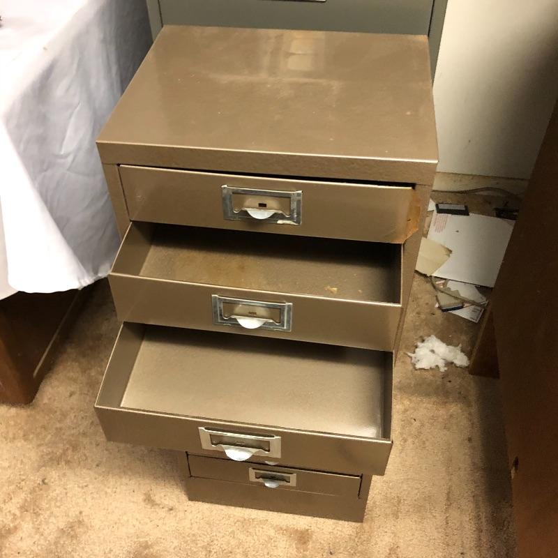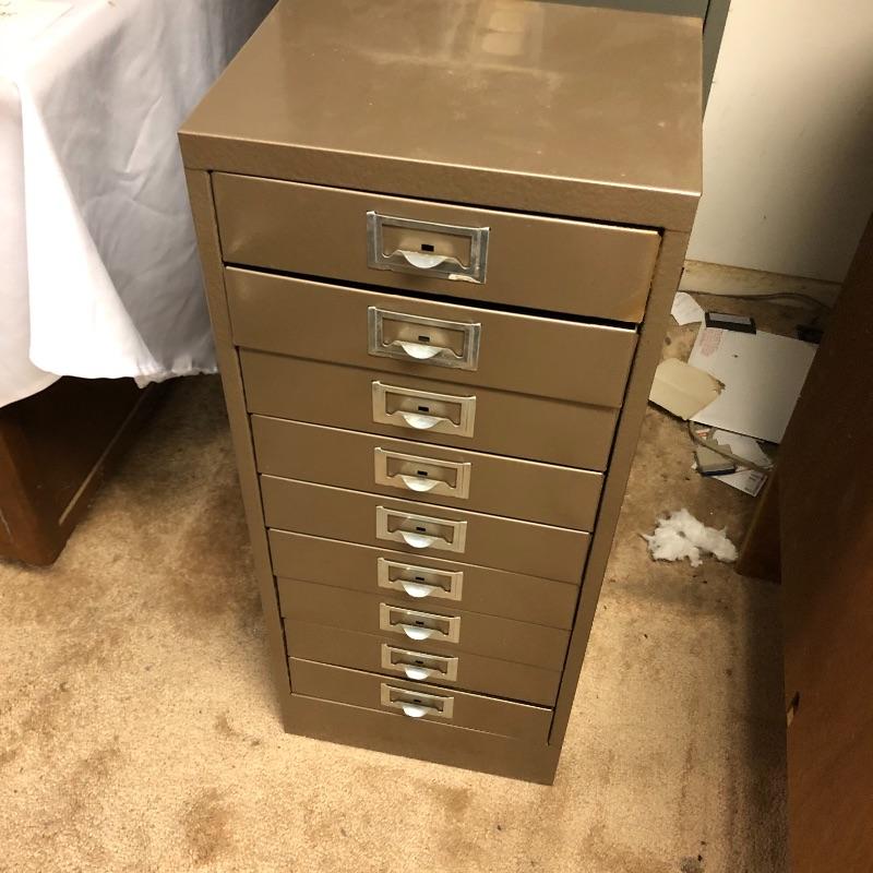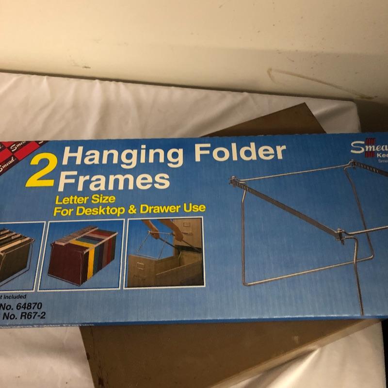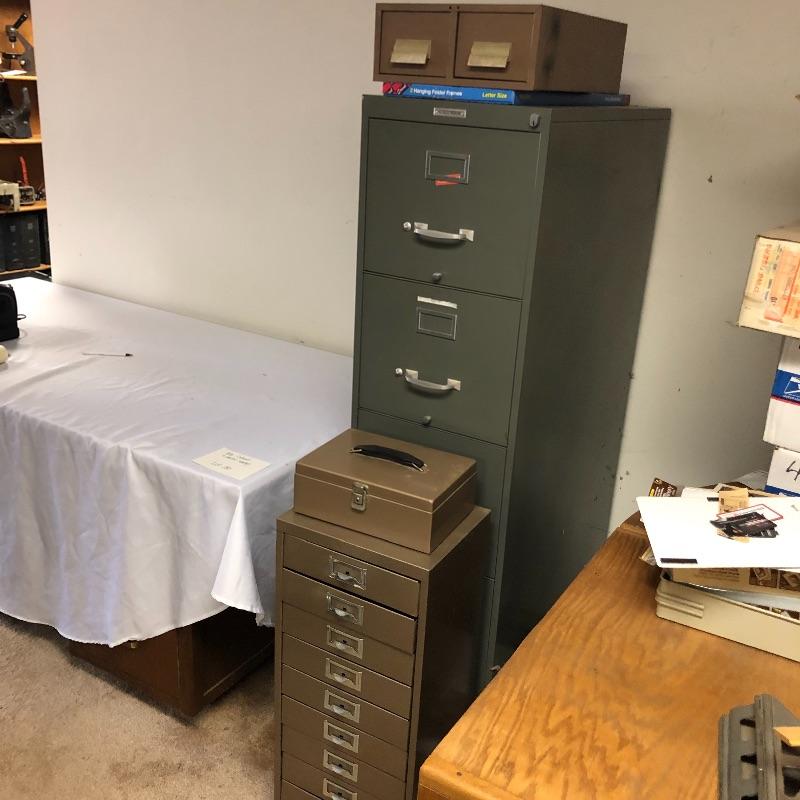 Lots of storage and filing solutions for your office in this lot. The five drawer metal filing cabinet will hold a lot of files. We have added some more metal storage units and 2 hanging folder frames, see images.