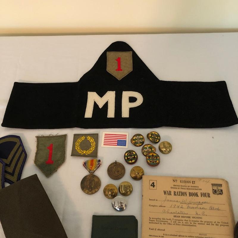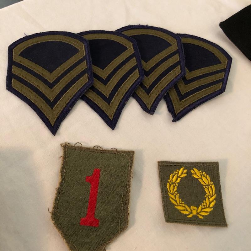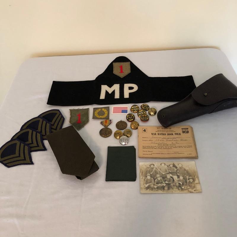 Such a wonderful assortment of military memorabilia from a World War II veteran. Included here is a leather holster, ration books, staff sargeant stripes, medals, badges, pins, two army fourragere and more.
