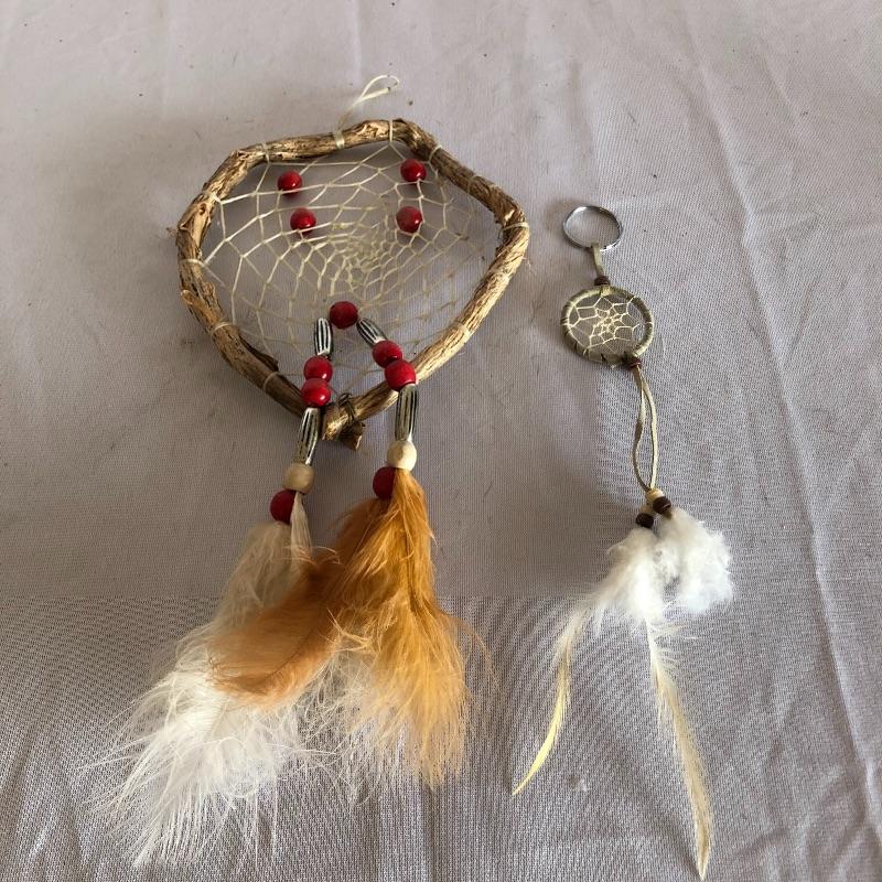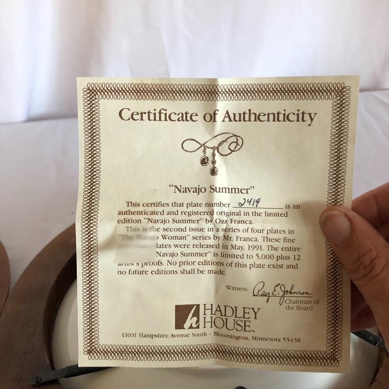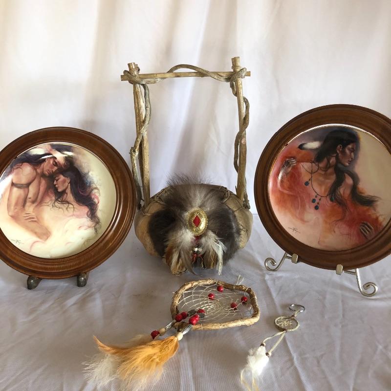 This lot includes two numbered Hadley House collector plates titled “The Lovers" and "Navajo Summer”and come with COAs. Also includes woven basket with beads and feathersand dream catchers.