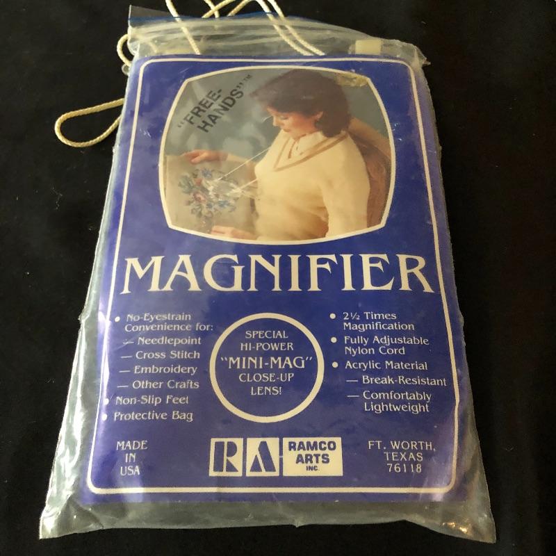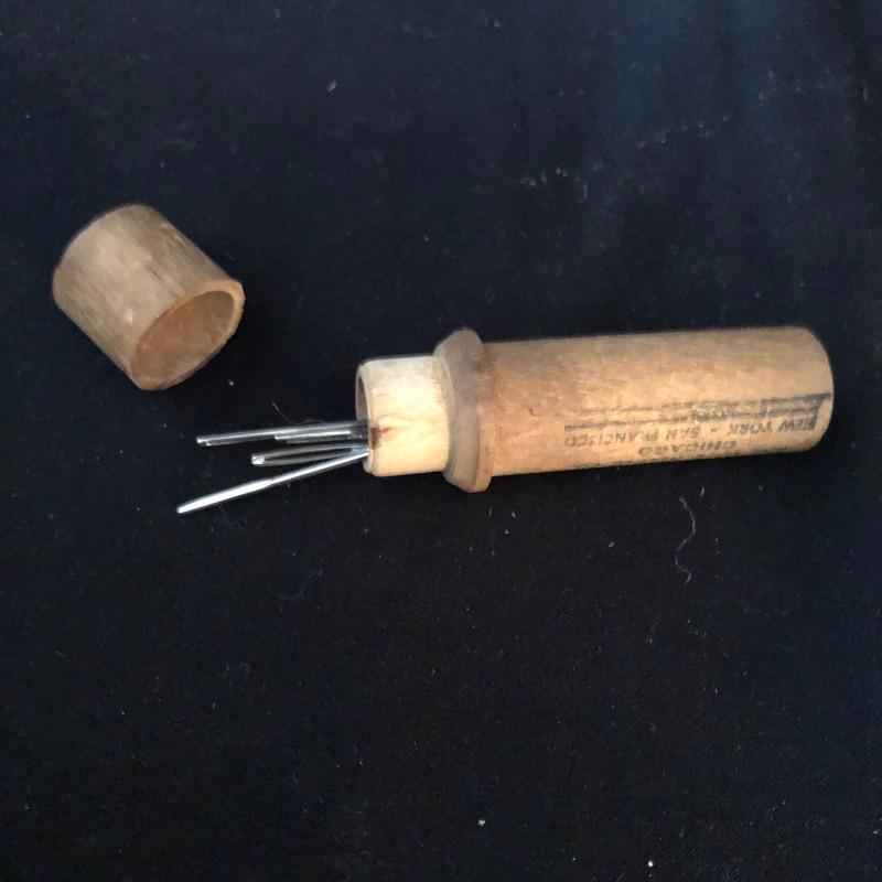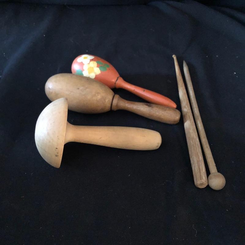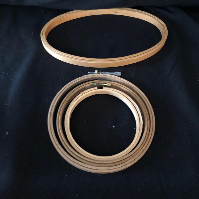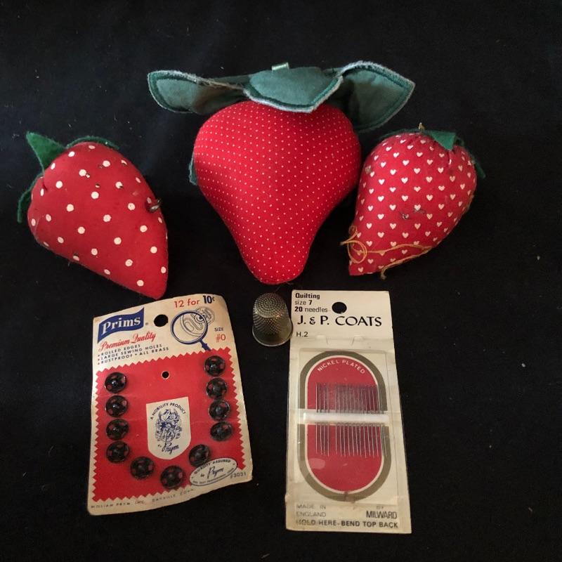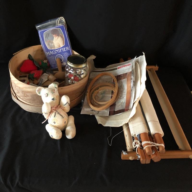 A nice array of needlepoint items. Lot includes darning tools, tapestry frames, jar of buttons, frames, magnifier, strawberry pin cushions, wooden spools, round wooden box and more. Round box measures 14.5”D x 5” tall.
