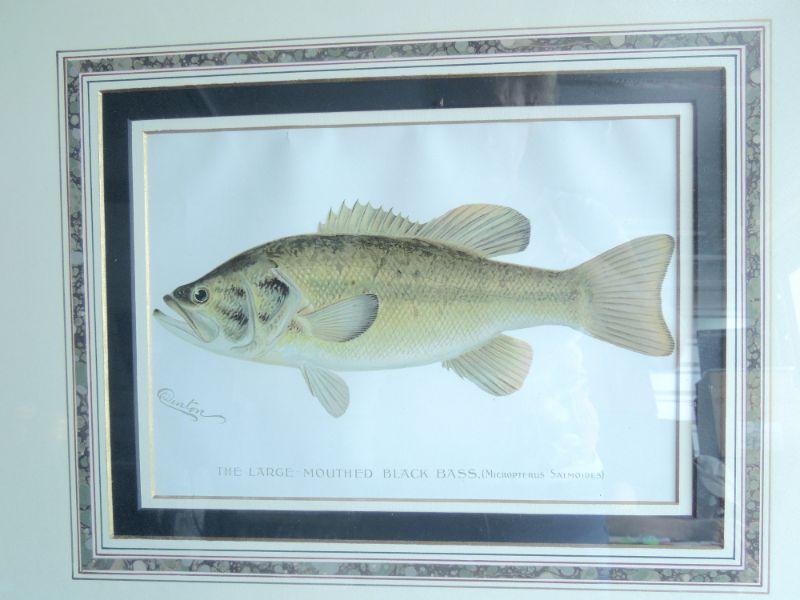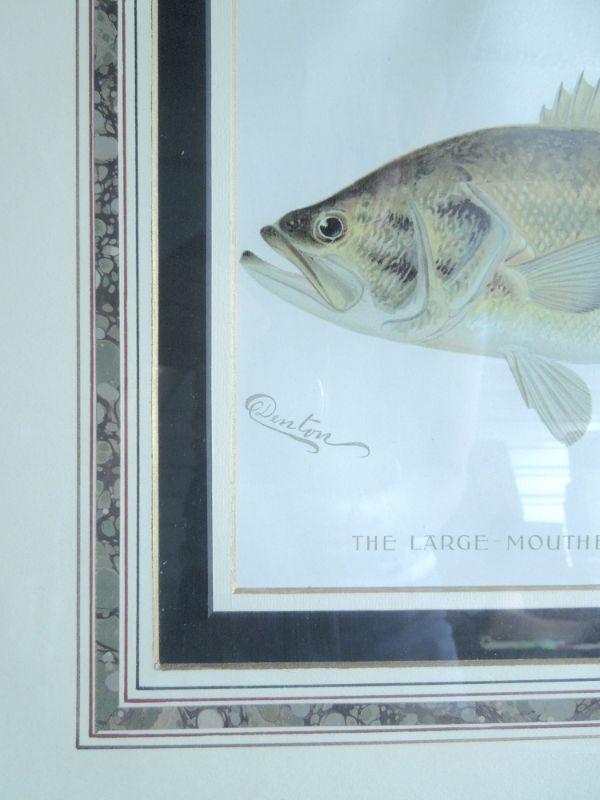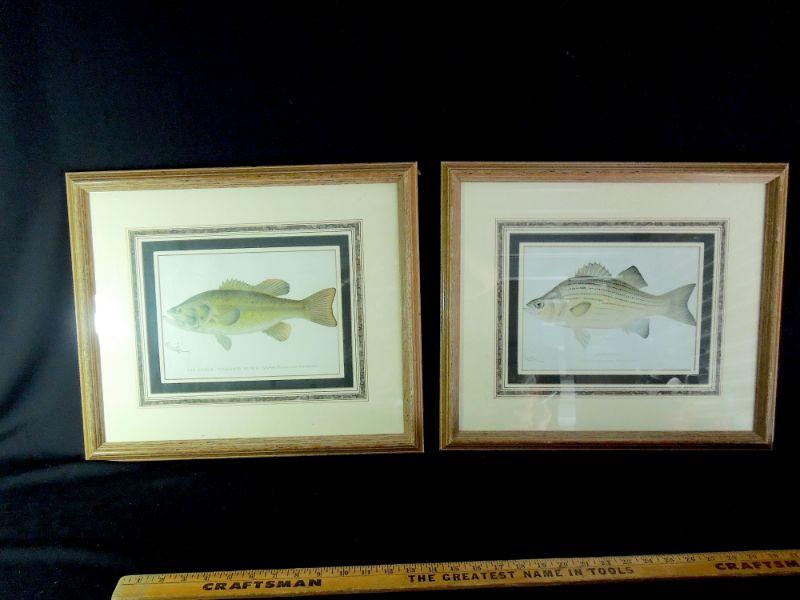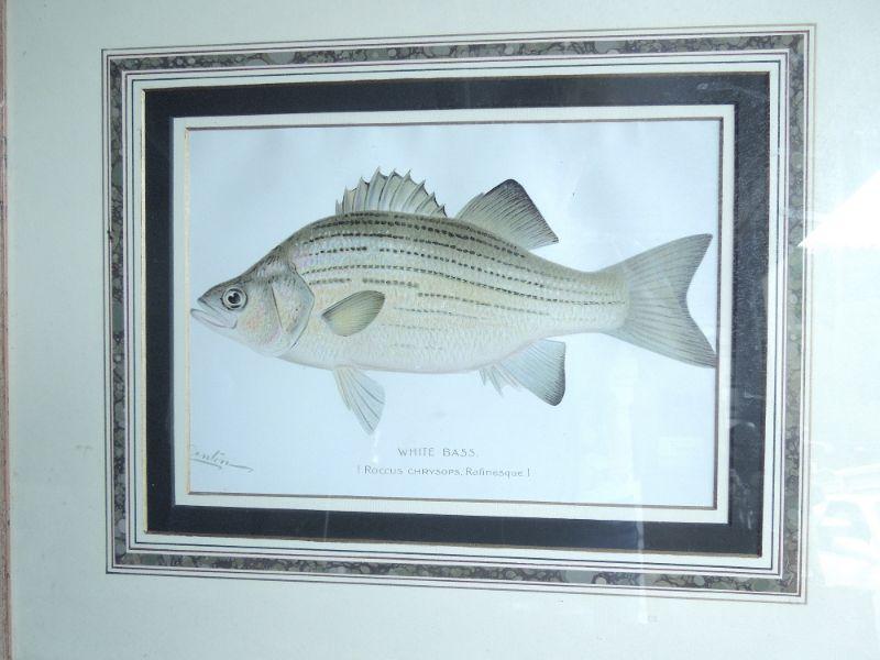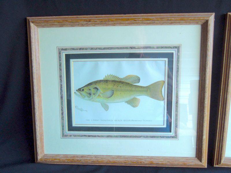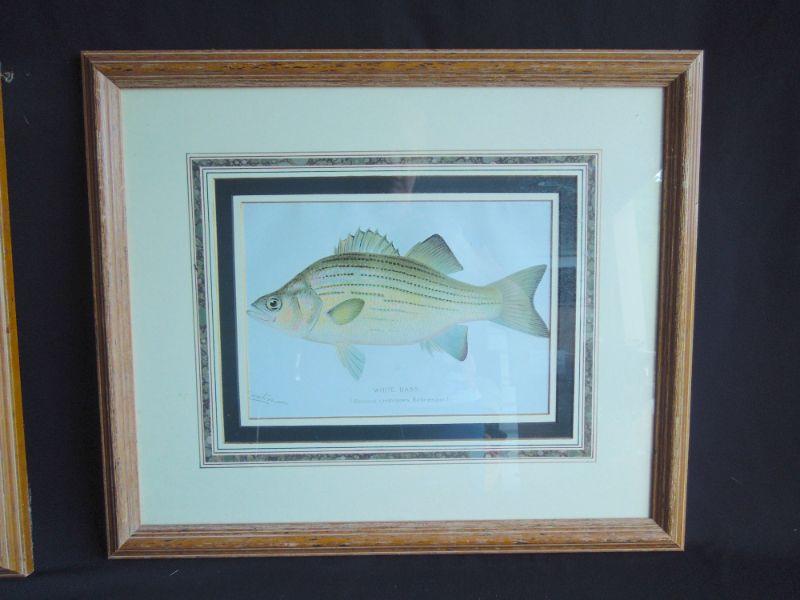 Large Mouth Black Bass and White Bass. Wonderful pair of original framed and superbly custom mounted vintage Sherman Denton folio fish prints from N.Y. Fish and Game Seventh Report 1902. 20" W x17" H. Wood frame under glass with colored intaglio paper matting. No sun damage. Pictures do not do these justice.