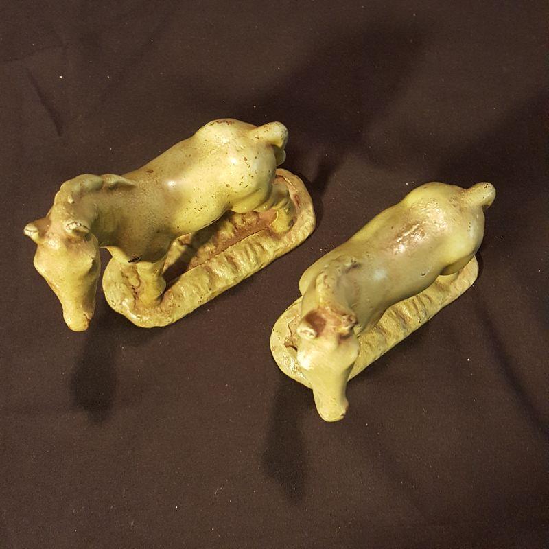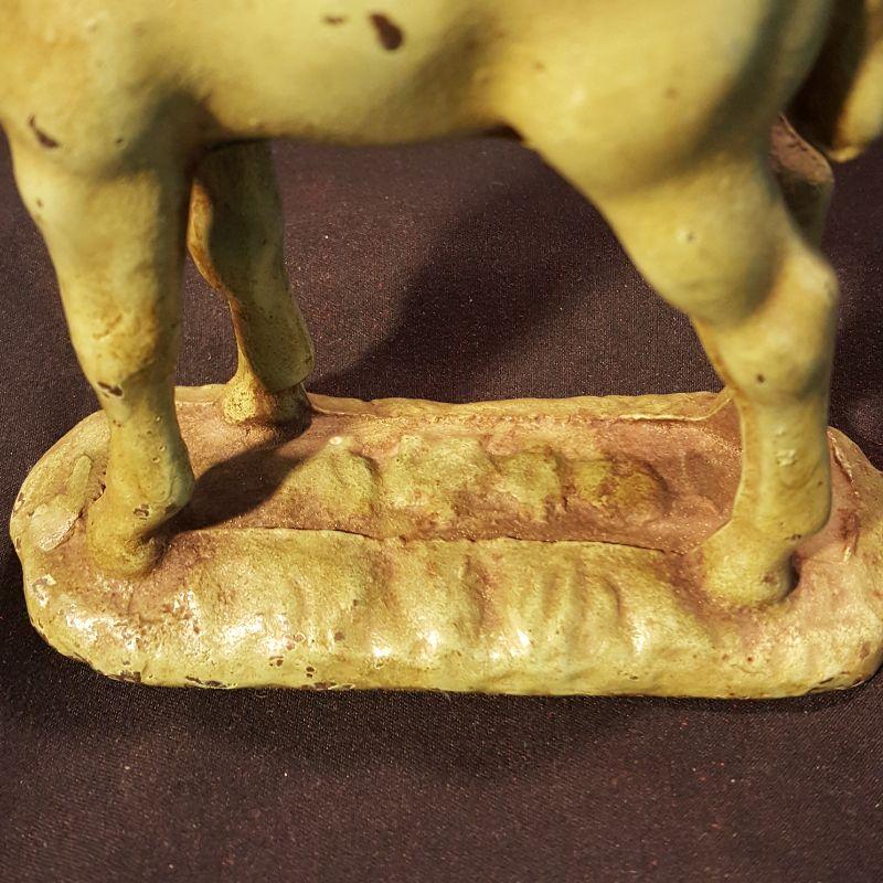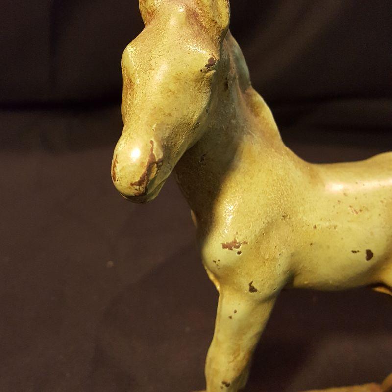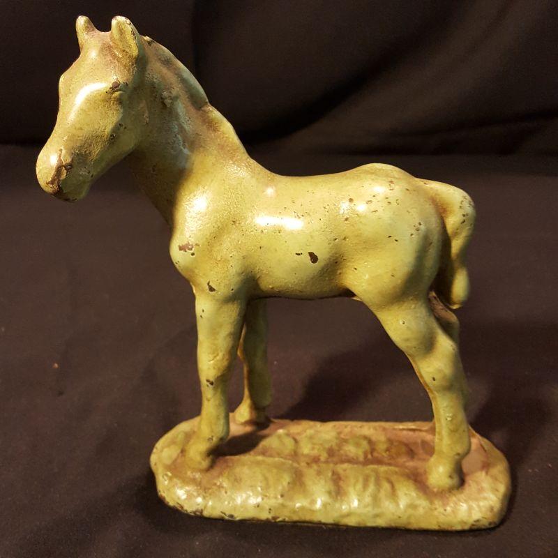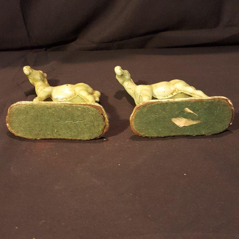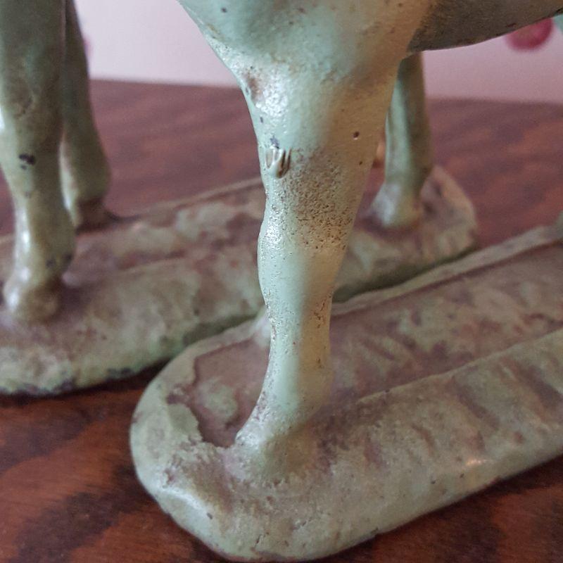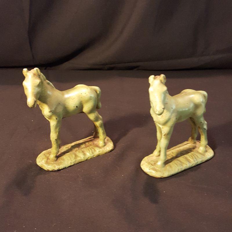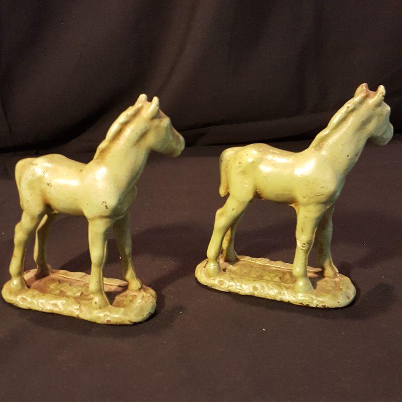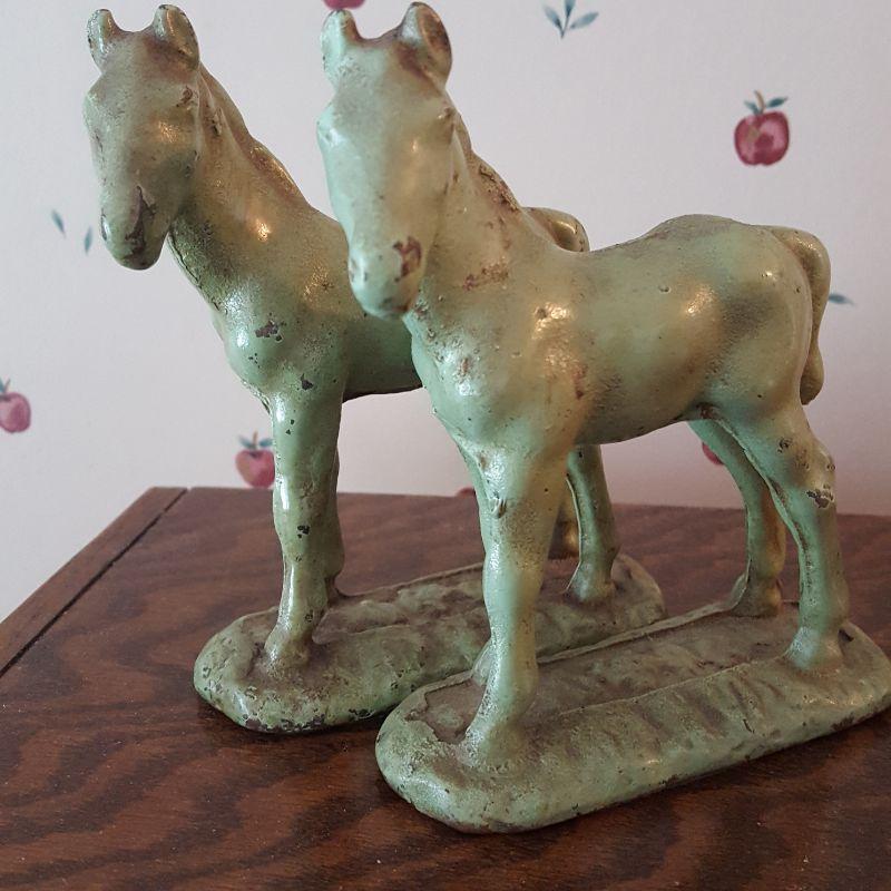 This identical pair of light green iron horses are adorable! Each piece is heavy to hold and measures 5x6 inches. They have a few nicks here and there with some rusting, but could really use a good cleaning to capture their spirit! The last two pictures show the best of their true color. See pictures for the finer details. Shipping available.