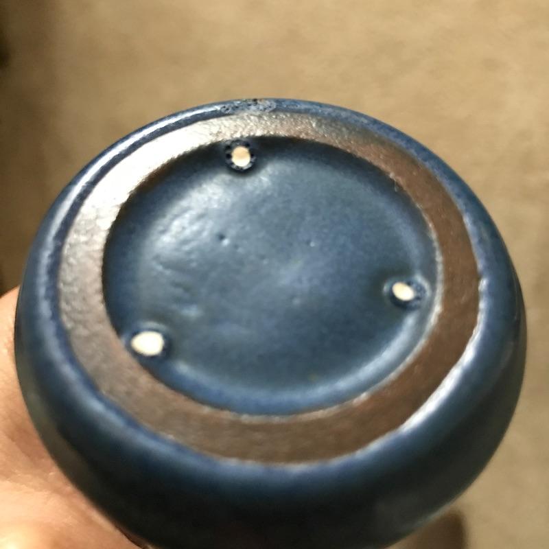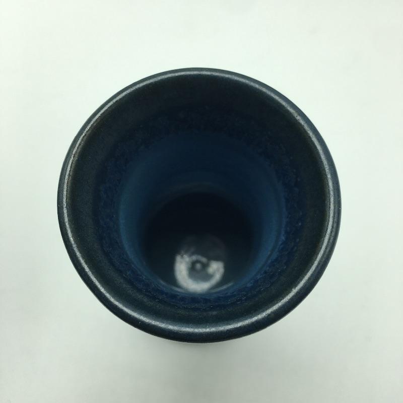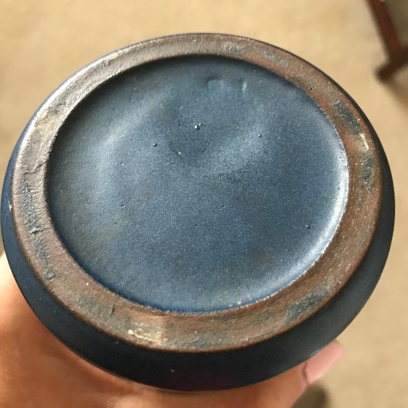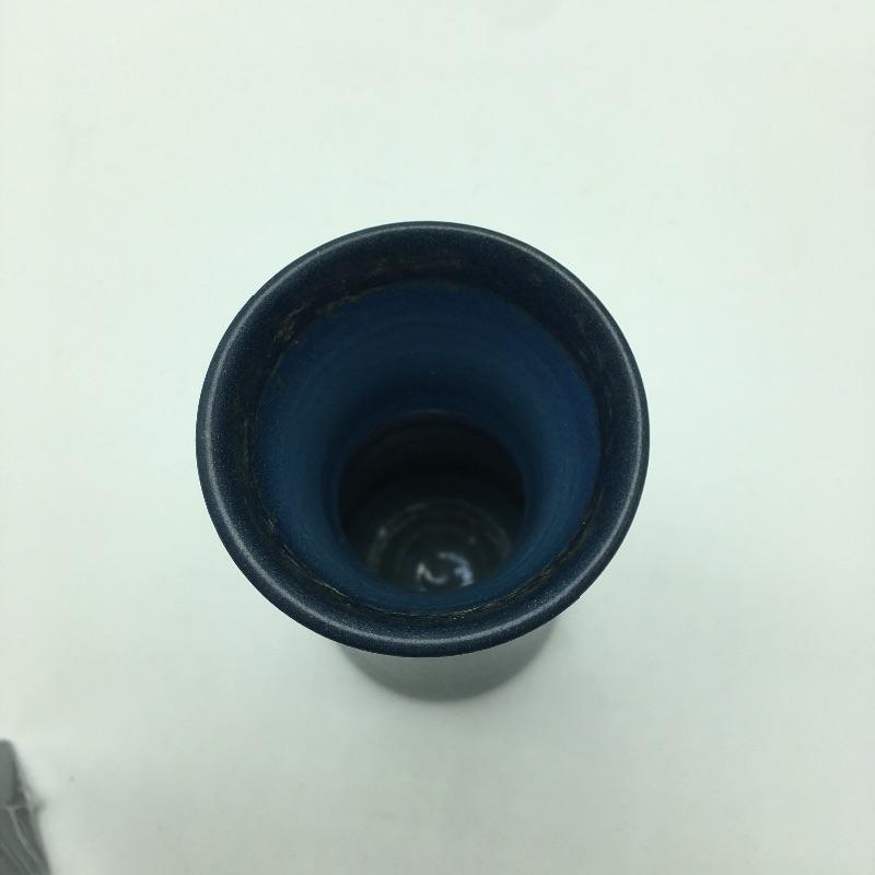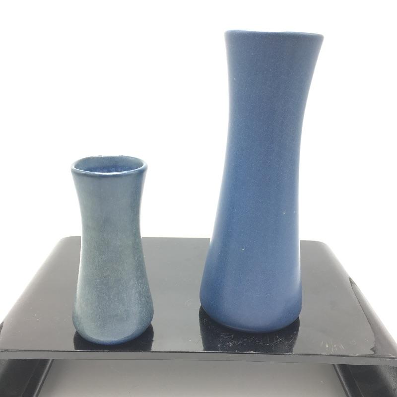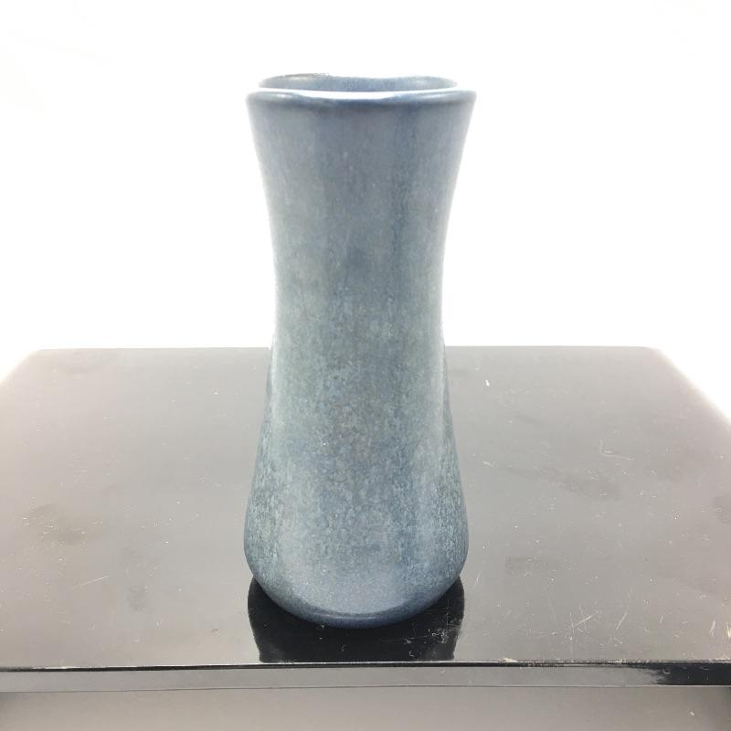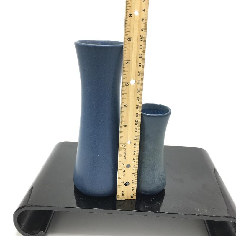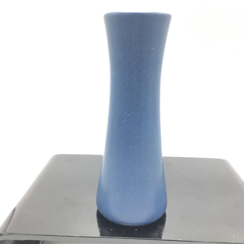 Here is a beautiful Marblehead Pottery undecorated tall vase in their classic hand thrown corset shape. It is covered in a smooth, even, dark matte blue glaze that they called "Marblehead Blue", with a pale robin's egg blue on the interior. The estate's executor, an Arts & Crafts expert, labels piece as Marblehead. Markings are unknown/not verified by Sterling Transitions. Largest vase measures 7.75” with a 3”D.