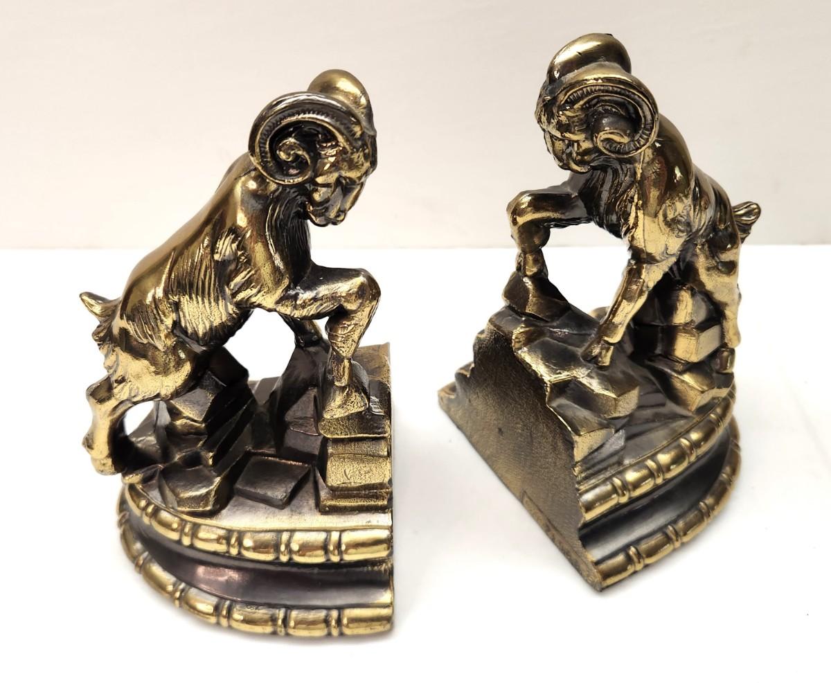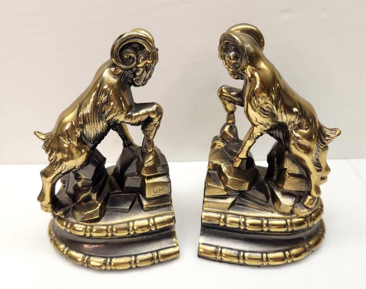 This set was made by S.C.C. Brass in 1974 - nice pair of big horn rams bookends - good condition. 8" x 5" x 5".