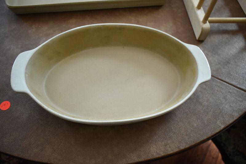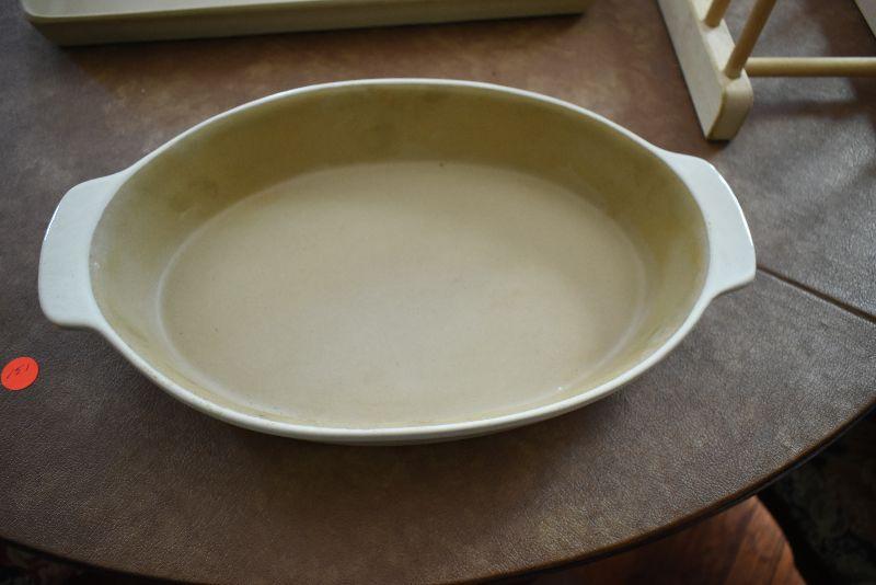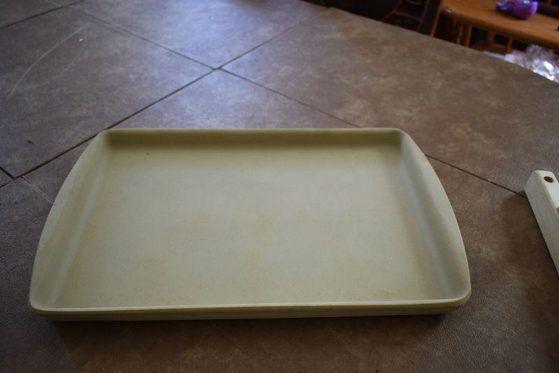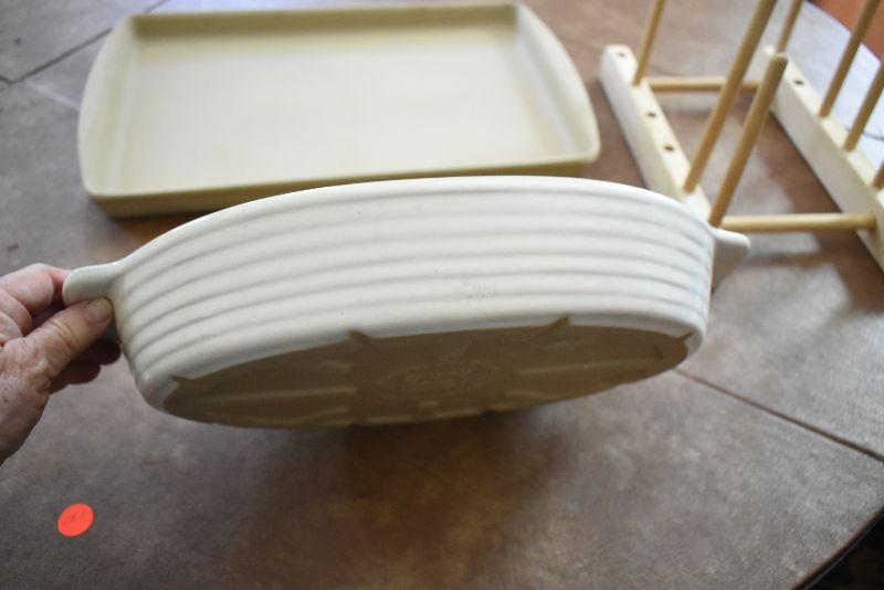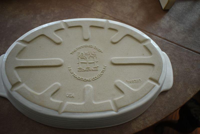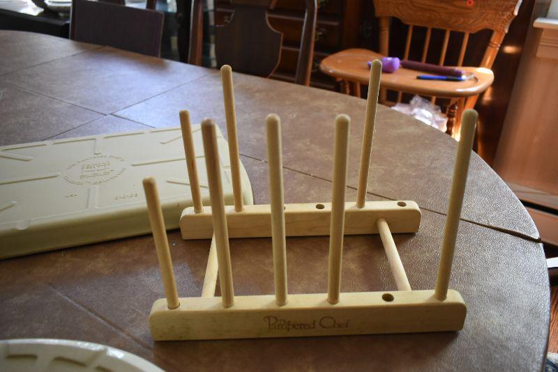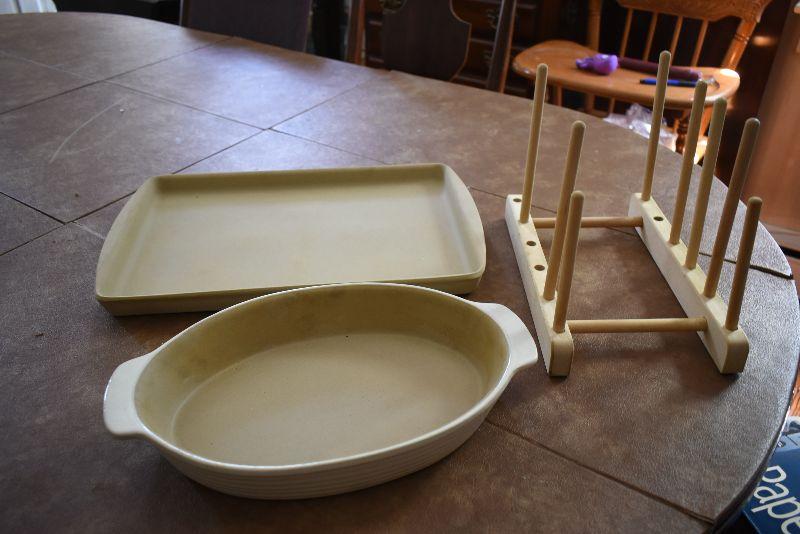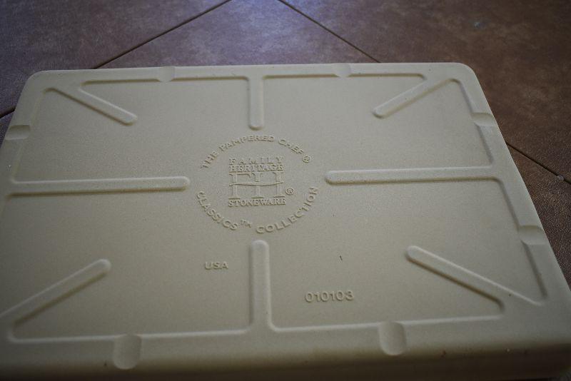Never used, Pampered Chef Jelly Roll sheet, a casserole, and a storage stand.