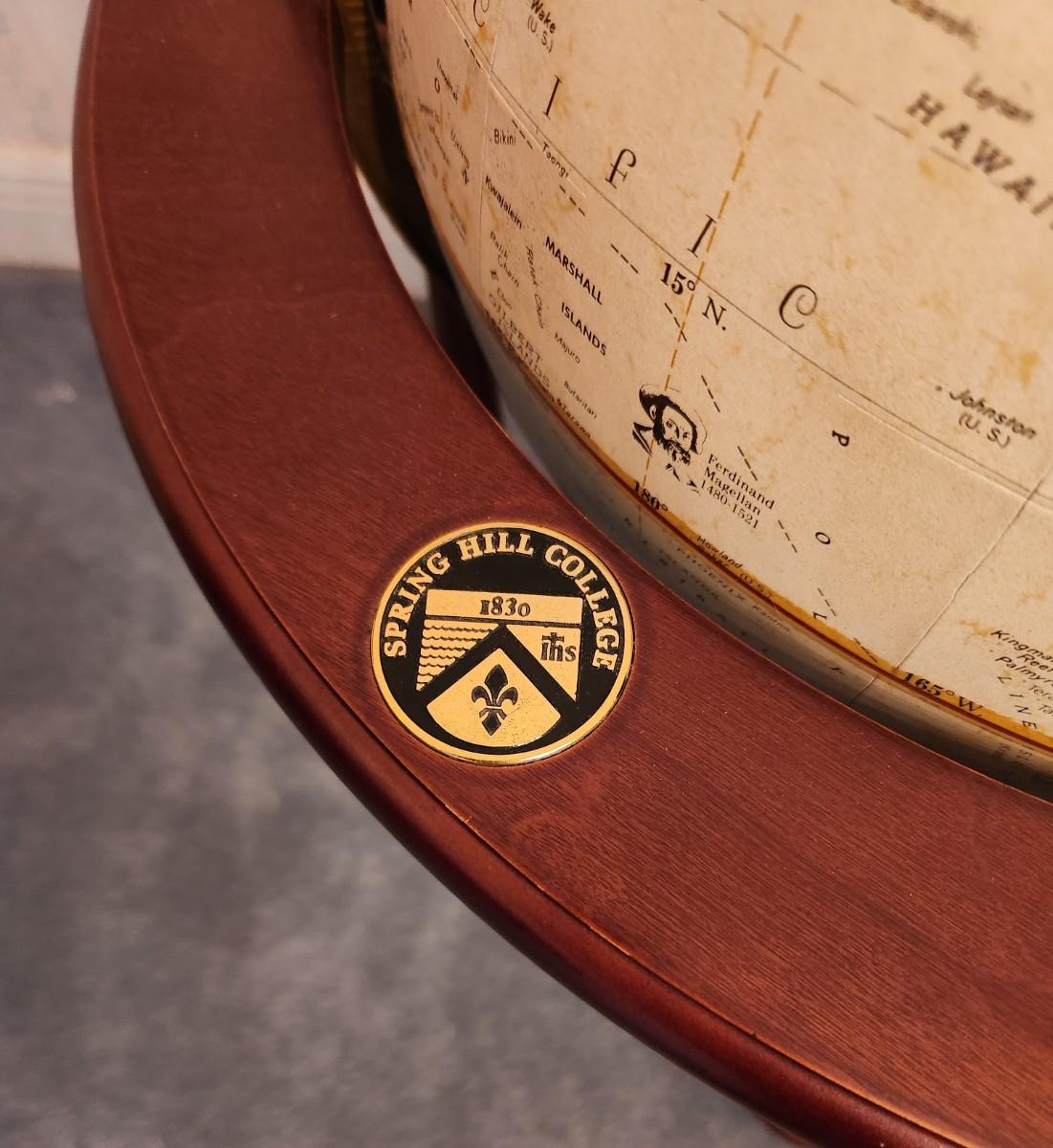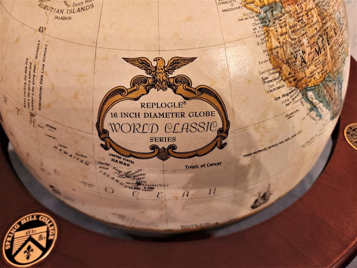 This great globe dates from before 1992 - sports a Spring Hill College (Alabama) seal on the frame - from great maker REPOGLE. 16" diameter, about 32" tall, 22" across. Great condition.