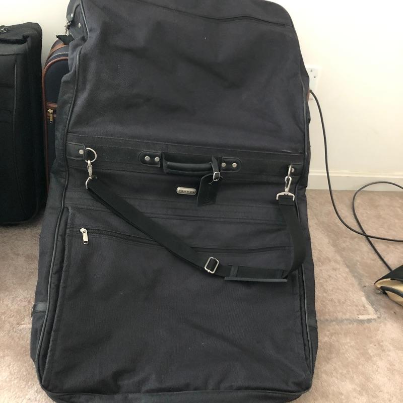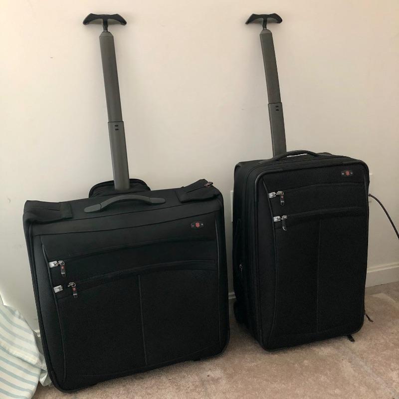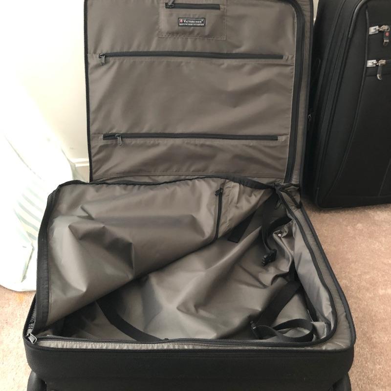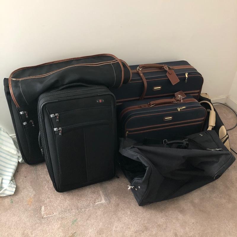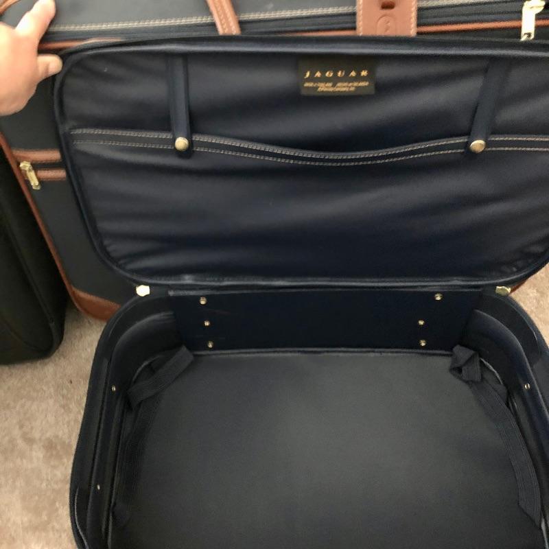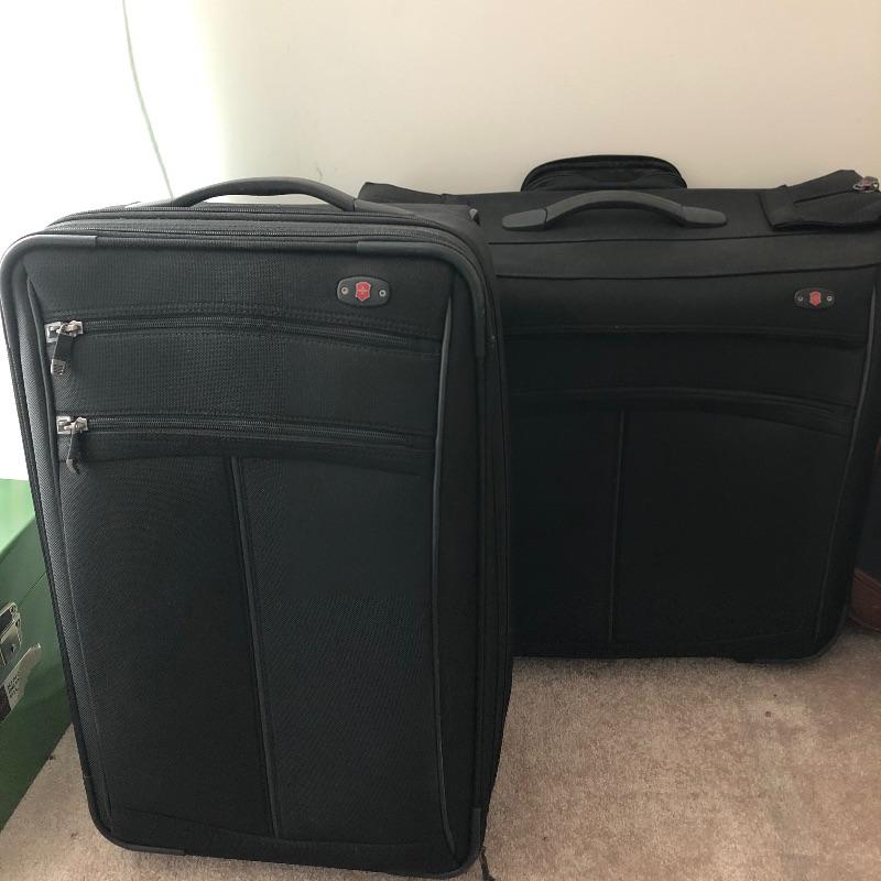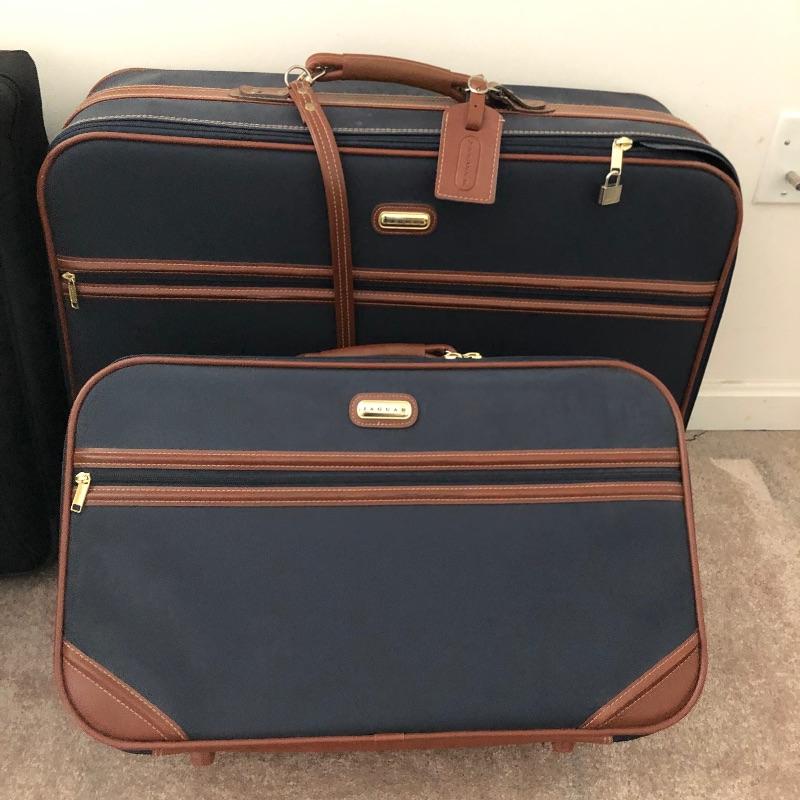 Two matching black wheeled pieces by Victorinox. Nice and sturdy with pull out handles. We have thrown in a couple of blue Jaguar suitcases, two nice garment bags and a smaller ivory accented rolling duffel bag as well.