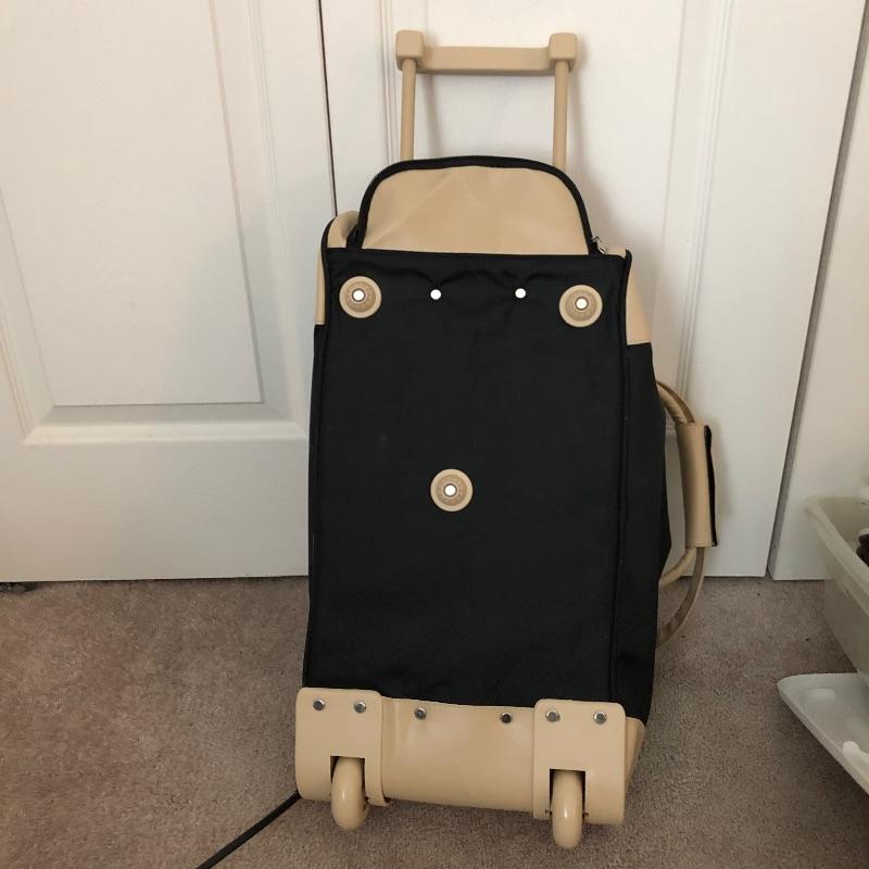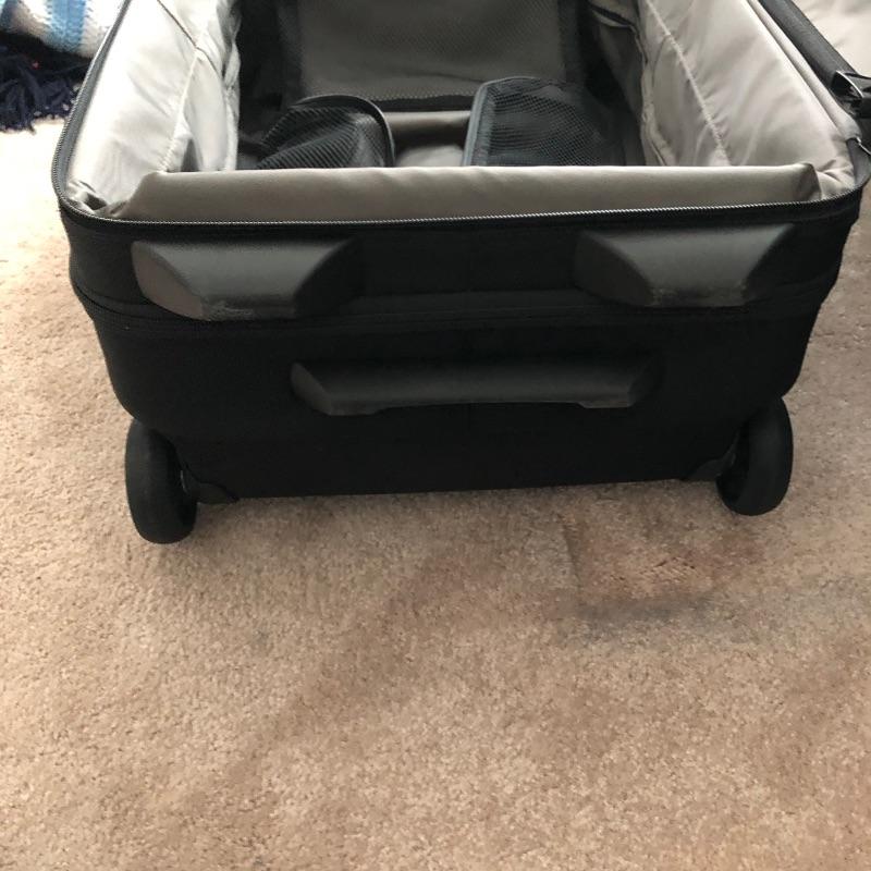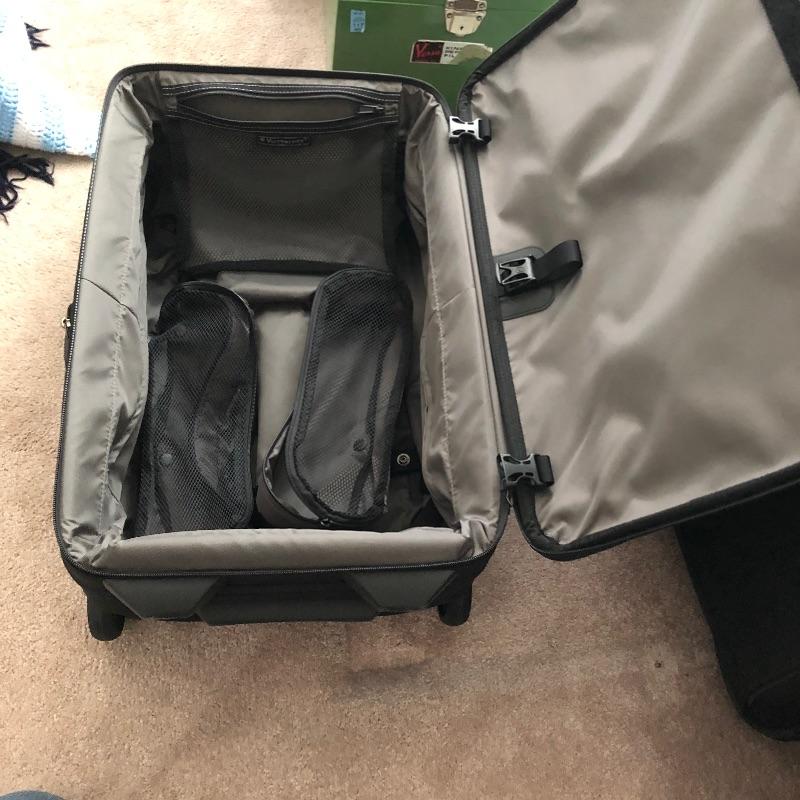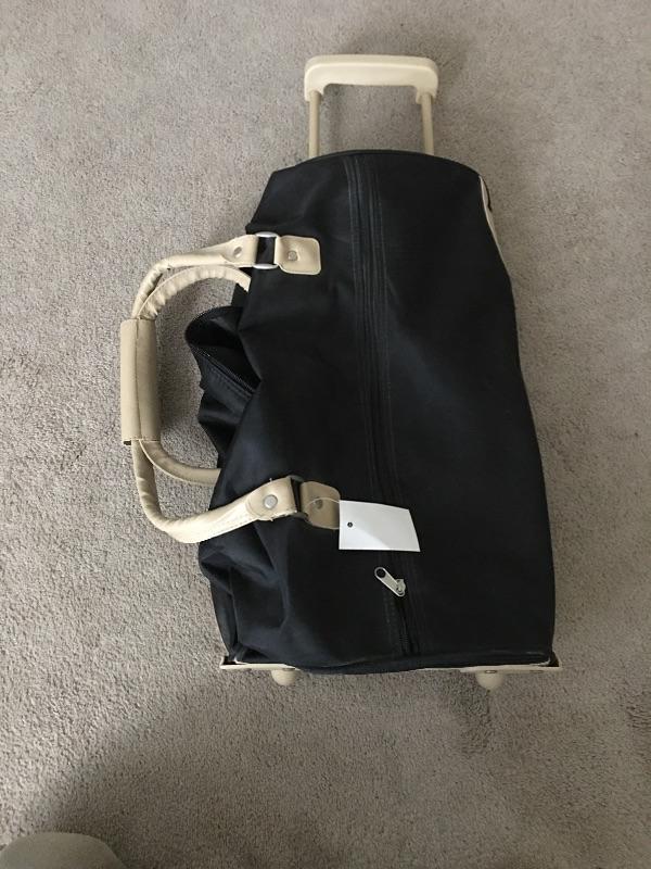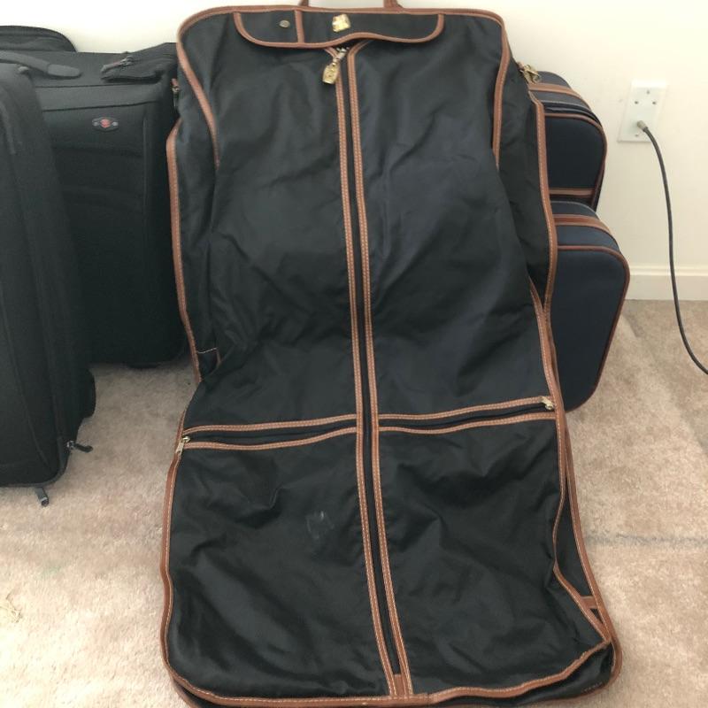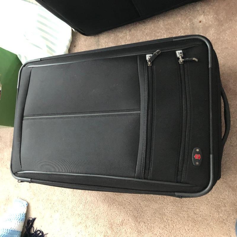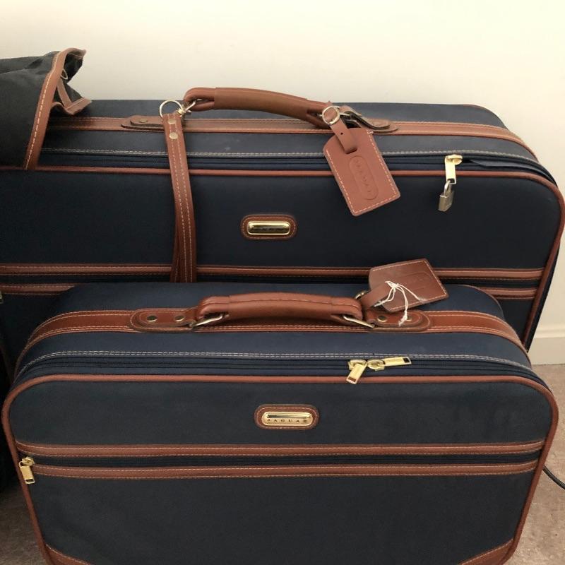 Two matching black wheeled pieces by Victorinox. Nice and sturdy with pull out handles. We have thrown in a couple of blue Jaguar suitcases, two nice garment bags and a smaller ivory accented rolling duffel bag as well.