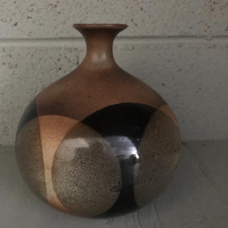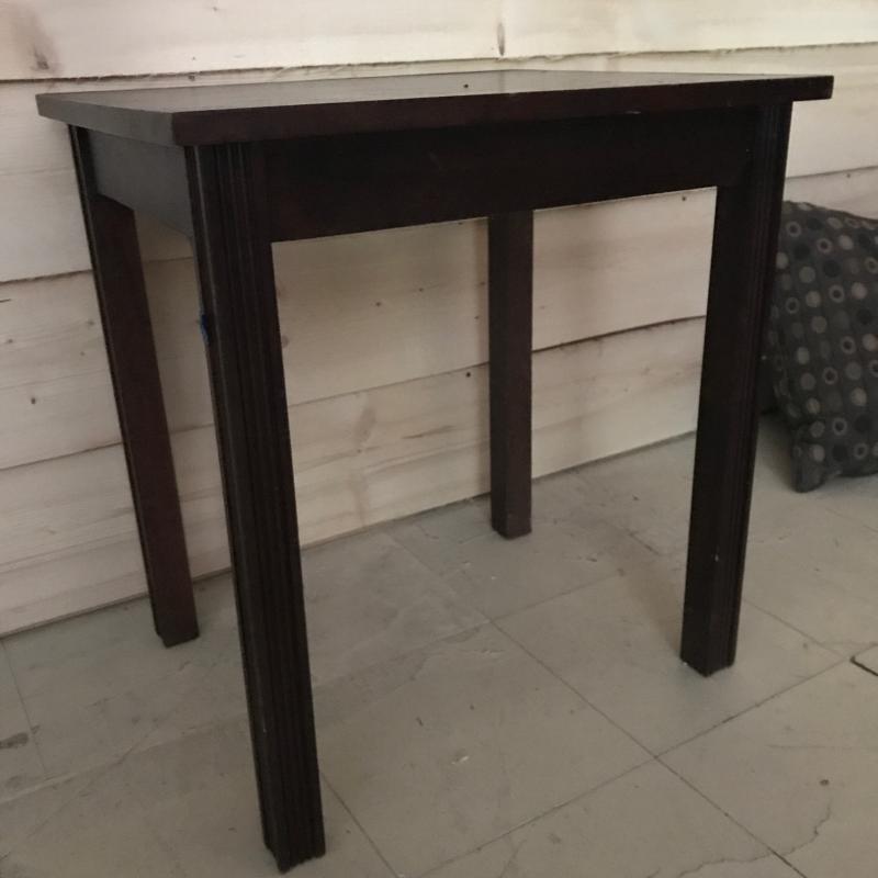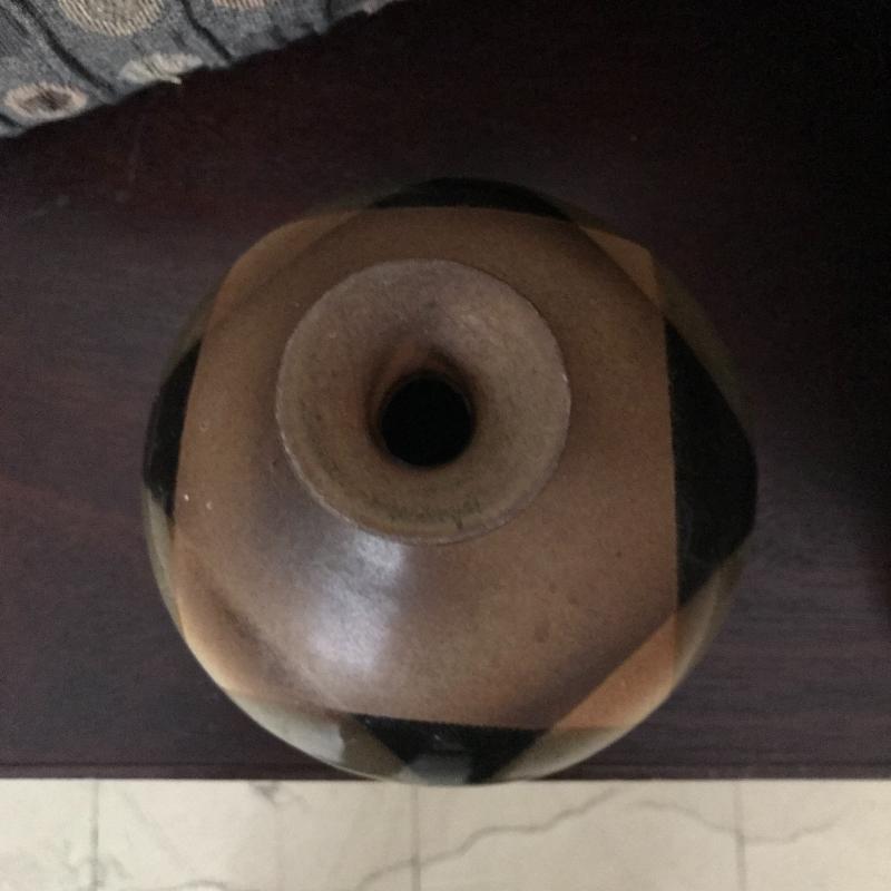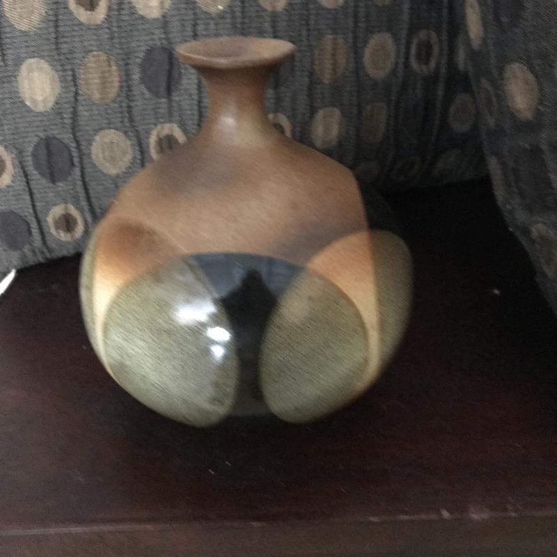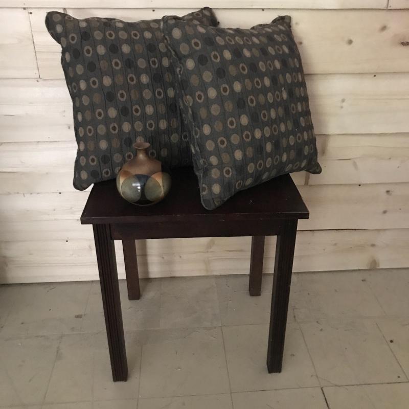 Lot includes MCM design vase 6”d x 7”h. Dark brown wood table 24.5” x 20.5” x 26.5”h. Also includes two matching 21”square pillows. No shipping. Local pick up only in Maggie Valley, NC.