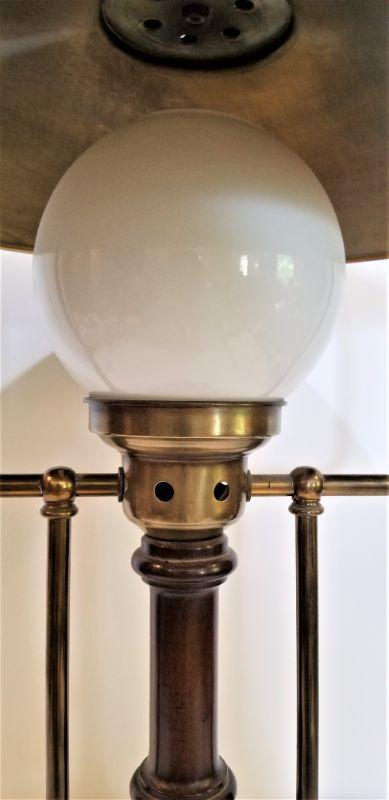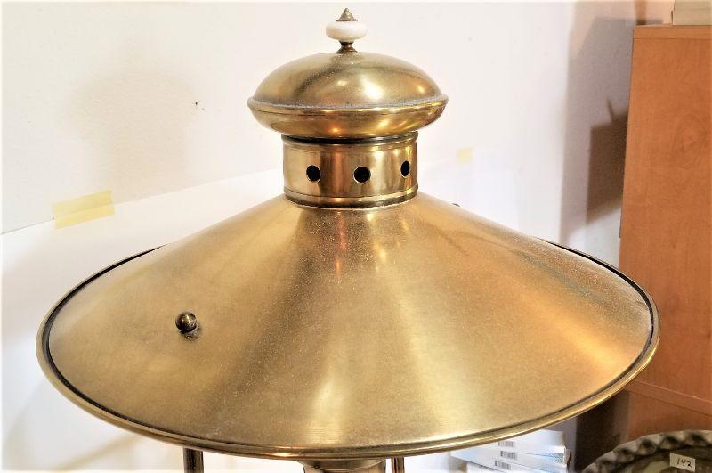 This attractive lamp works great and has classic styling - good condition and stands 30" tall. Brass shade is 20" across.