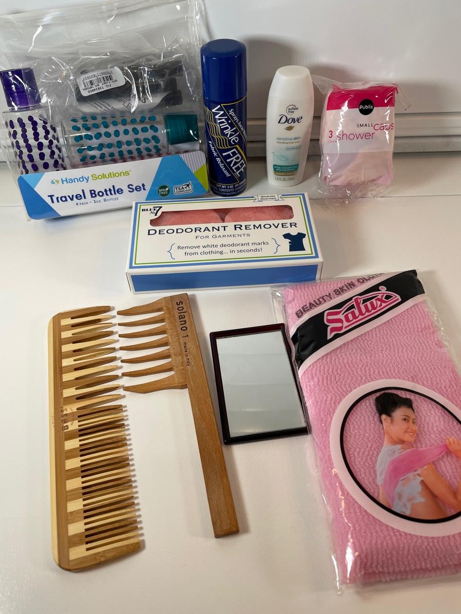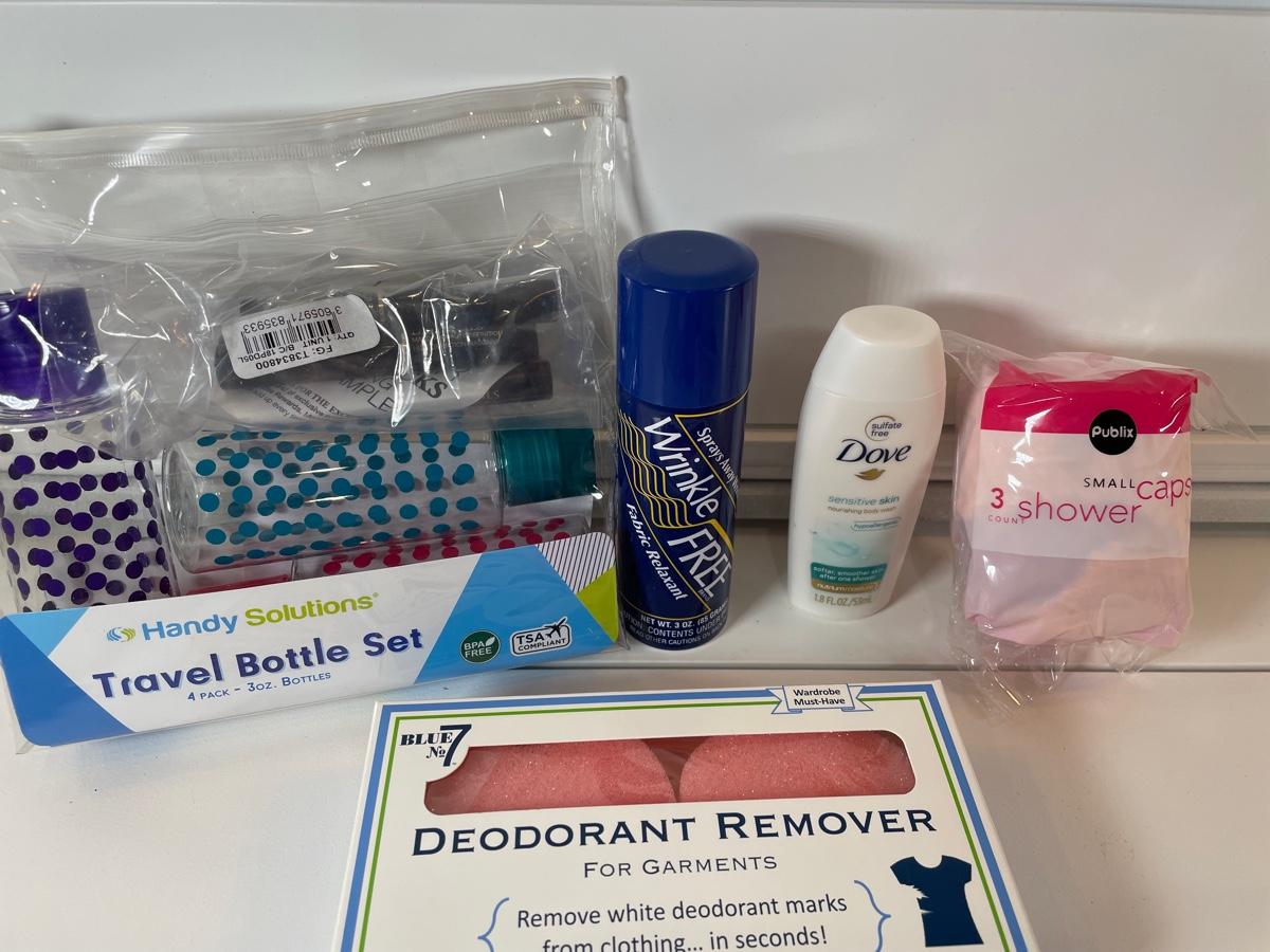 Travel bottle set, travel size Wrinkle Free, Dove body wash, an unopened 3-pack of shower caps, bath scrubber and deodorant remover