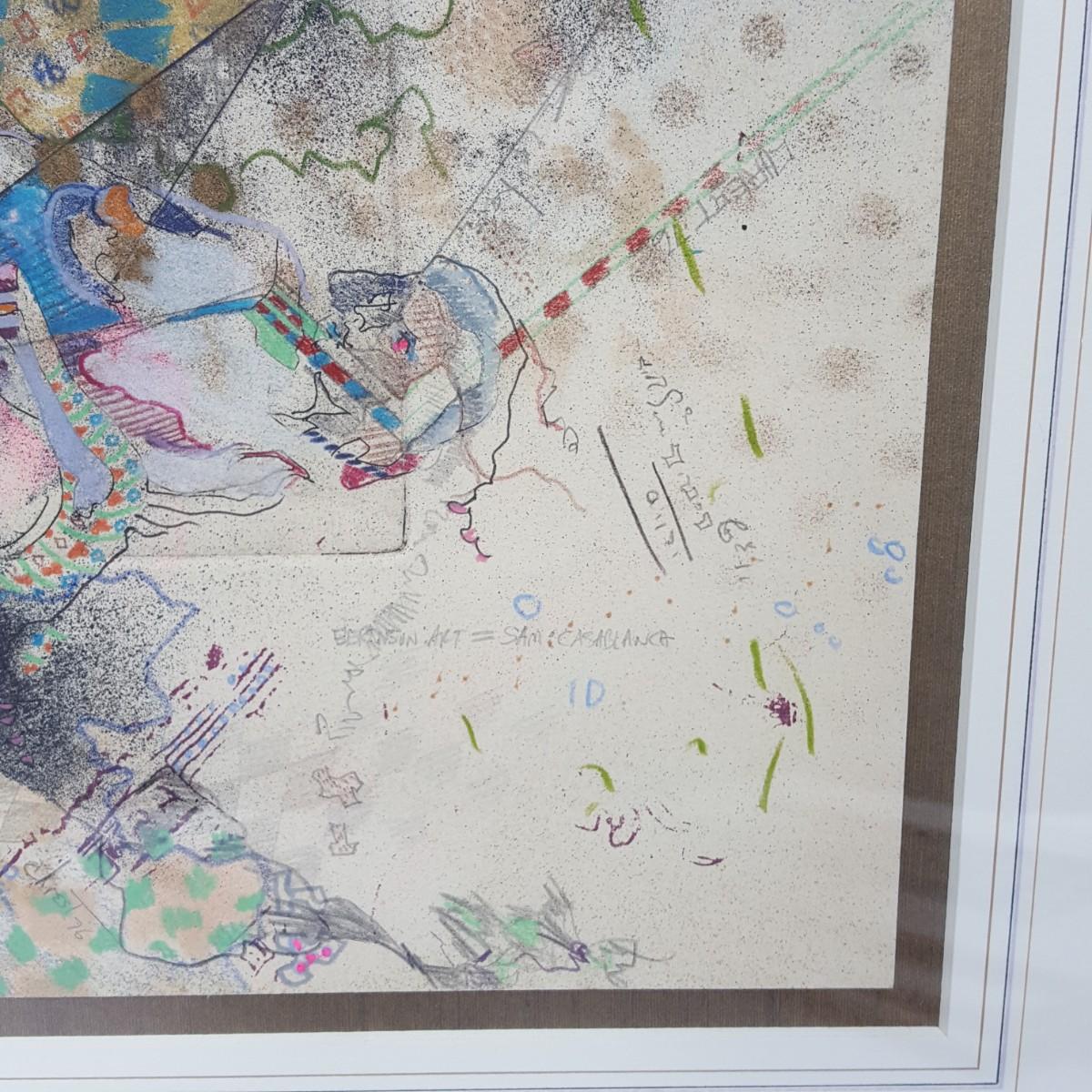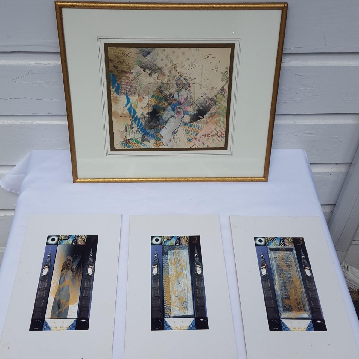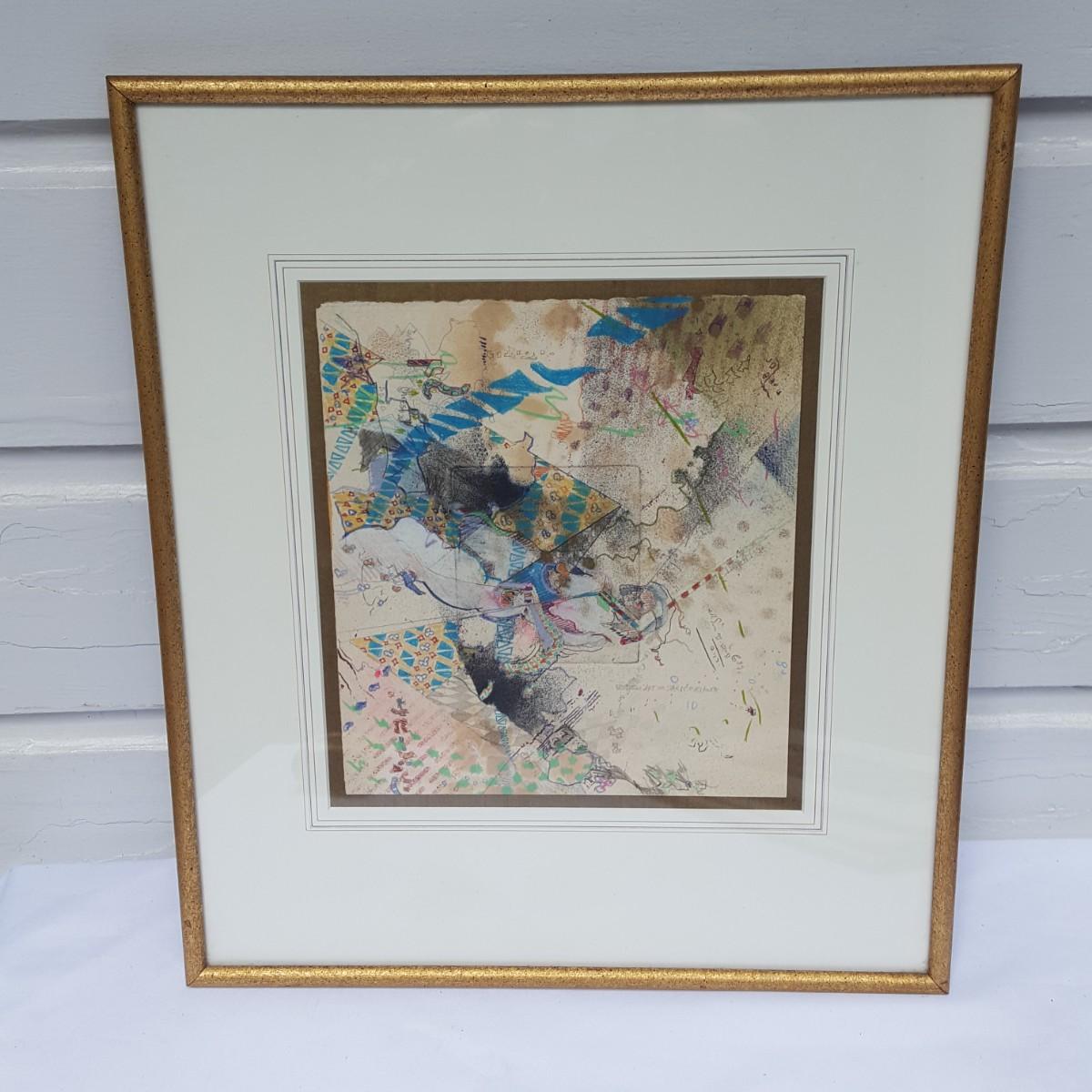 Truly, this piece is one of a kind. This piece is pencil and colored pencil and measures 20x17x1/2 inches. It is framed in a gold fleck with white matting. There are several names on the artwork so it is unsure of who the artist exactly is. This lot also contains 3 similar art pieces on foam boarding that measure 14x8 1/2 inches. Shipping available
