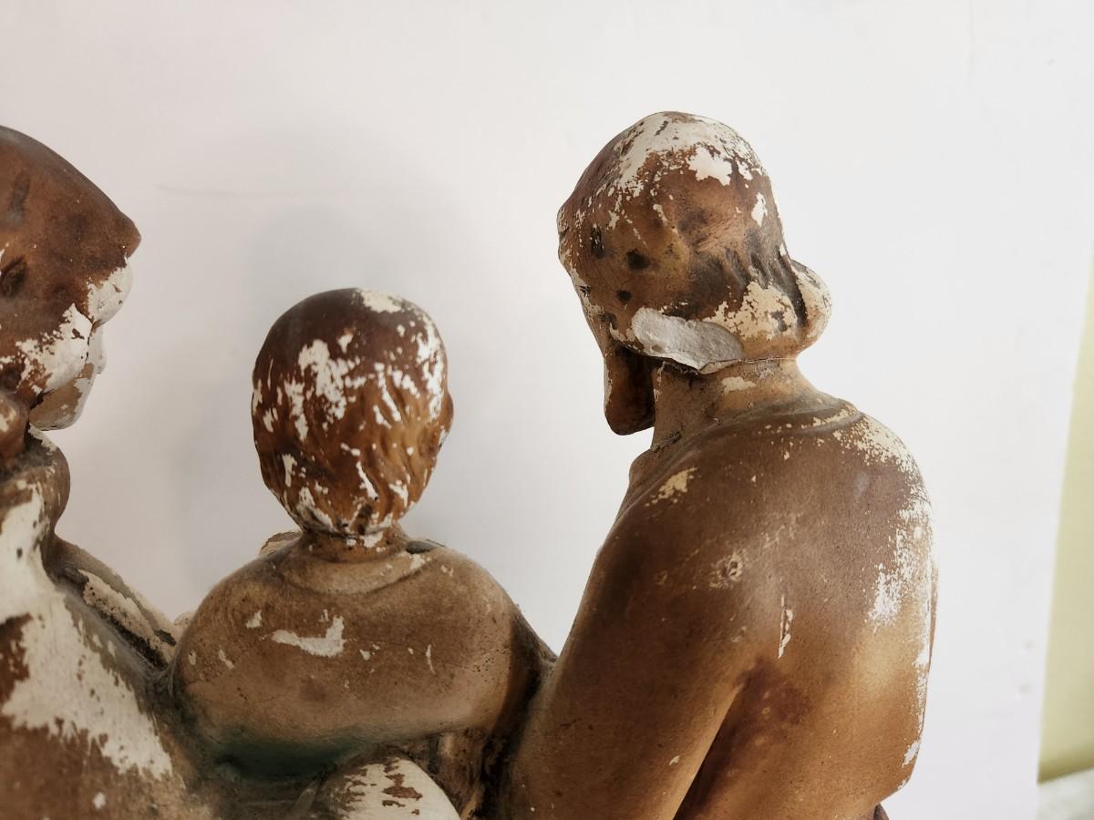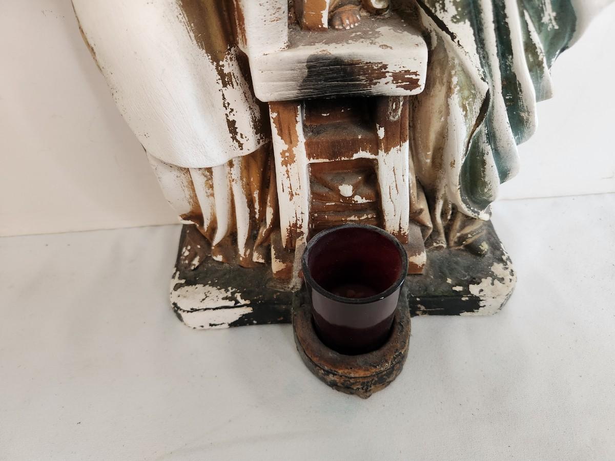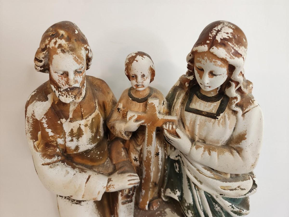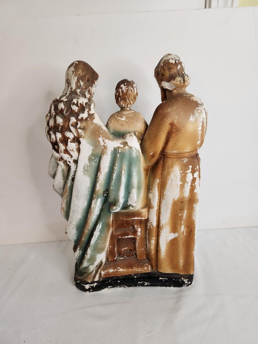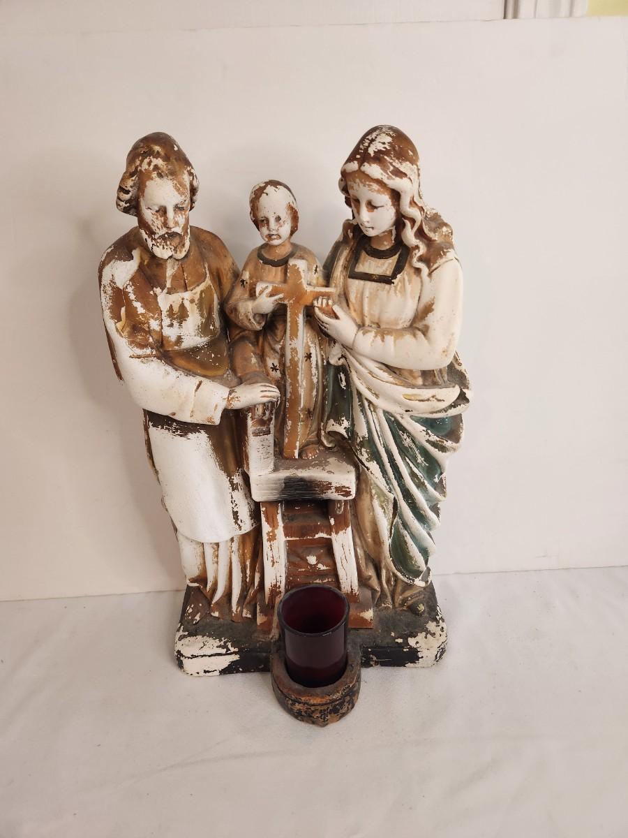 Chippy, shabby chic vintage chalkware Holy Family Shrine with spot for votive candle. St. Joseph has chip to the back of the head (pictured - not terrible). Probably from the 40's or 50's. 17" tall, 9.5" across.