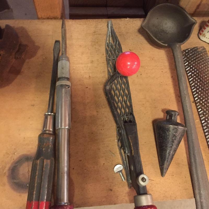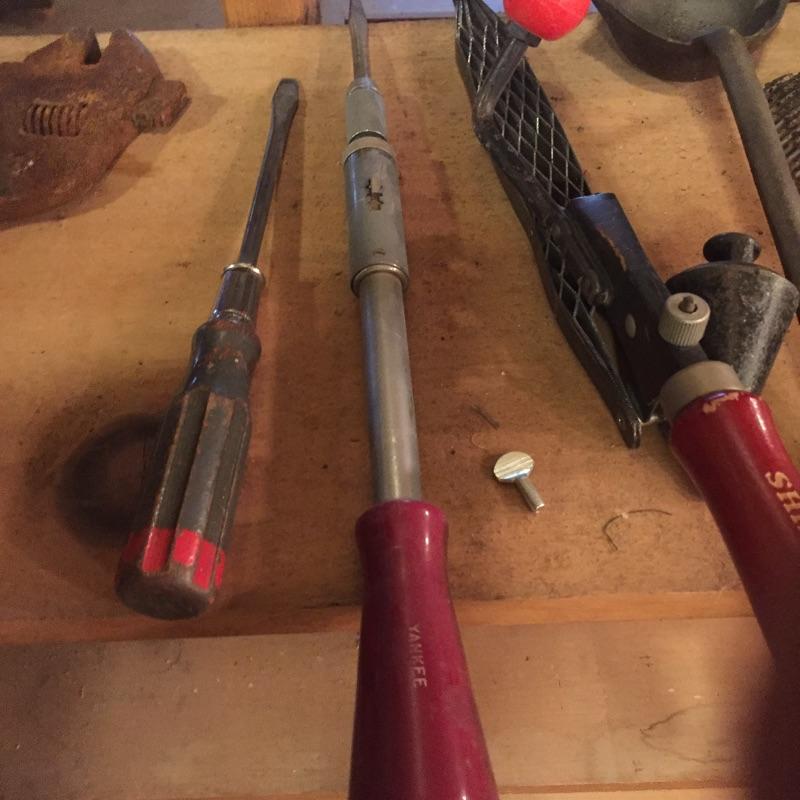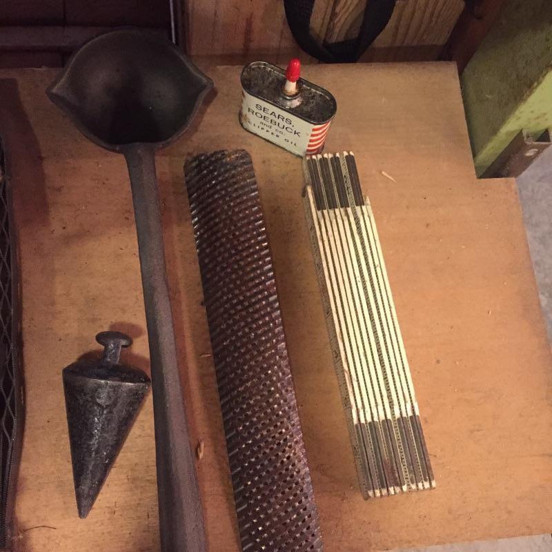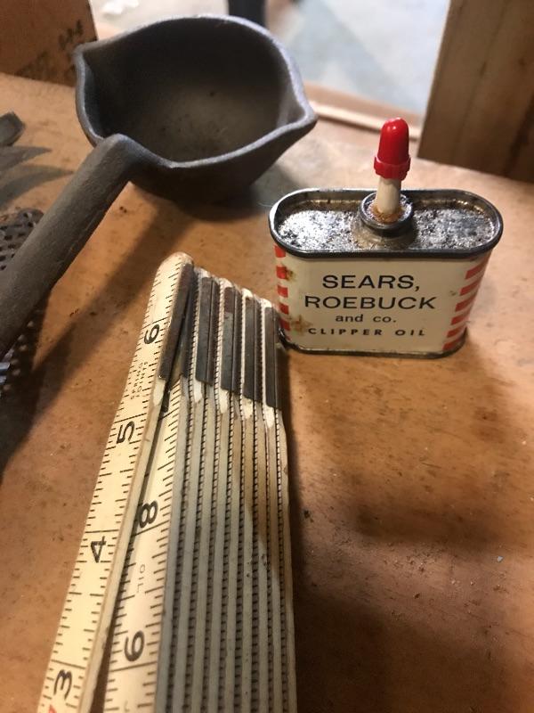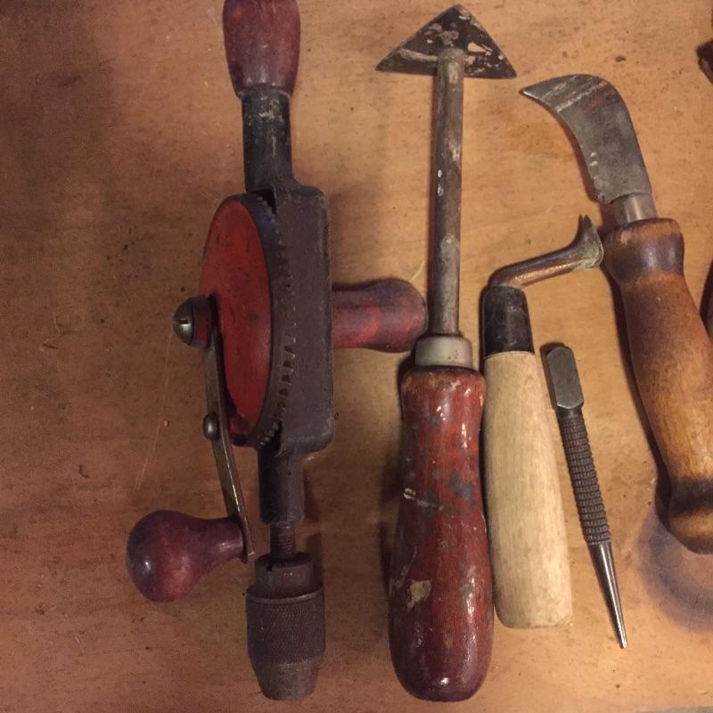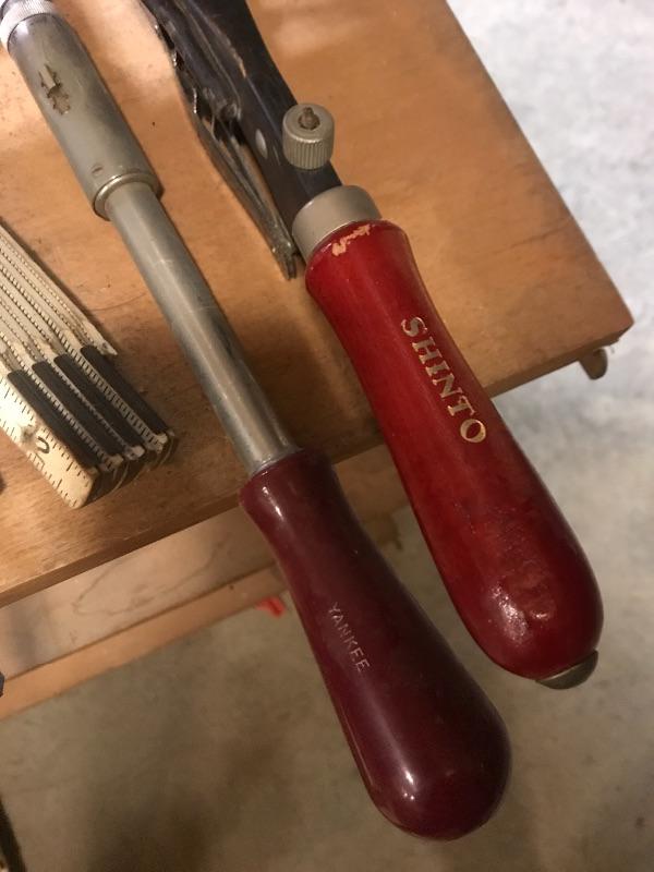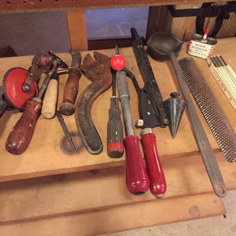 Selection of vintage hand tools including hand drill , ratcheting screwdriver, rasp and more. Even a tiny Sears Oil Can. You don’t need to electricity to use these tools. Shinto and Yankee wood handled tools included.