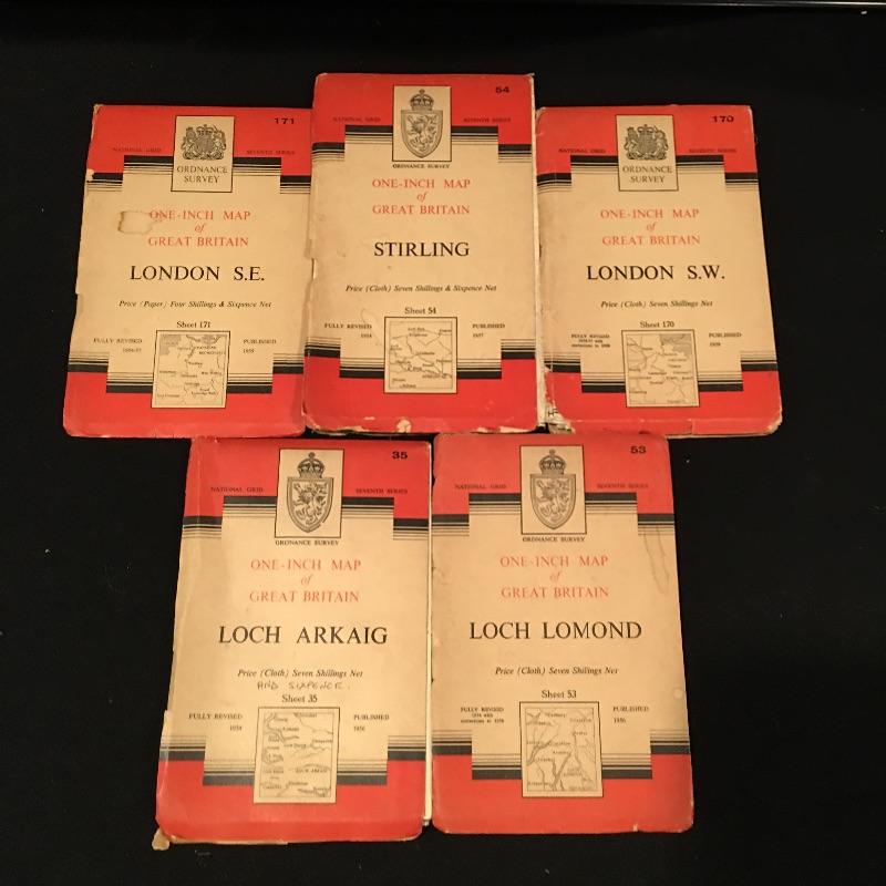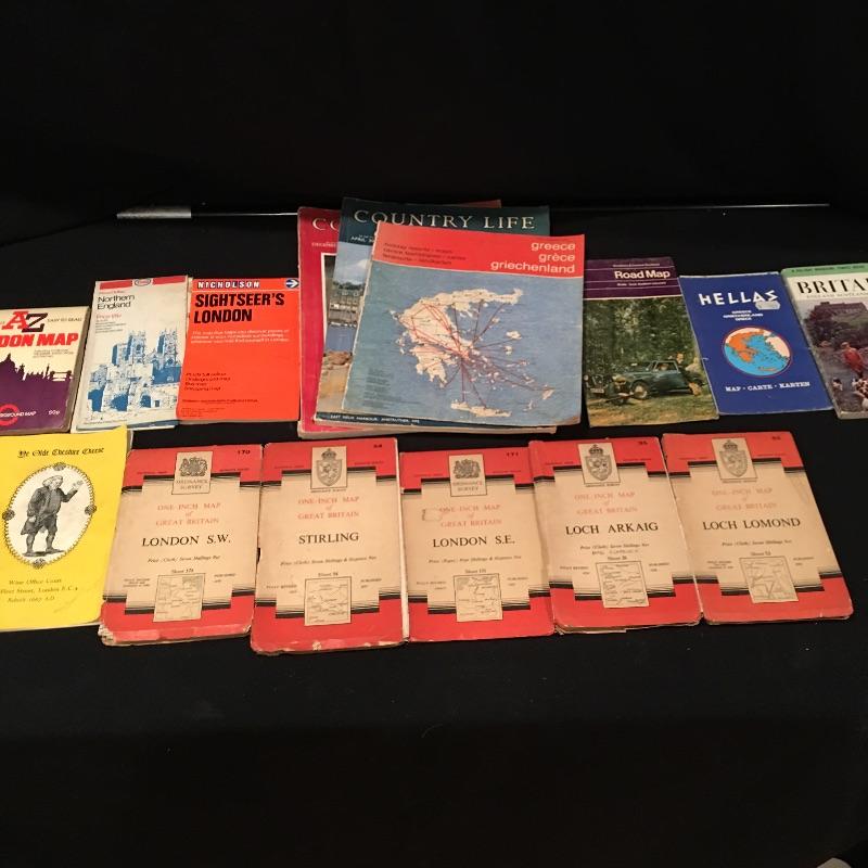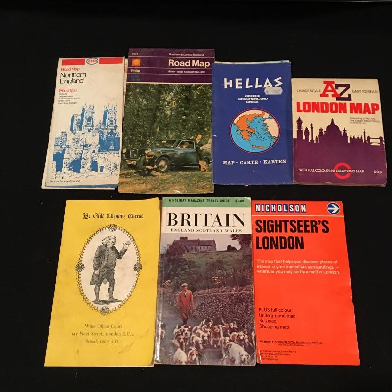 Collection of vintage maps and two sightseeing books Most maps are of England and London with two maps from Greece. You don’t see these papers maps anymore.