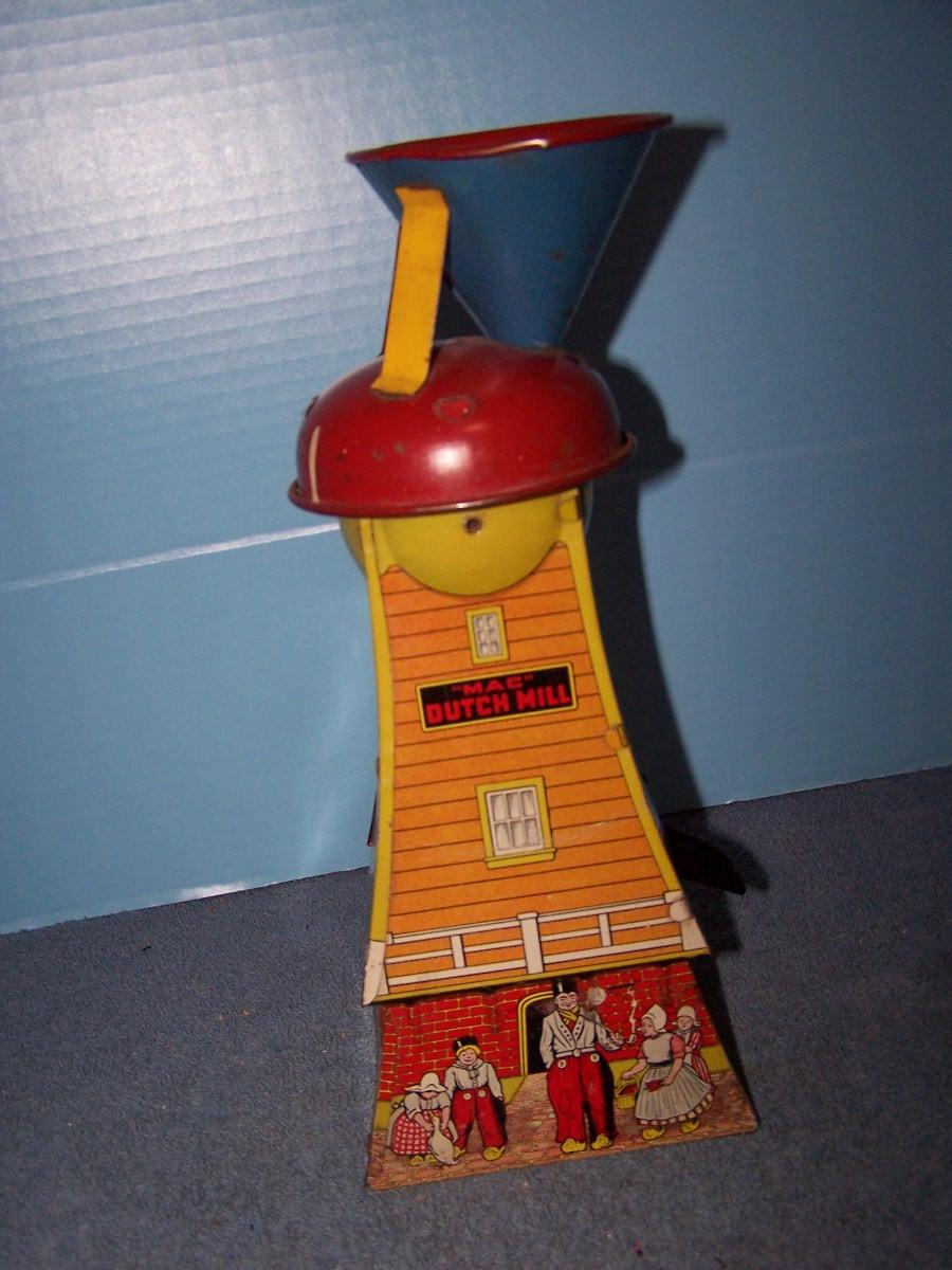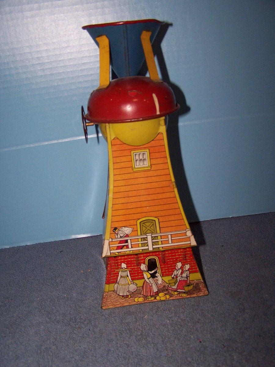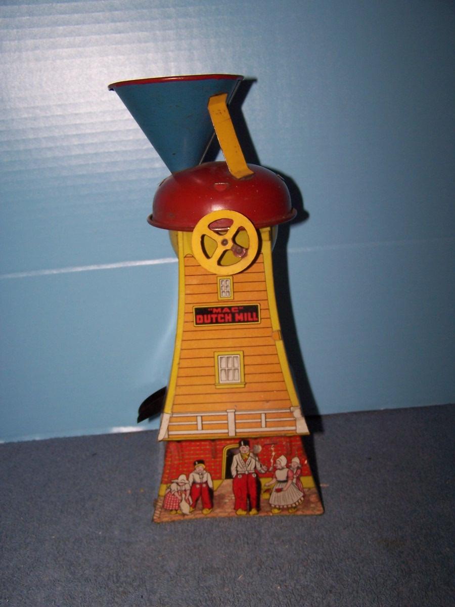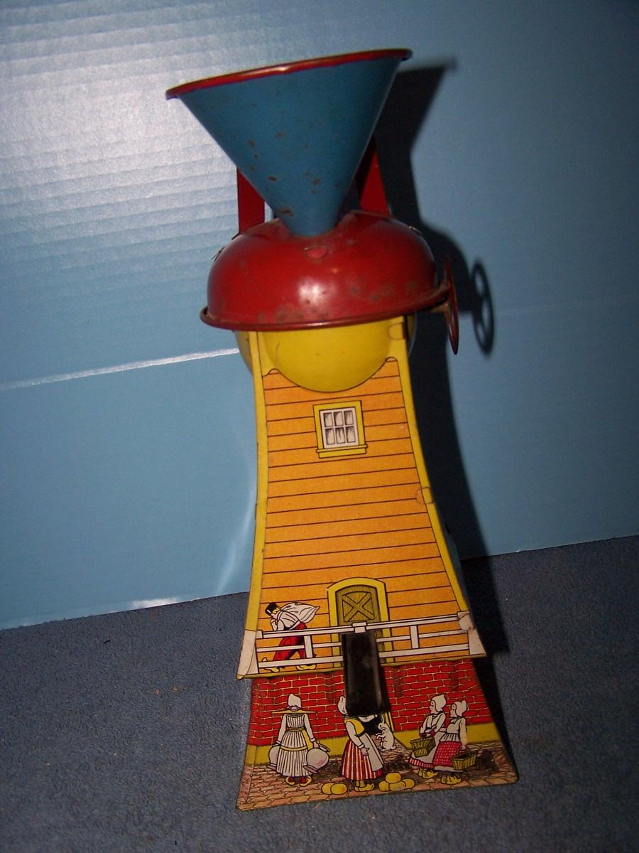 THIS IS A GREAT VINTAGE TIN LITHO DUTCH MILL SAND TOY! 12'' TALL.NOT COMPLETE.. ALL TOYS HAVE BEEN PLAYED WITH..