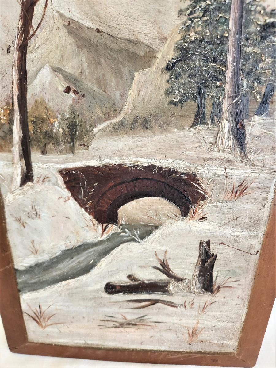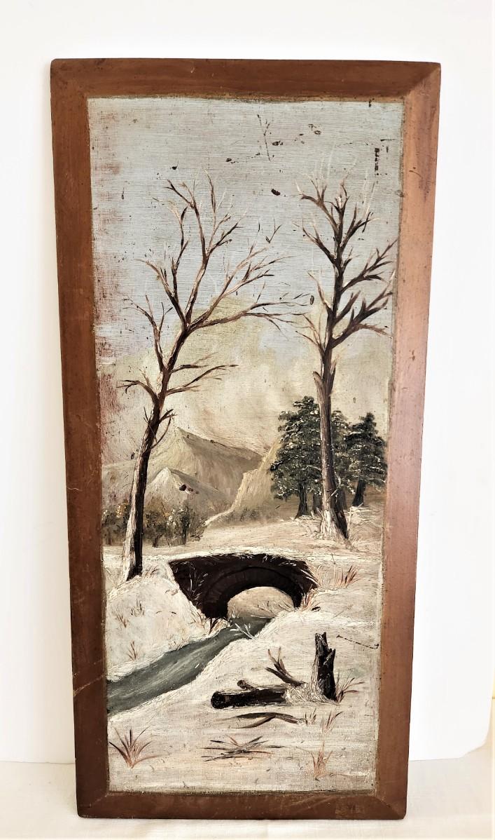 Sweet winter scene - oil on board - no signature. Vintage condition, 11.5" x 24" tall.