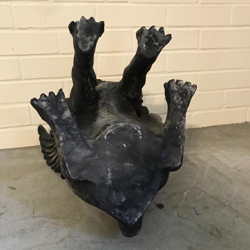 This medieval winged cat with ash hues complete with open wings and fangs will add a great gothic accent for your home. Standing approx. 13x17.5” Material is unknown but doesn’t appear to be as heavy as cement. No shipping.