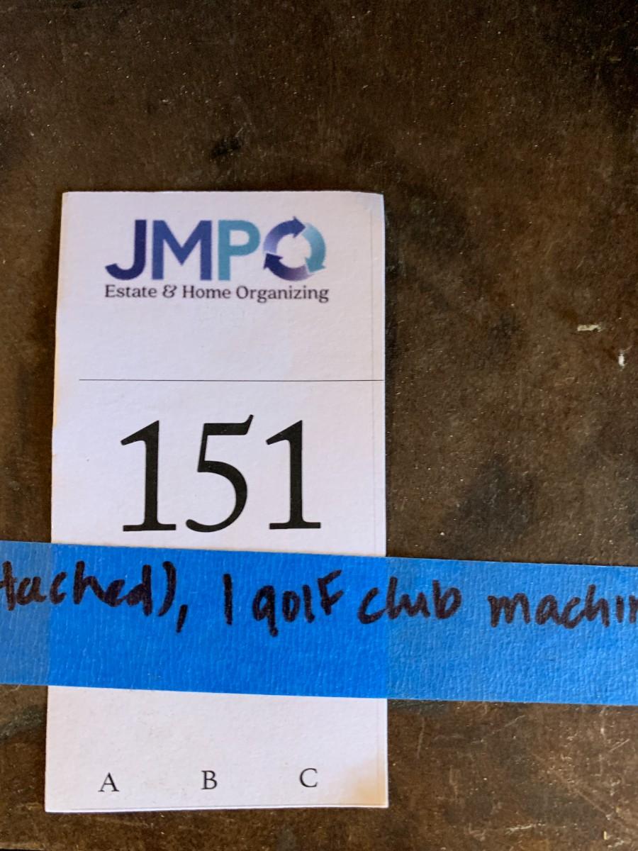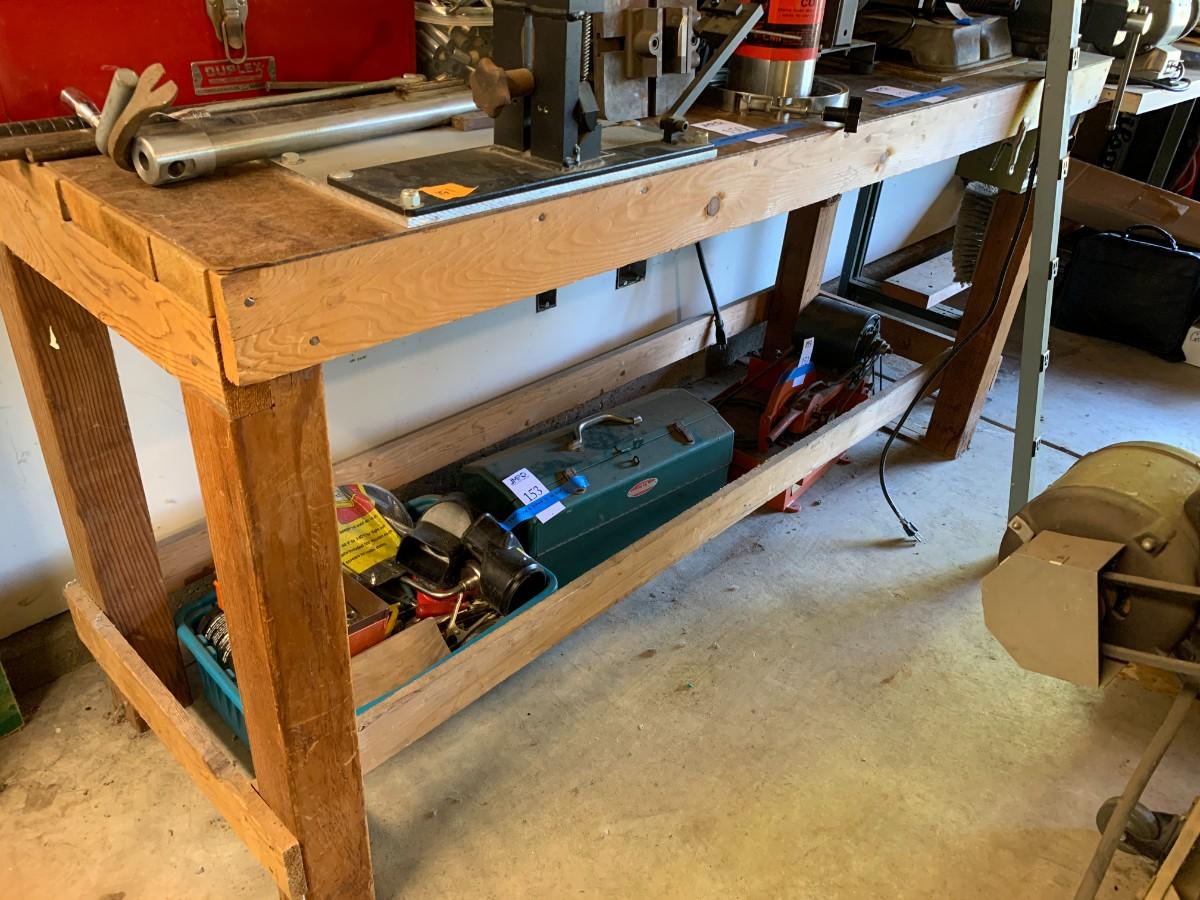 6ft work table. Includes vise, golf club machine. Does not include loose items on top or under table.