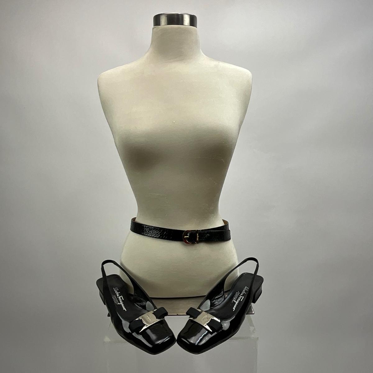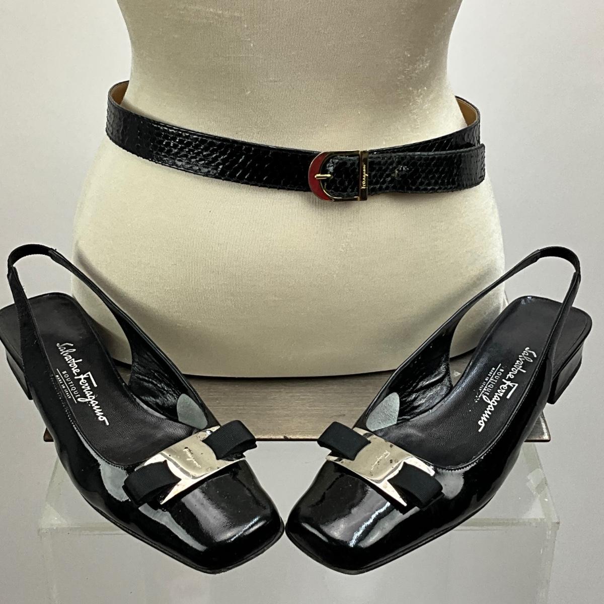 Lot 1513 Salvatore Ferragamo “ FLORIA “ patent leather sling back & Snakeskin belt