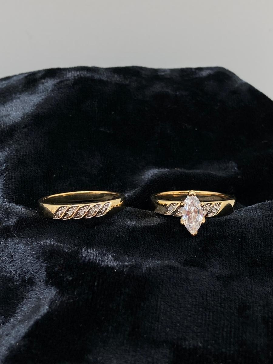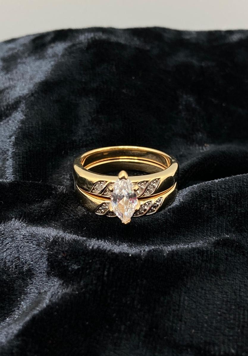 LOT 152: Sterling and Diamond Chip Wedding Ring Set - Marquis Solitaire Cubic Zirconia Sz 7