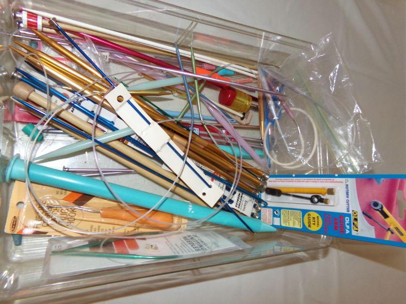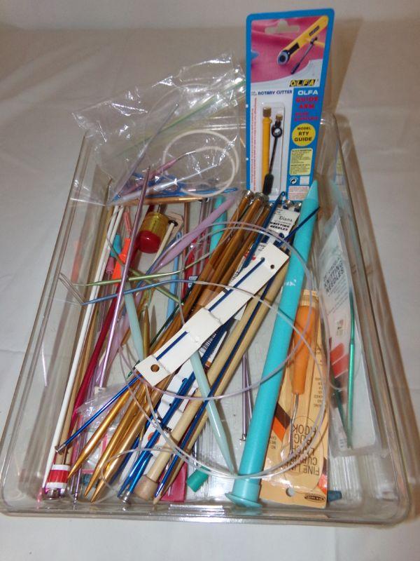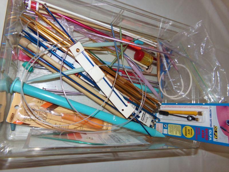 CONTAINER FULL OF VARIOUS KNITTING AND CROCHET NEEDLES