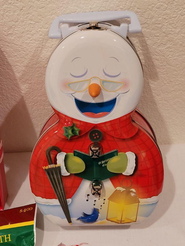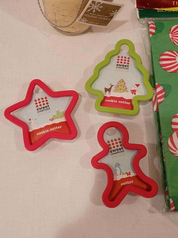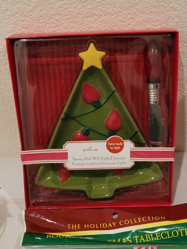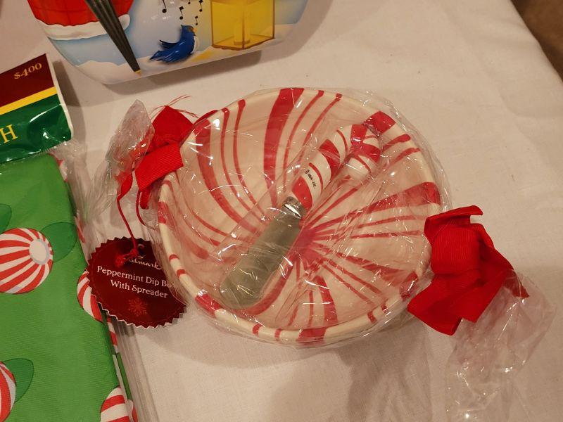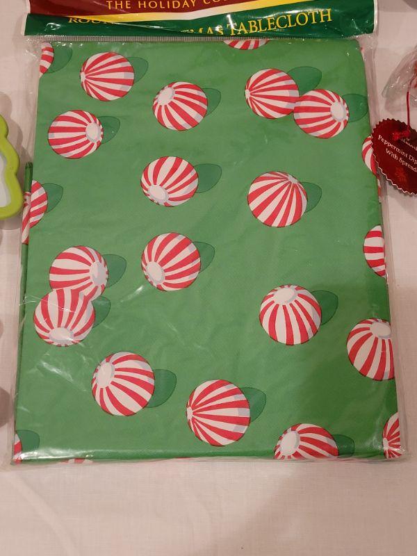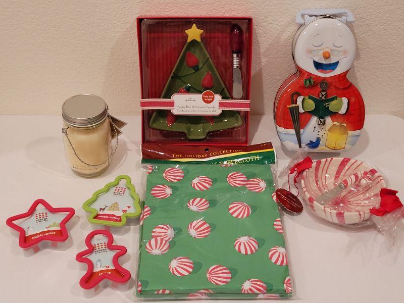 Lot 152: NEW Cookie Cutters, Tablecloth, Bowl & Plates with Spreaders, Snowman Tin and Holiday Candle