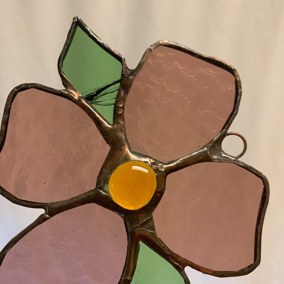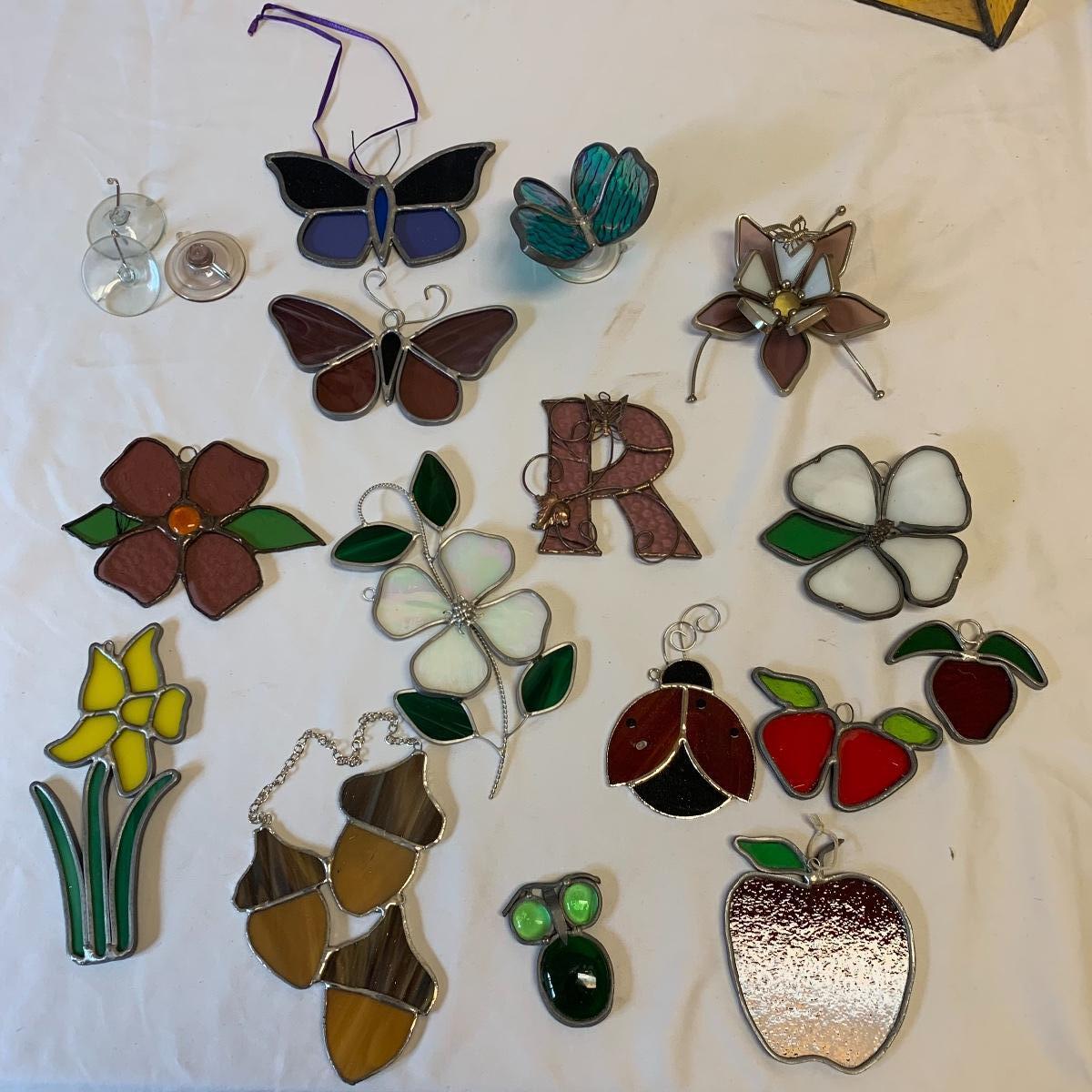 This lot includes a large selection of vintage and modern stained glass pieces along with several Amia painted panes. All are in great condition except one dogwood flower which has a cracked glass for one leaf. The two panel abstract piece stands 8.5” tall. If you are drawn to stained glass this lot will bring you joy and you will have lots of options for gifts as well. Shipping available.