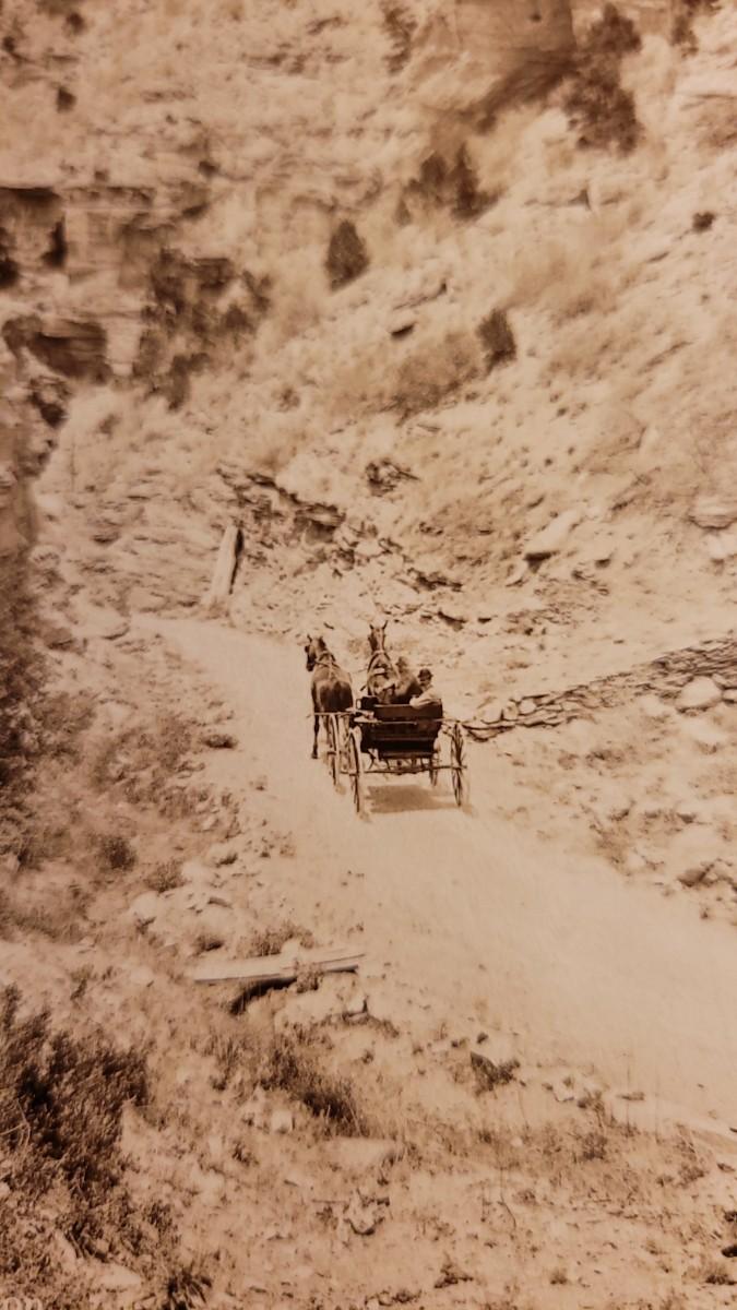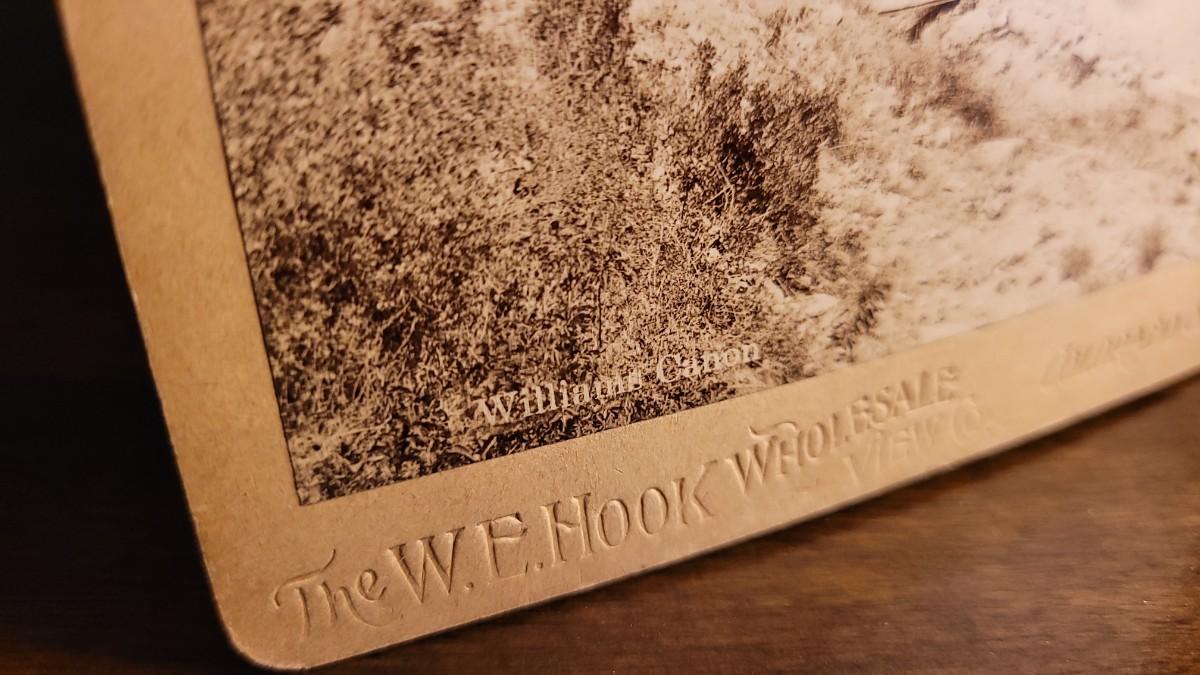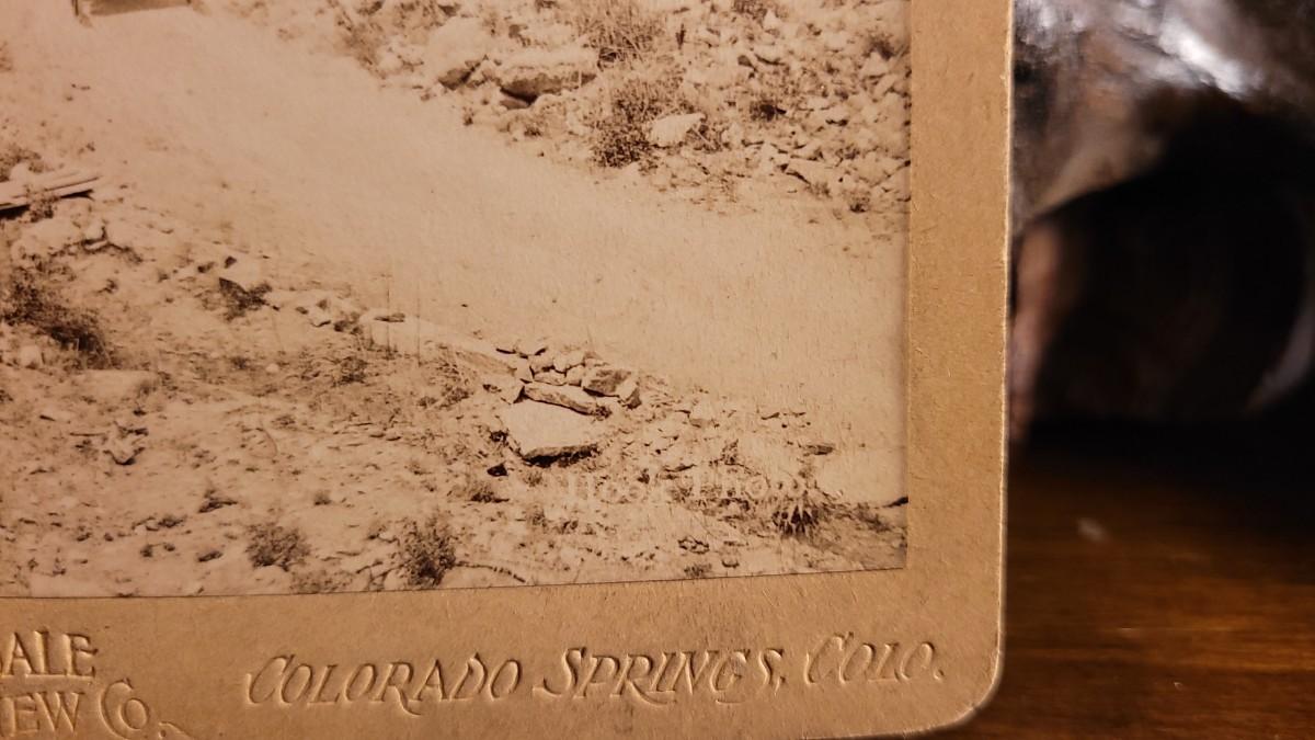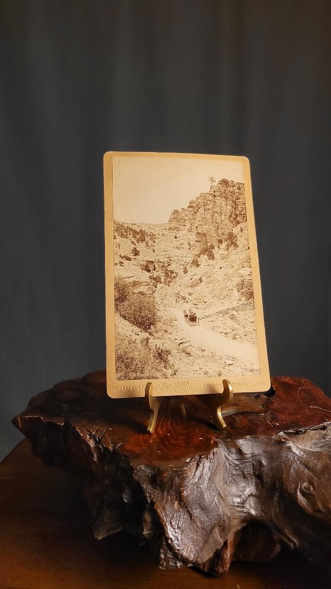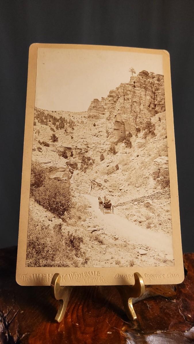 This large 8" x 5" Cabinet Photo brilliantly captures early Settlers traveling through a canyon carried by a buggy with an early two horsepower auto. Produced by The W.F. Hook Wholesale View out of Co Colorado Springs.